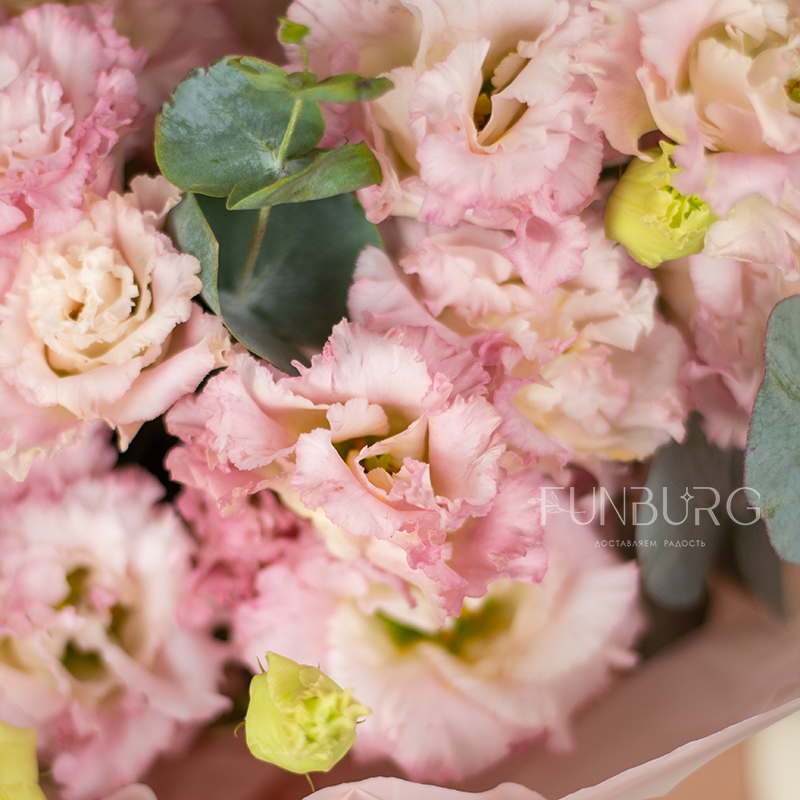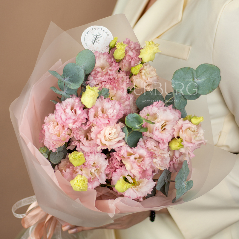 Нежный букет из воздушной сливочно-розовой эустомы, дополненной серебристым эвкалиптом, словно листьями мяты, и минималистичной невесомой полупрозрачной упаковкой в тон. Для любителей эустом и безупречной природной простоты.
