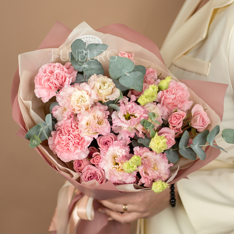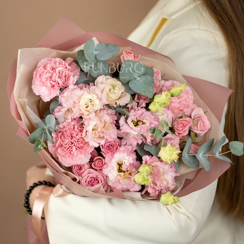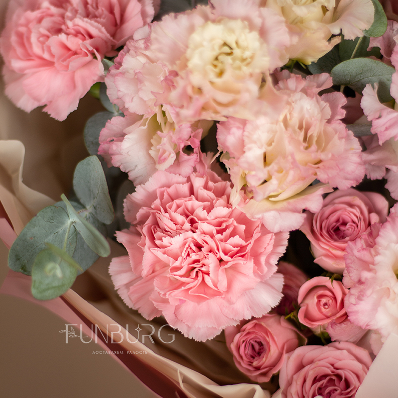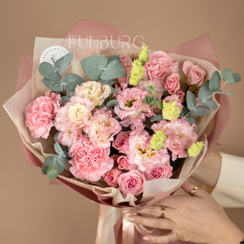 Нежный кружевной букет из румяно-розовых ажурных эустом, конфетных кустовых роз и диантусов, оттенённых веточками эвкалипта.