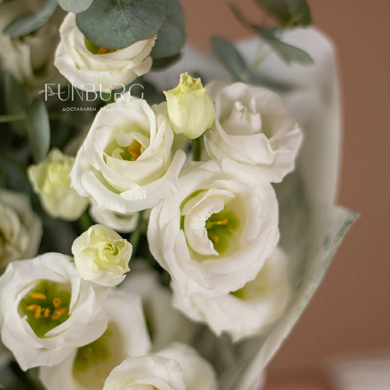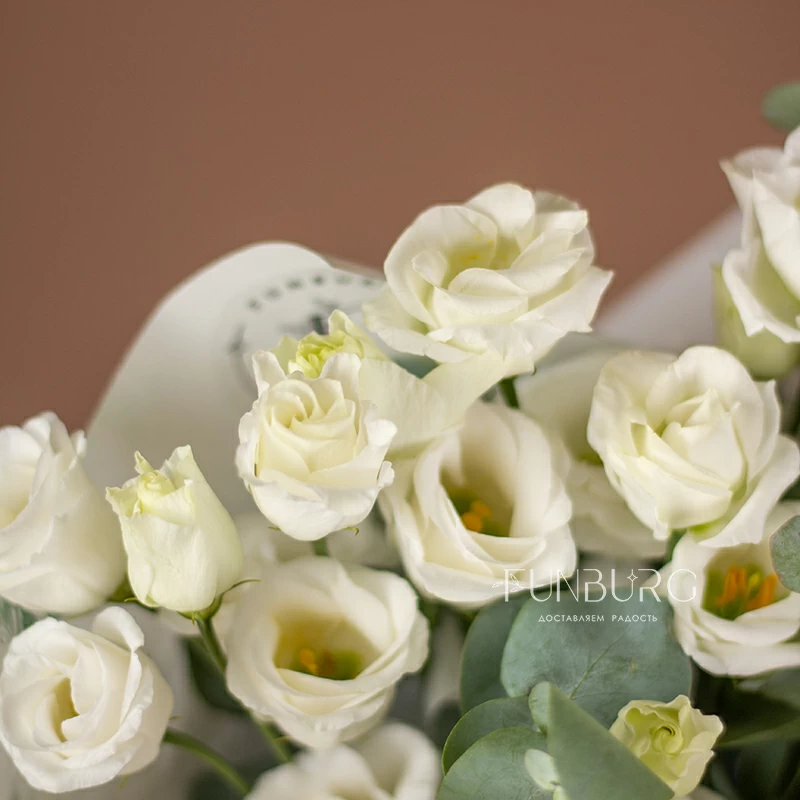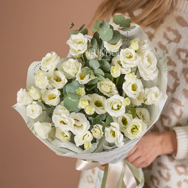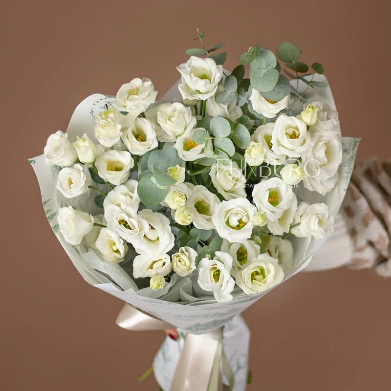 Нежный букет из воздушной белоснежной эустомы, деликатно дополненной серебристым эвкалиптом и минималистичной упаковкой в тон. Для любителей эустом и безупречной природной простоты.