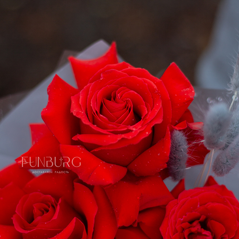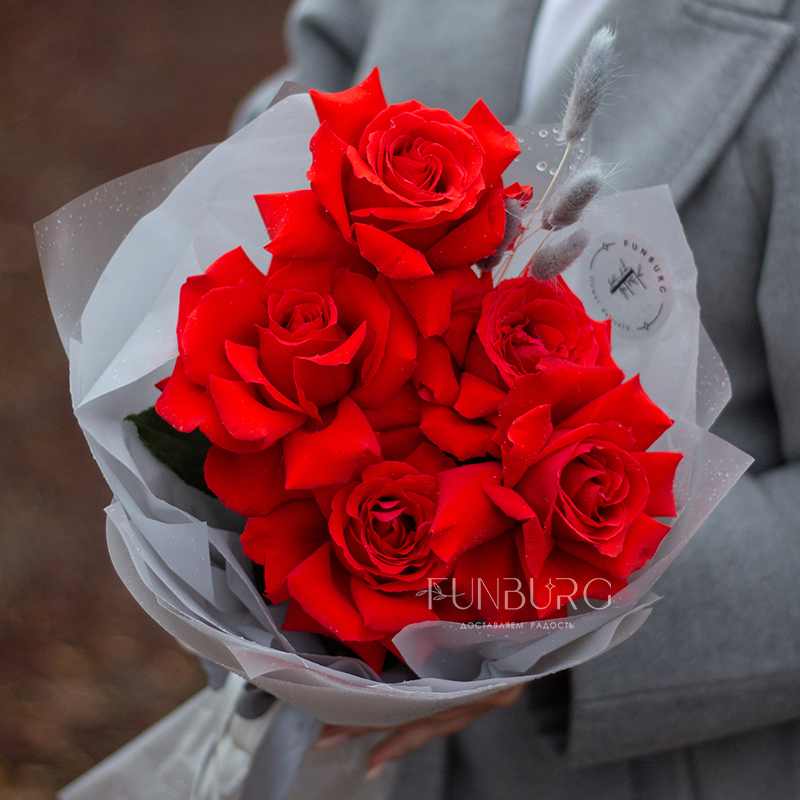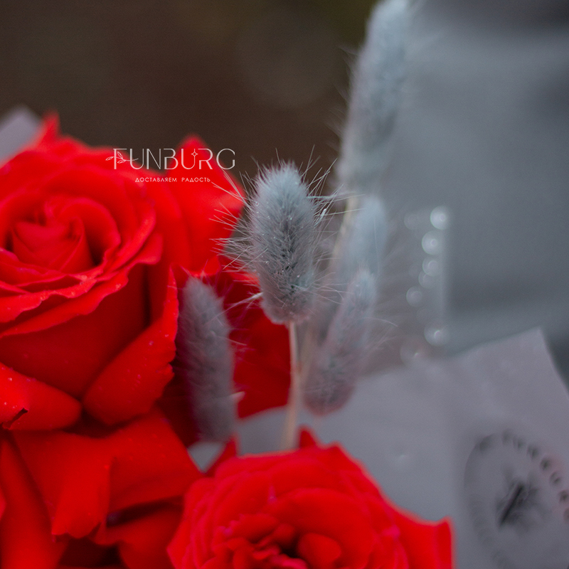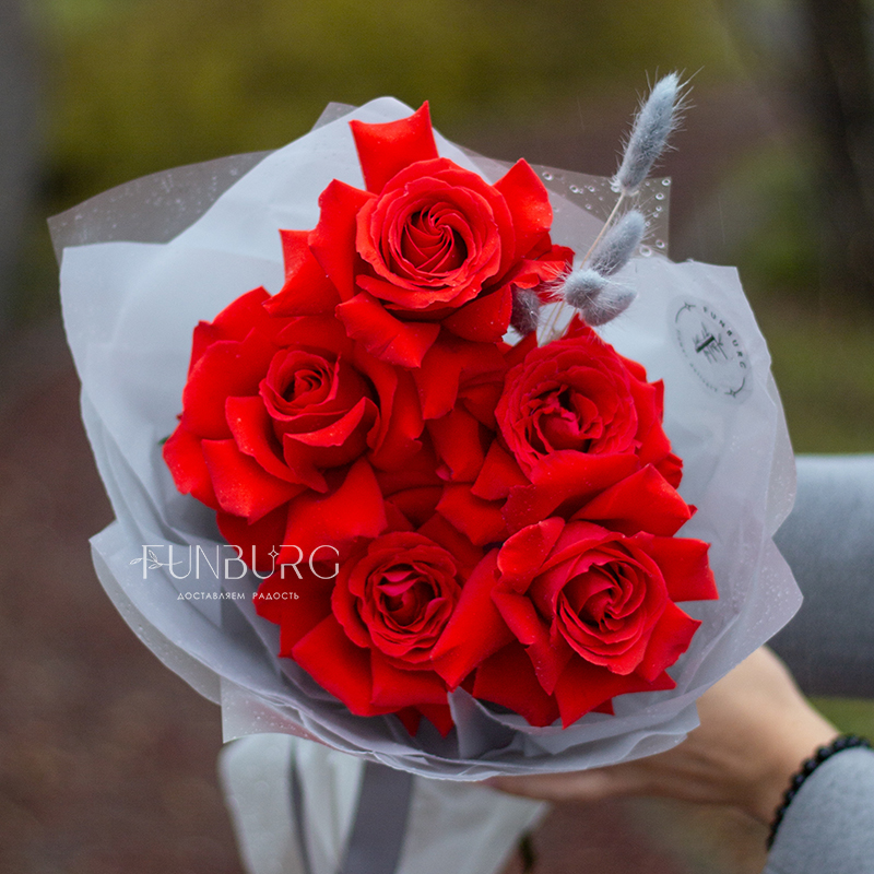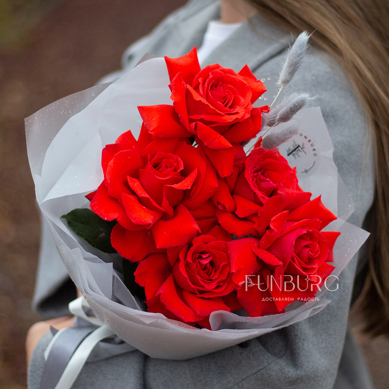 Небольшой, но очень эффектный букет из идеальных алых сортовые роз сорта Nina с крупными бутонами ярко-красного цвета, дополненных пушистыми серебристыми веточками лагуруса в оттеняющей цветы упаковке. Идеальный букет, чтобы удивить и порадовать самого дорогого человека!