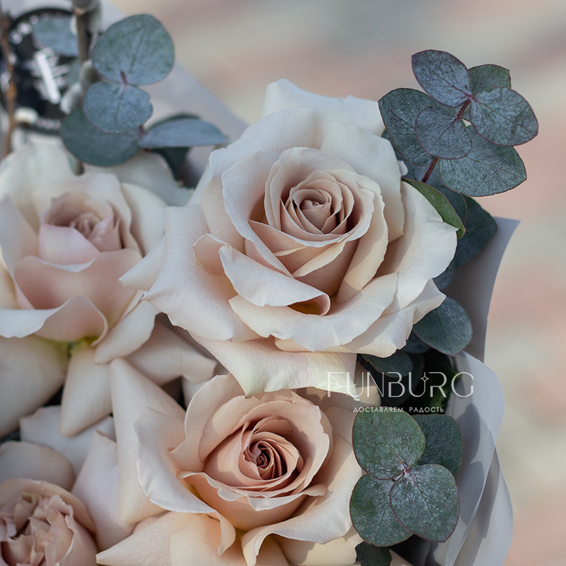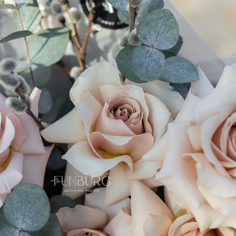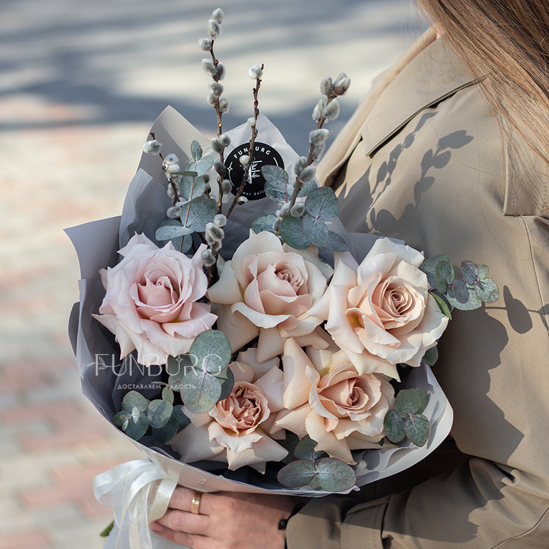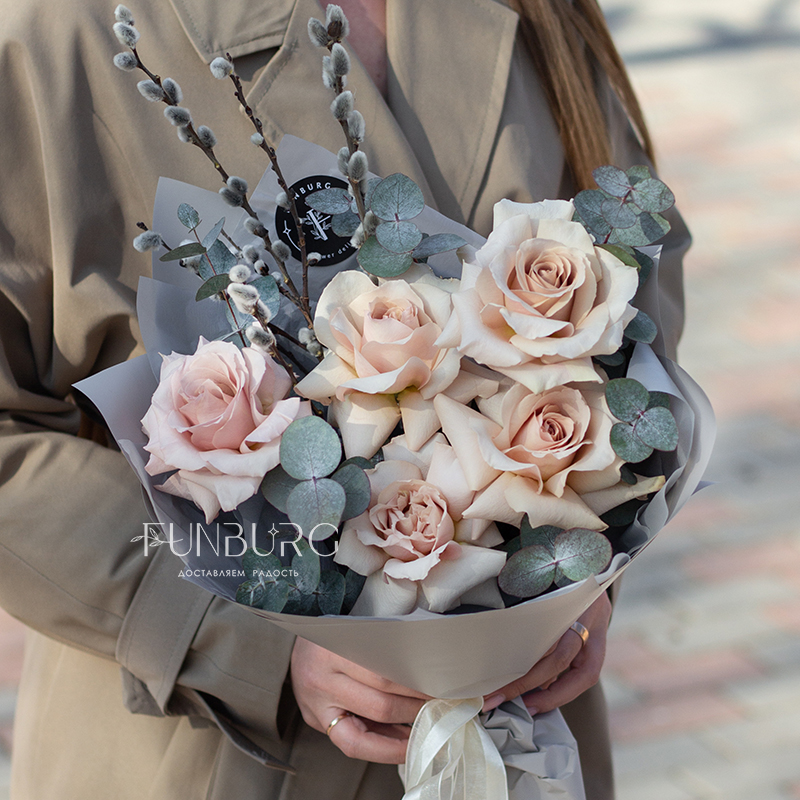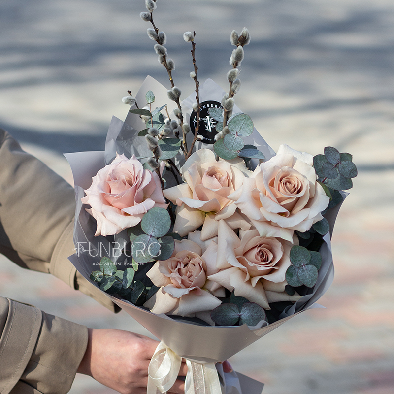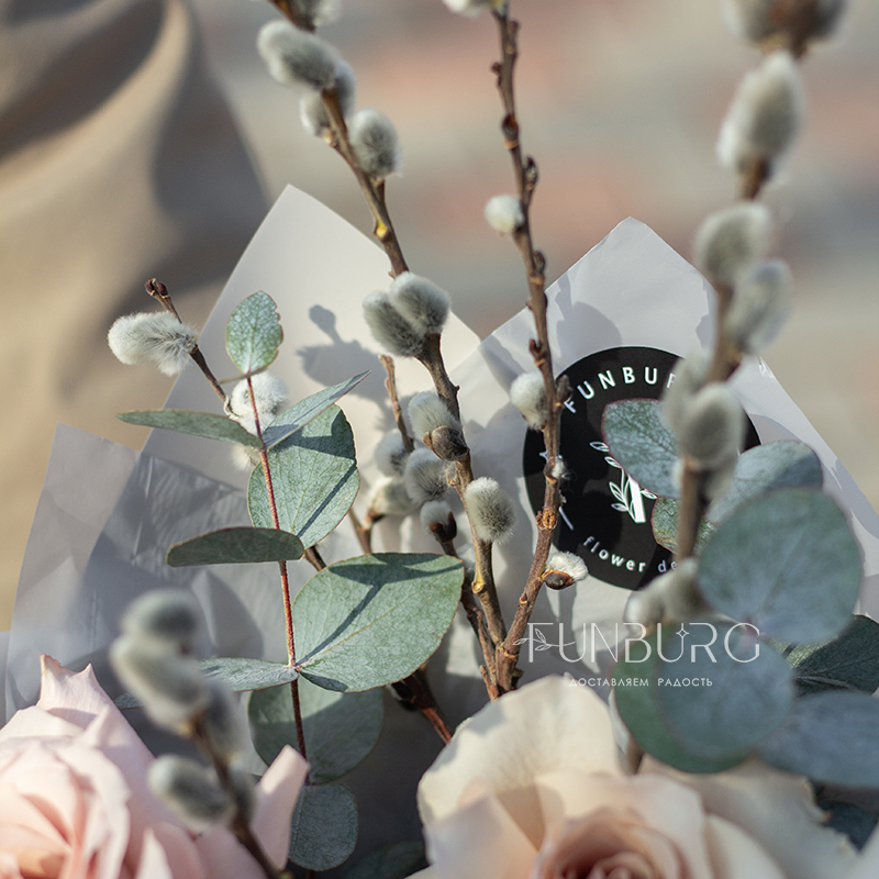 Небольшой букет из утонченных кремовых французских роз сорта Quicksand с крупными ажурными бутонами, дополненных серебристым эвкалиптом и веточками пушистой вербы. Идеальный букет для нежных весенних сюрпризов!