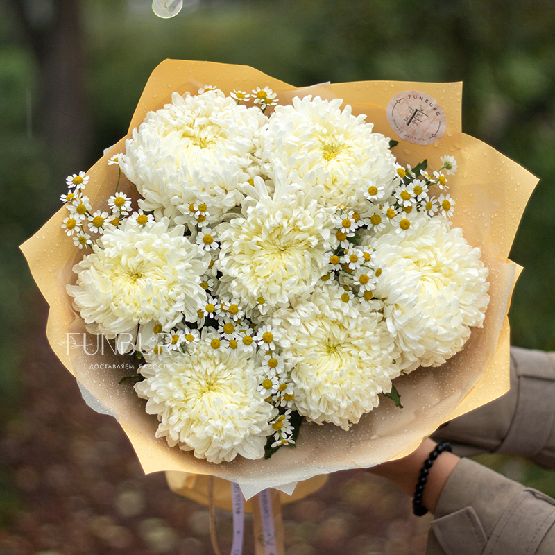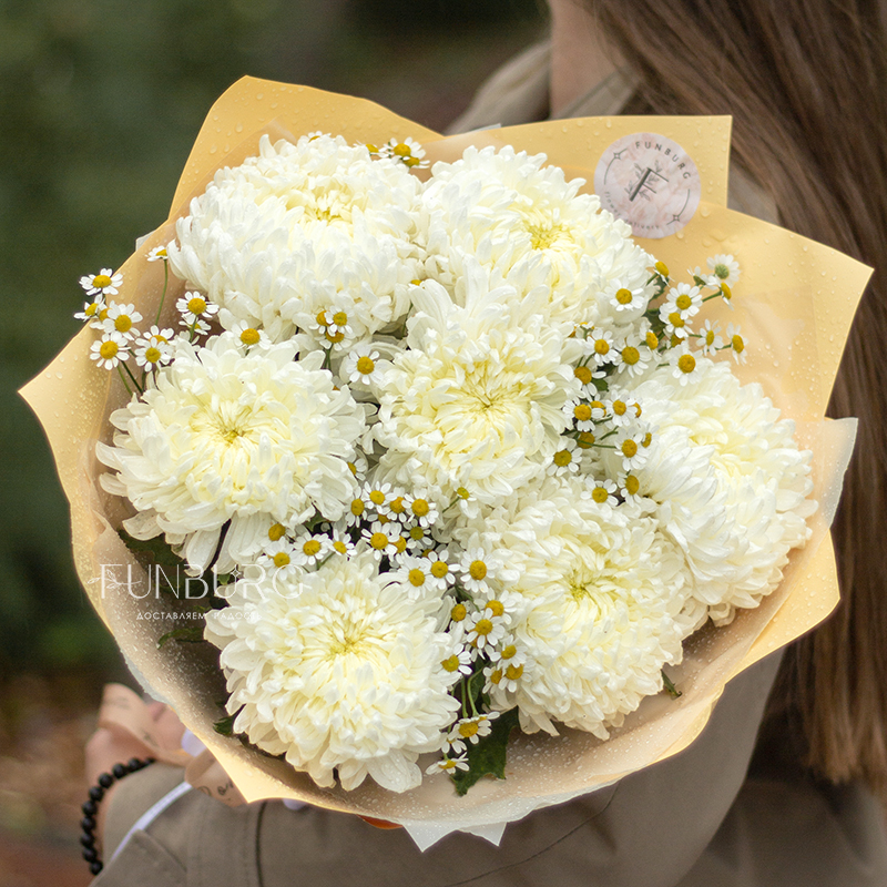 Нежнейший дуобукет из роскошных сливочных хризантем и трогательных ромашек. Просто и безупречно красиво.