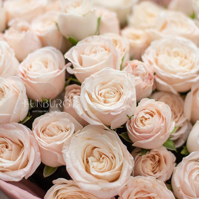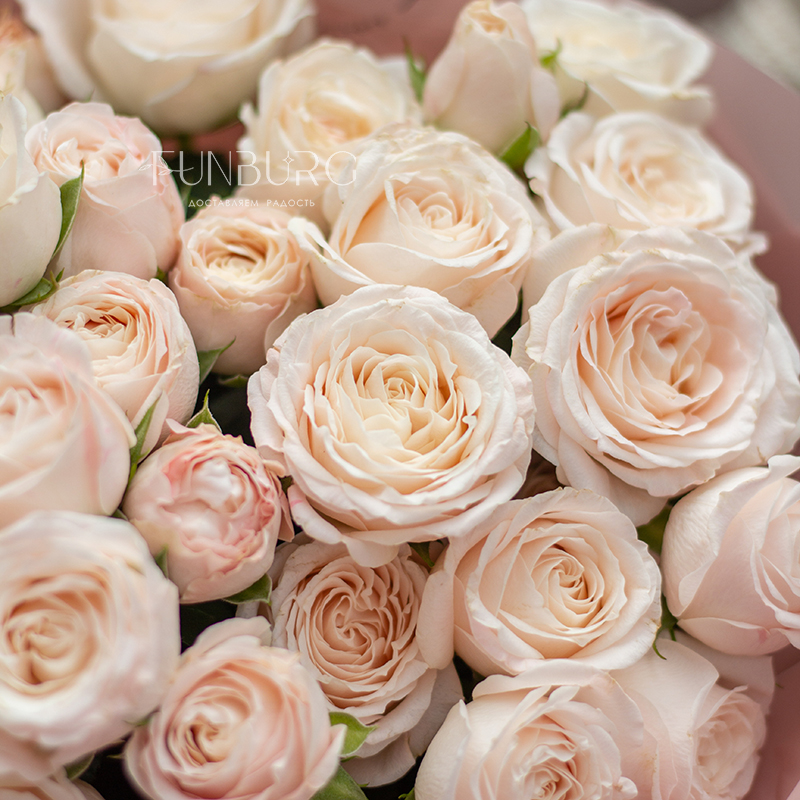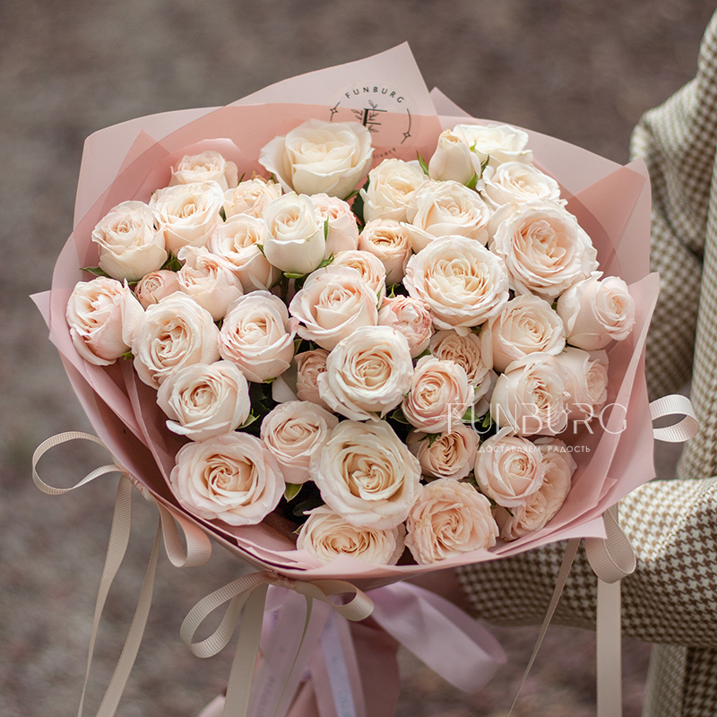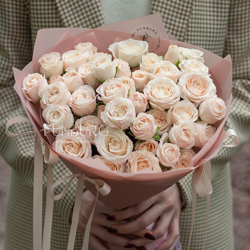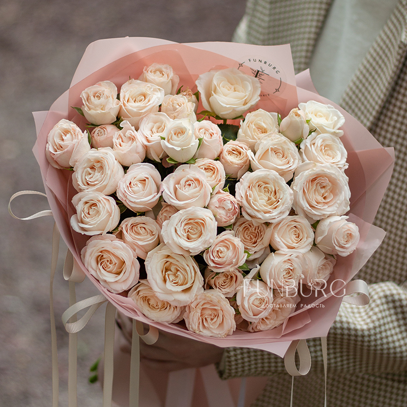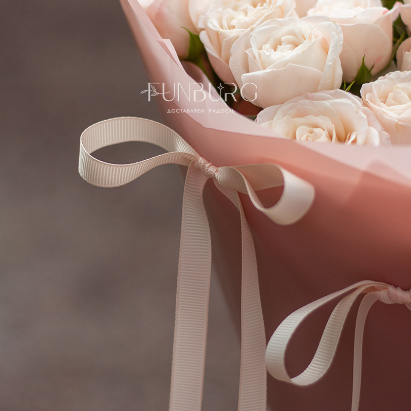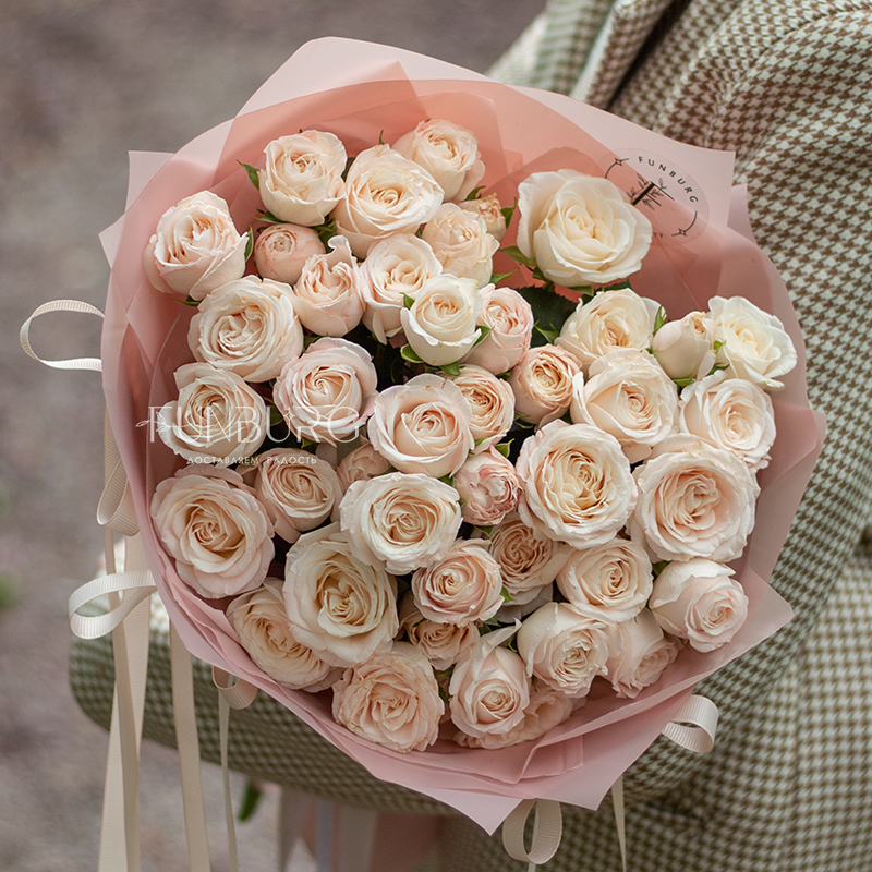 Очаровательный букет из кустовых пионовидных роз Bombastic мягких пудрово-сливочных оттенков в воздушной упаковке, декорированной милыми бантиками.