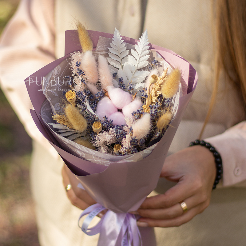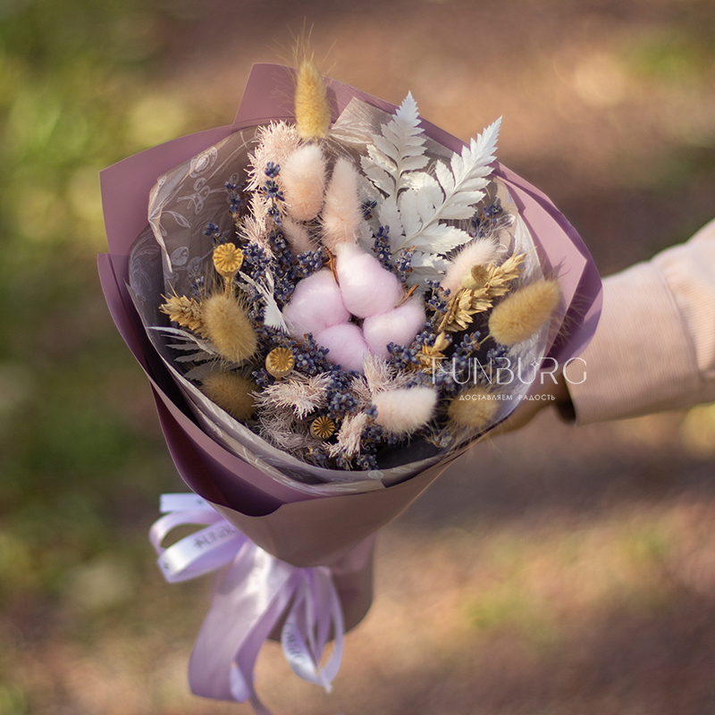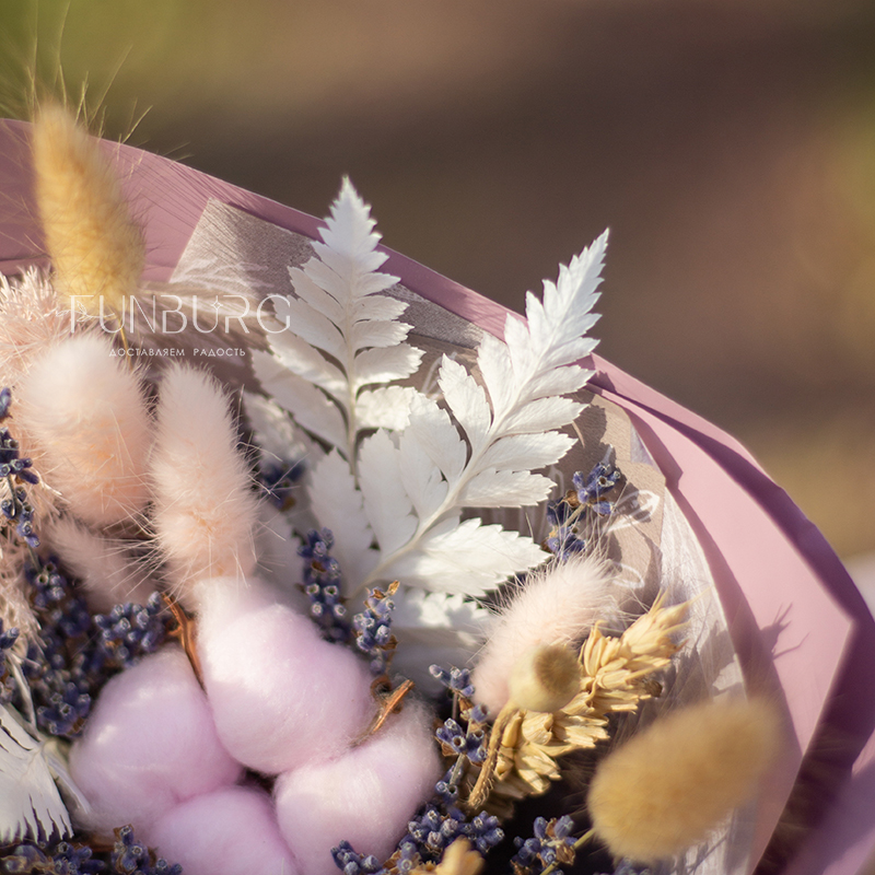 Гармоничное сочетание контрастных текстур и форм: мягкость и воздушность облачков хлопка, сиреневые веточки ароматной лаванды, пушистые хвостики лагуруса и пшеницы, невесомые веточки аспарагуса, пшеница и лаванда, окутывающая своим волшебным успокаивающим ароматом.