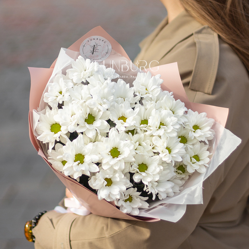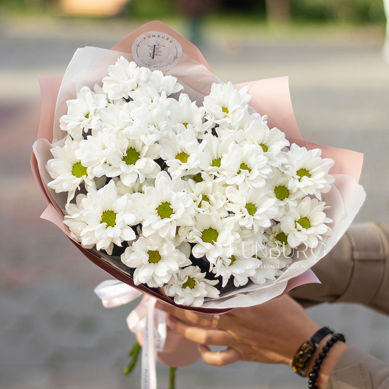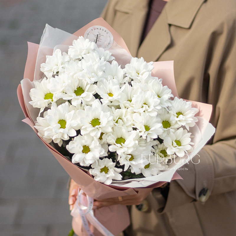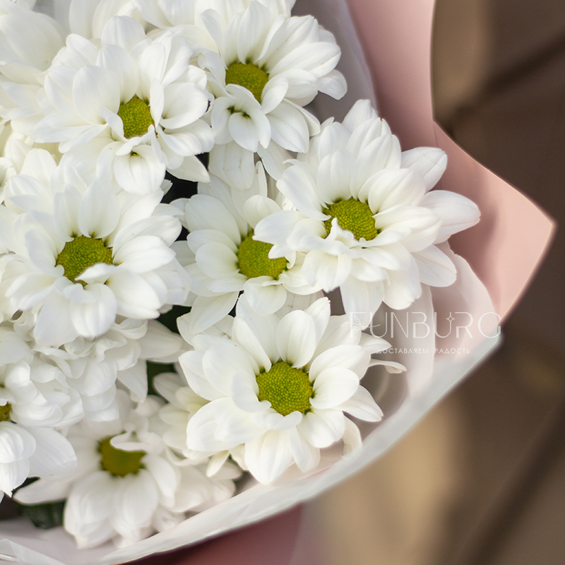 Воздушный букет из белых ромашковых кустовых хризантем в нежной упаковке, подчеркивающей их безупречную простоту и красоту, идеален для подарка любителям хризантем, и когда хочется, чтобы цветы радовали долго-долго! Просто безупречно красиво!
