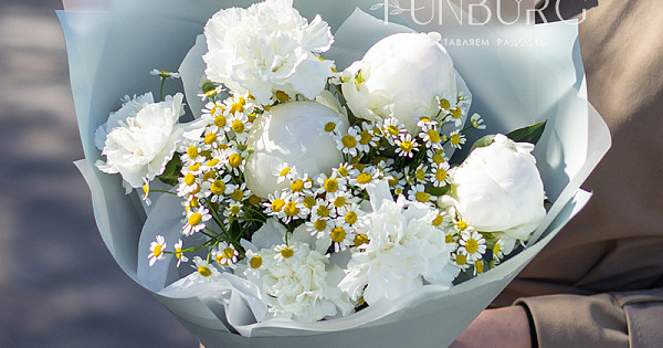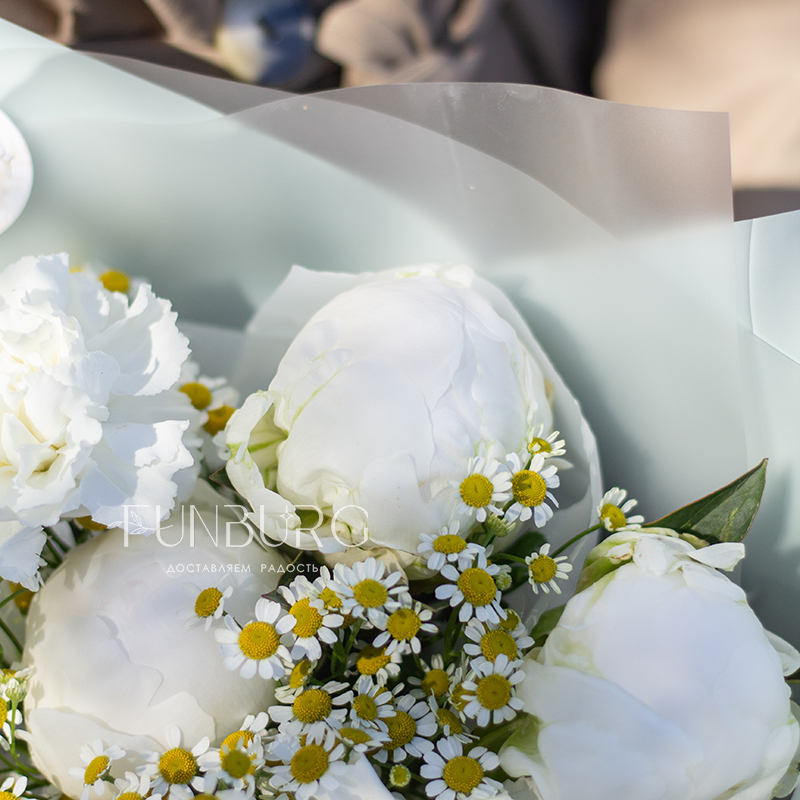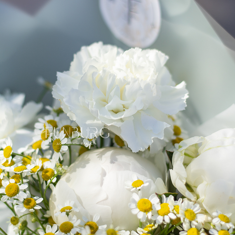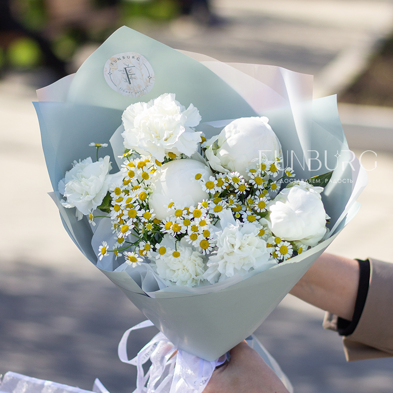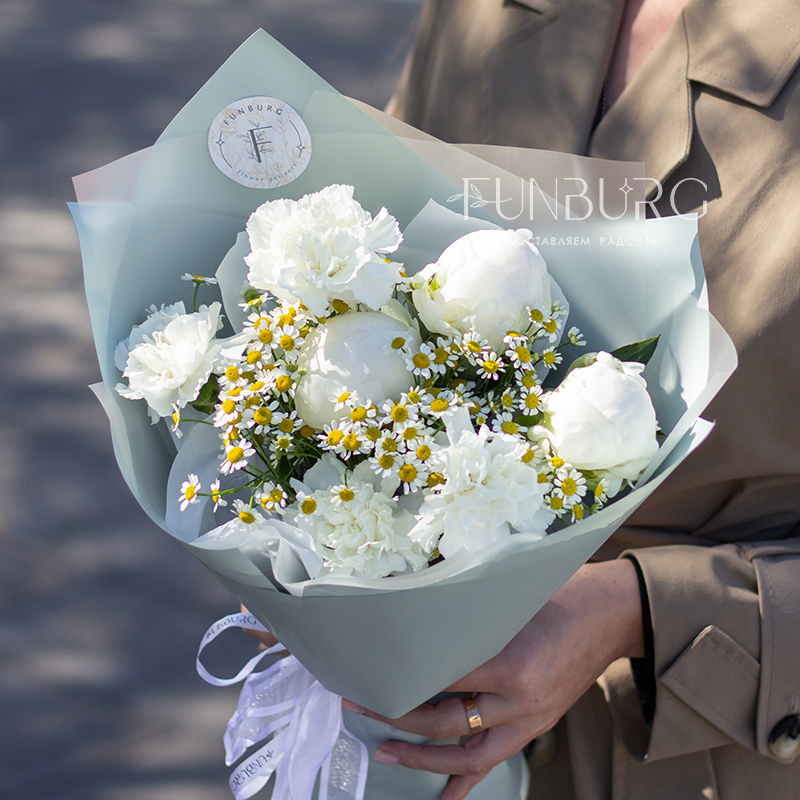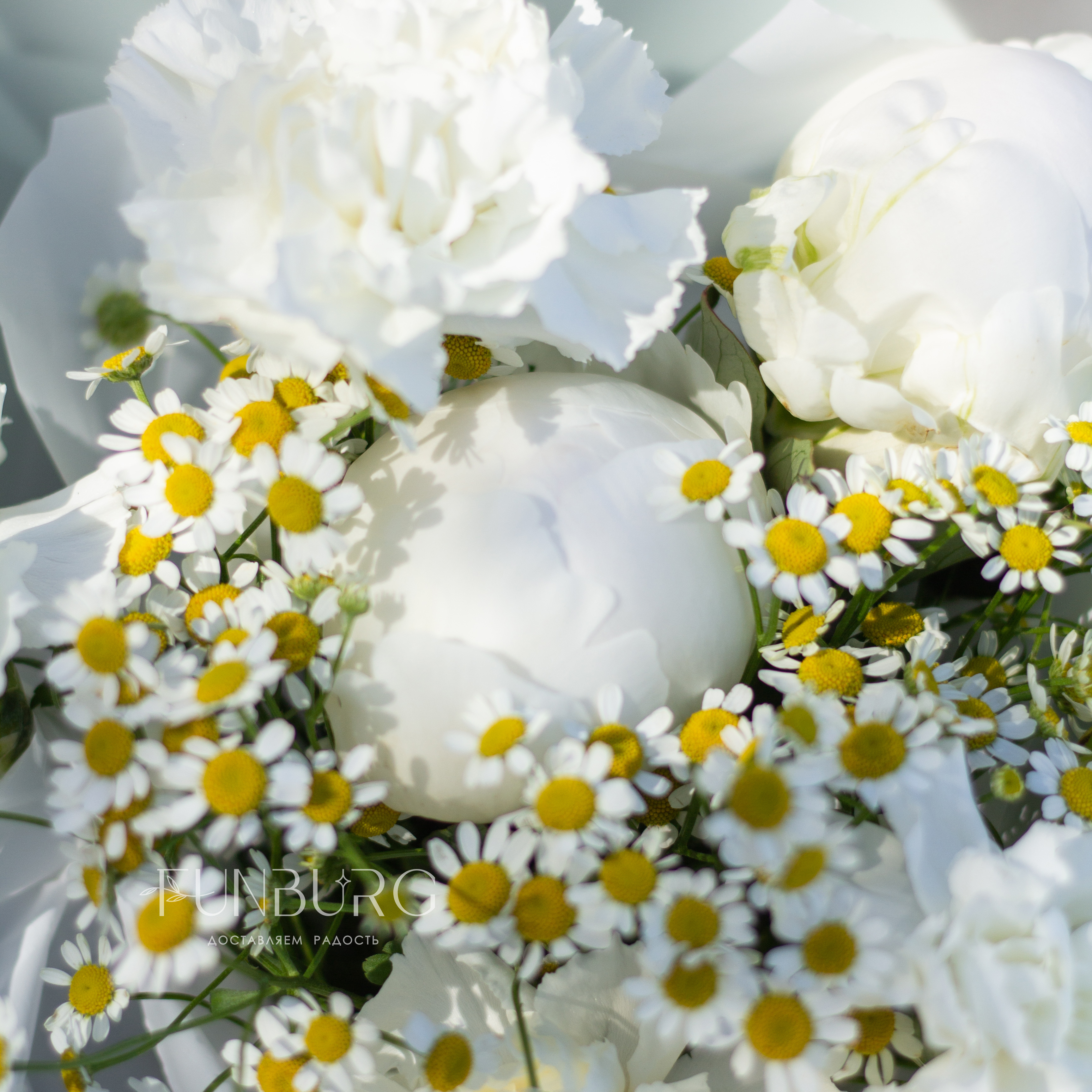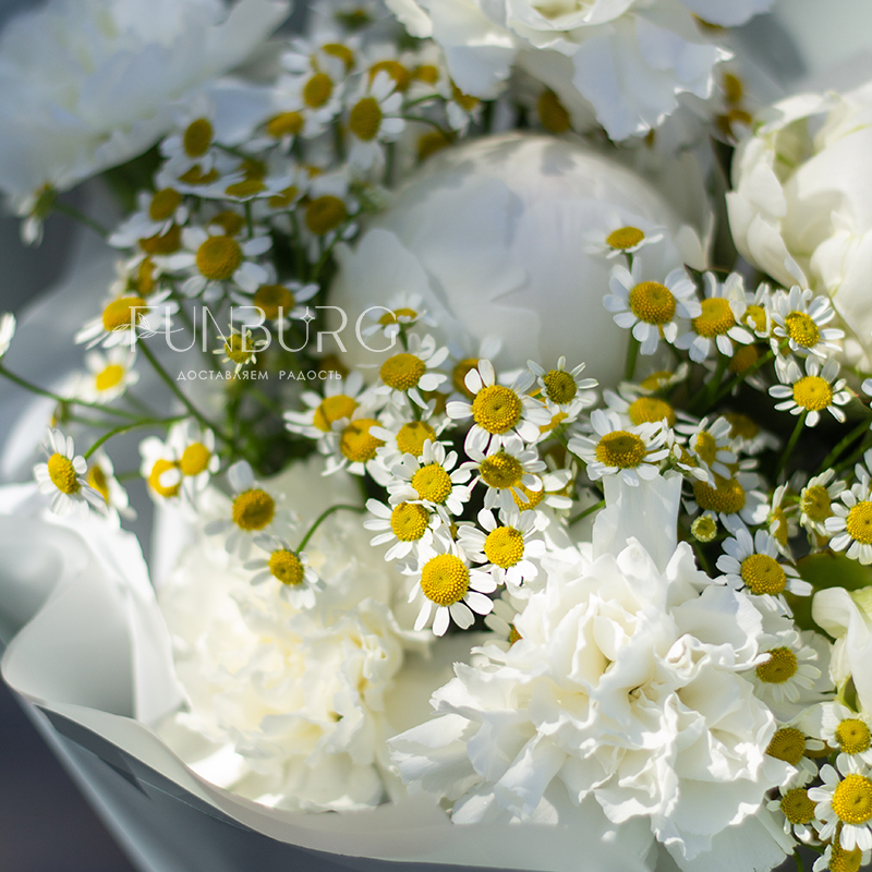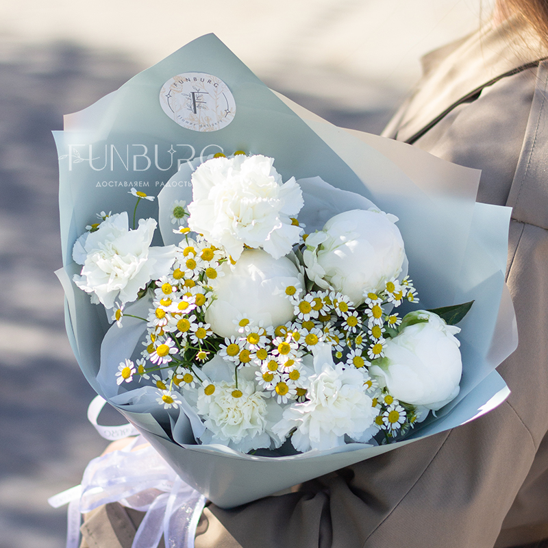 Нежный и освежающий своей белоснежностью букет из пионов, кружевных диантусов и очаровательных ромашек. Идеальный летний цветочный подарок!