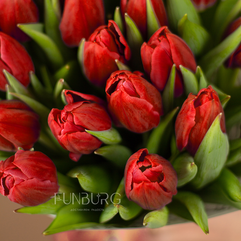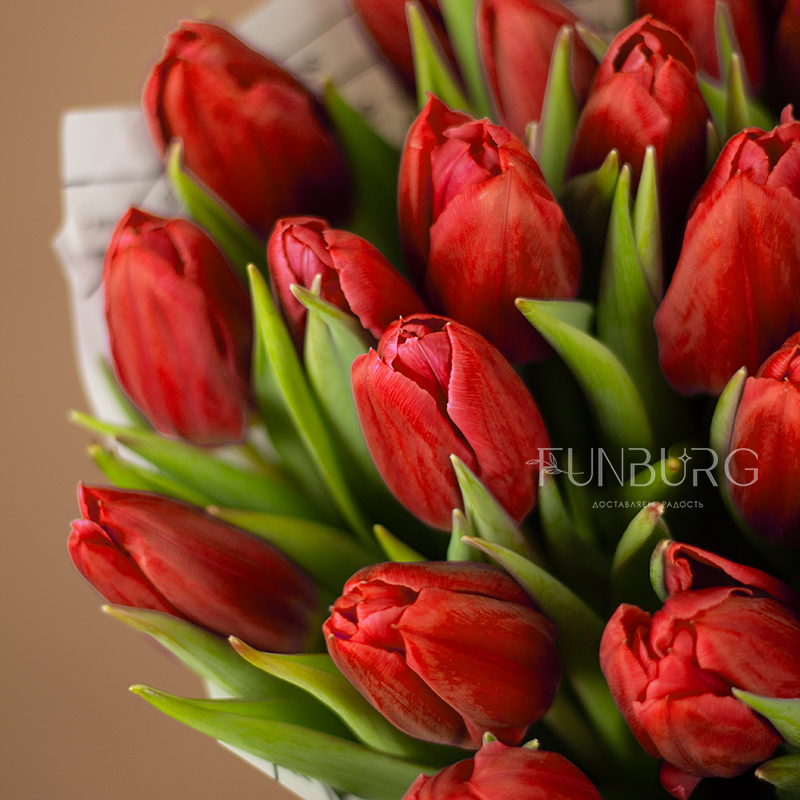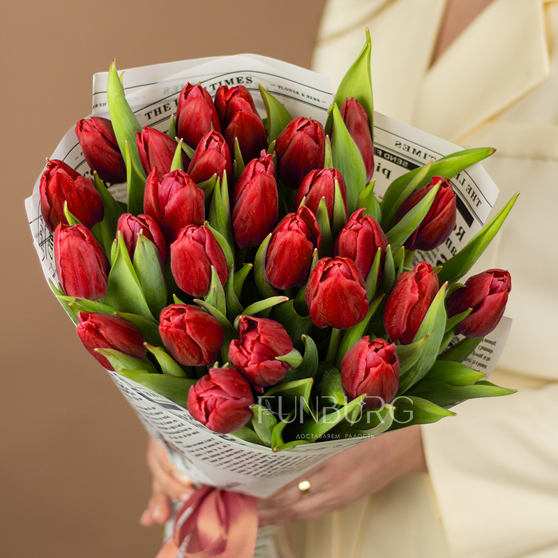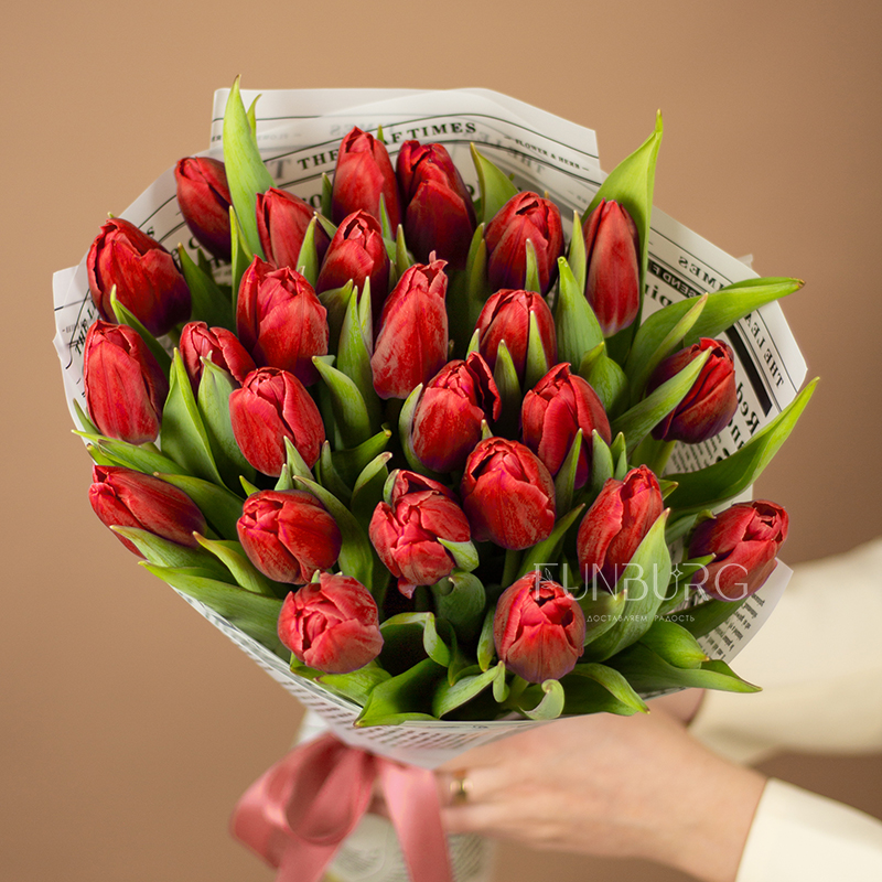 Букет из тюльпанов красивого насыщенного красного оттенка в контрастной белой упаковке с принтом с цветочными вестями для идеальных весенних сюрпризов!