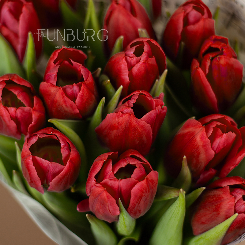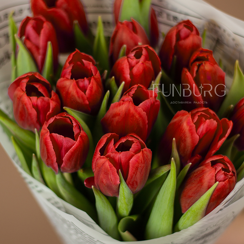 Букет из тюльпанов красивого насыщенного красного оттенка в контрастной белой упаковке с принтом с цветочными вестями для идеальных весенних сюрпризов!