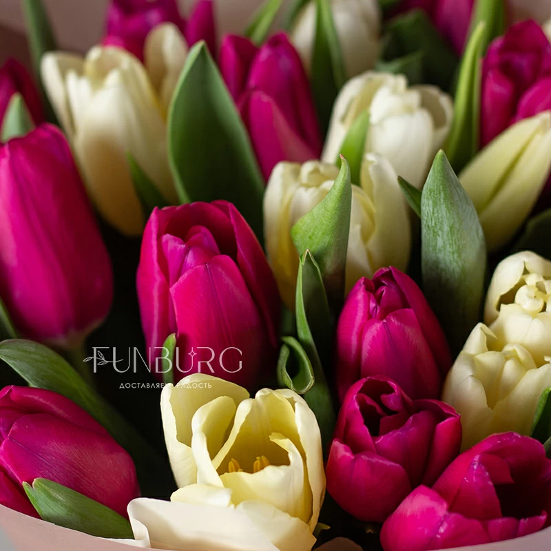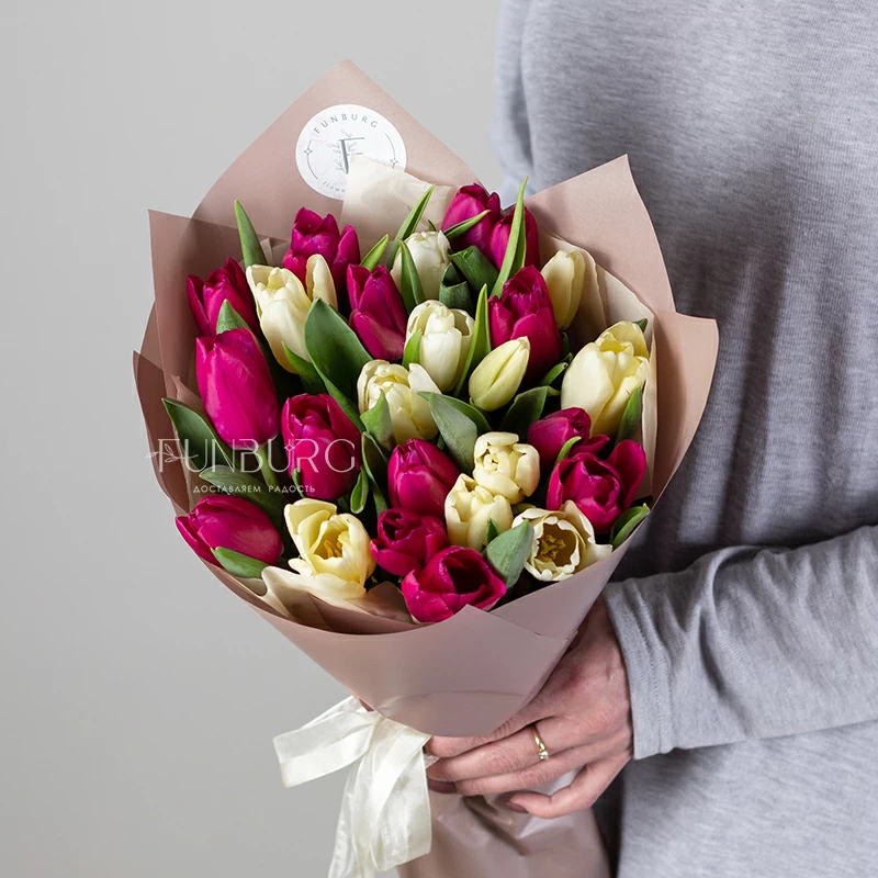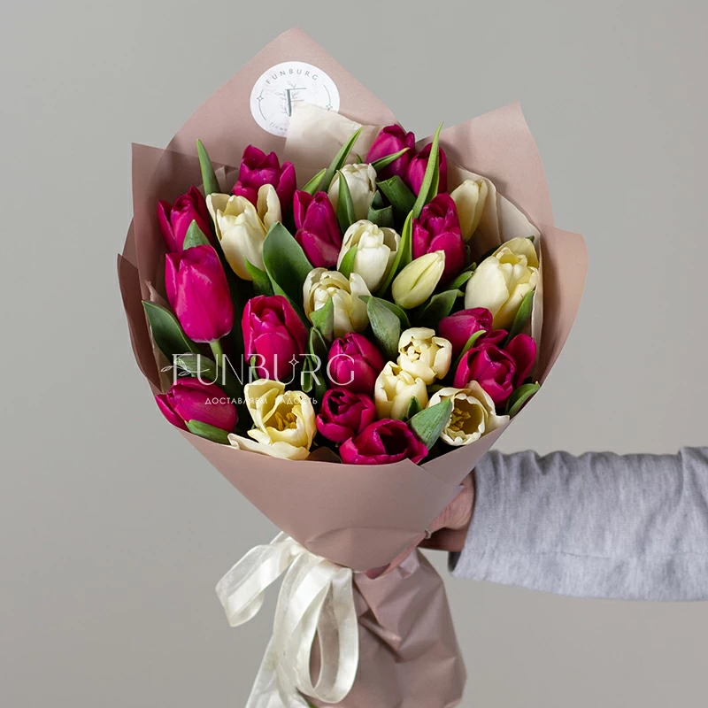Букет из пурпурных и бело-кремовых тюльпанов пудровой матовой упаковке для идеальных весенних сюрпризов!