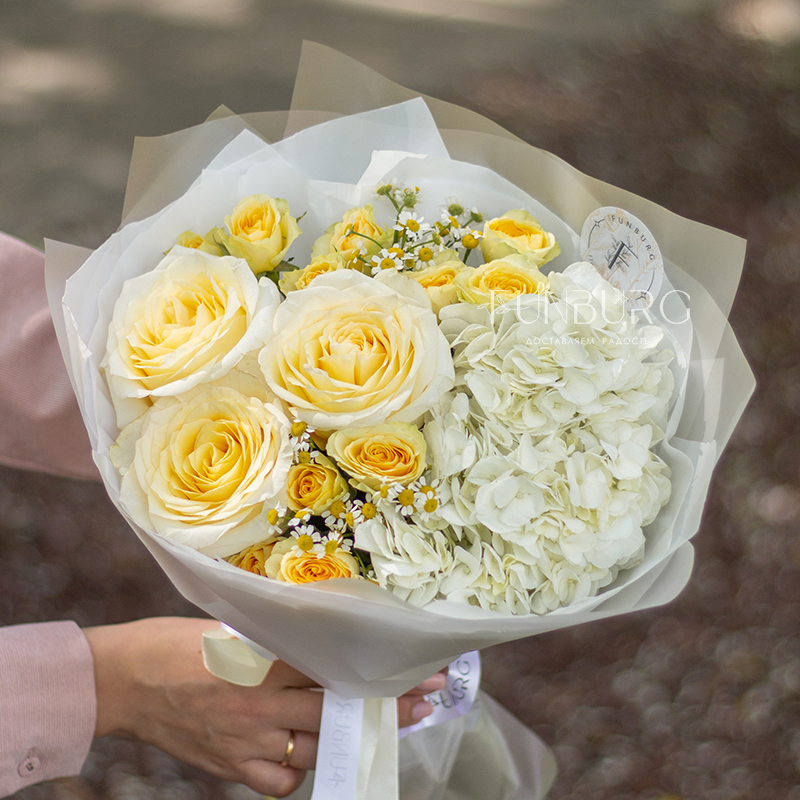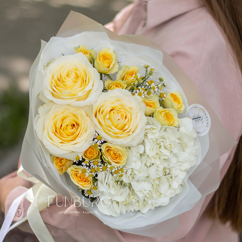 Мягкие сливочно-лимонные оттенки, воздушные лепестки гортензии, мягкие волны бесподобных роз Candlelight (они еще удивят вас красотой раскрытия крупных ароматных бутонов!) и очаровательные ромашки. Этот букет создан дарить радость и тепло самых искренних чувств.