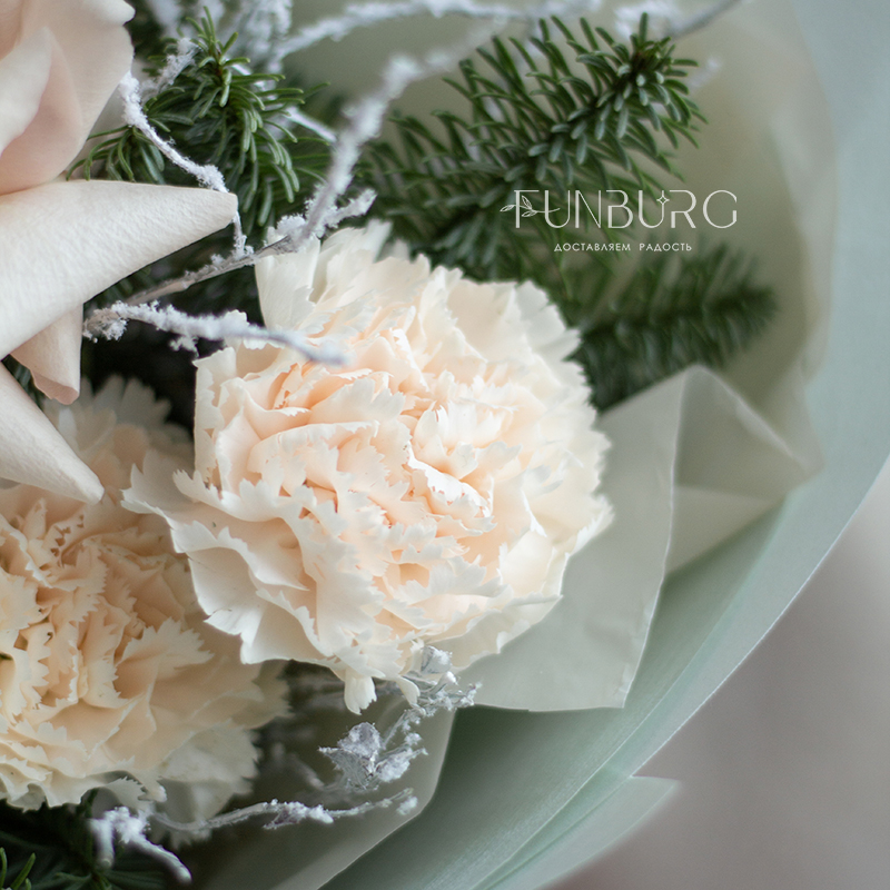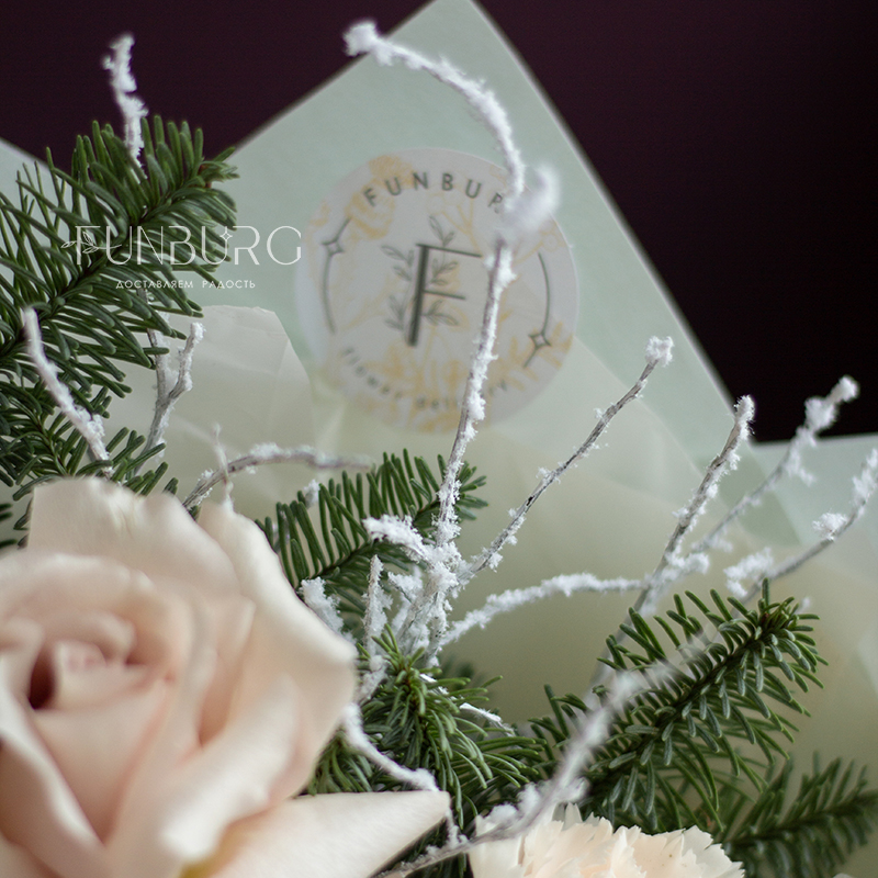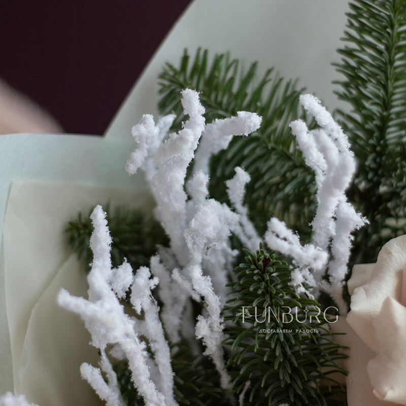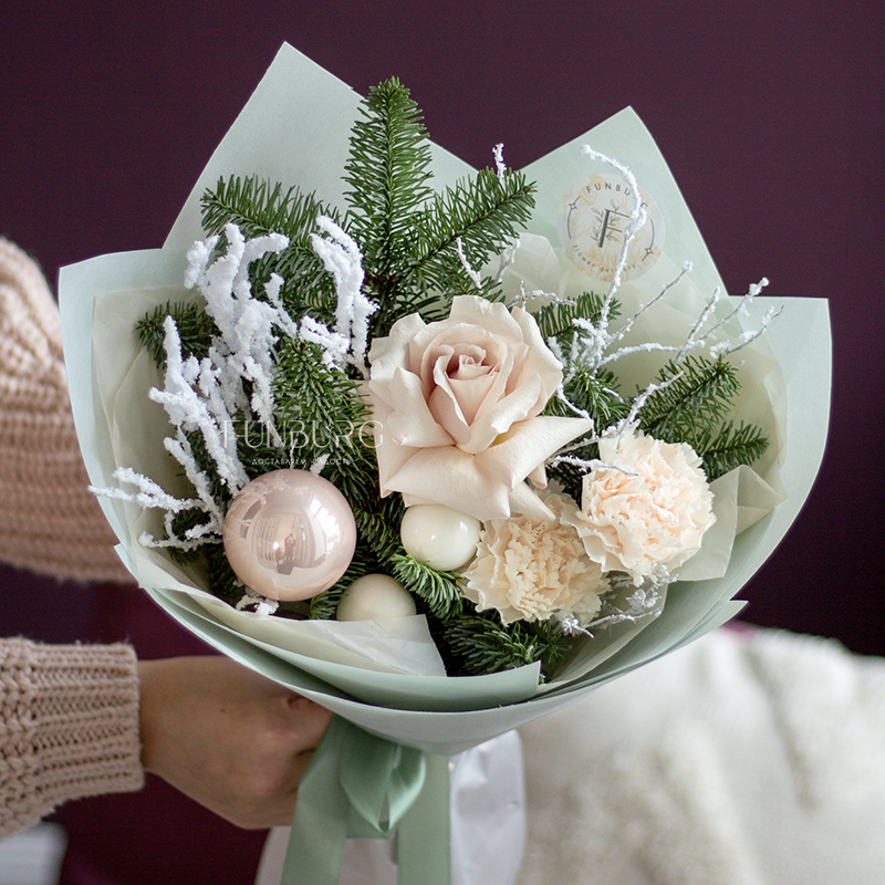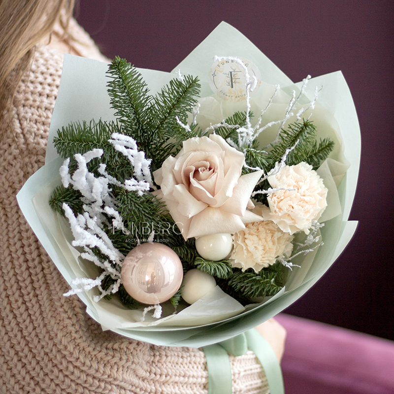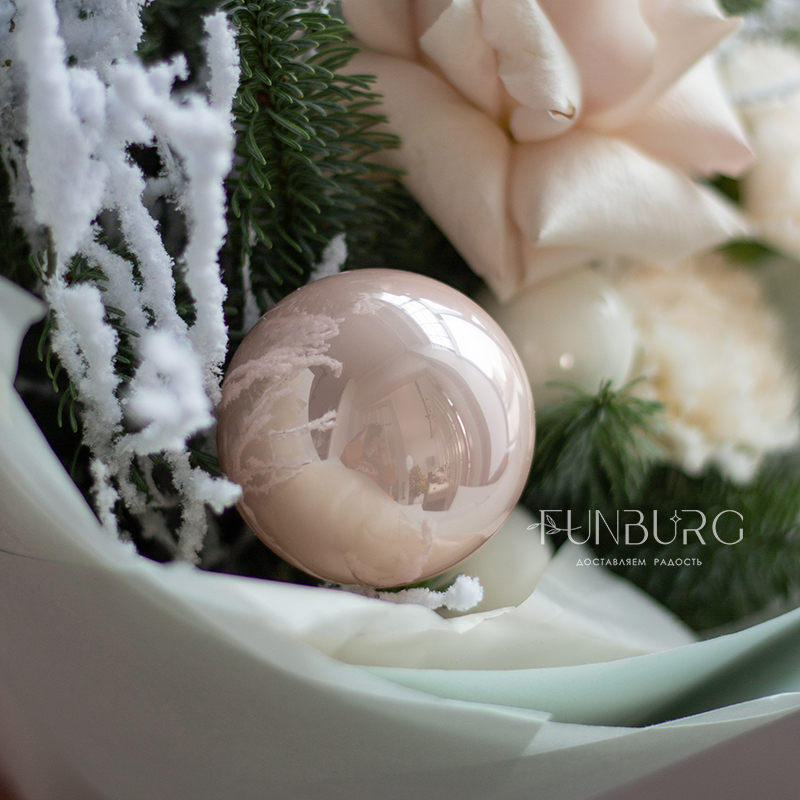 Нежный зимний букет из утонченных французских роз Quicksand, кружевных кремовых диантусов, изящных заснеженных веточек и ароматного нобилиса, дополнен нарядными стеклянными ёлочными шариками и воздушной мятной упаковкой. Создан для самых трогательных зимних моментов.