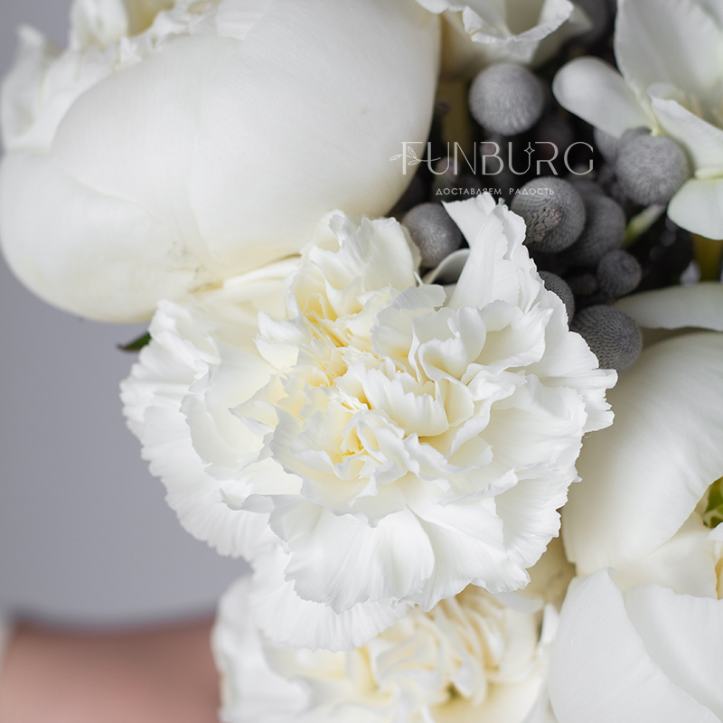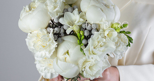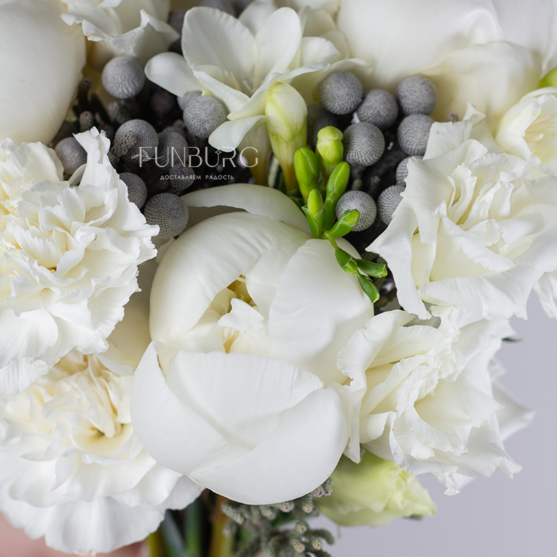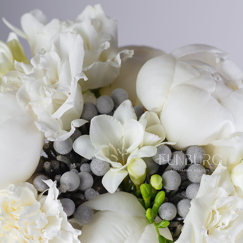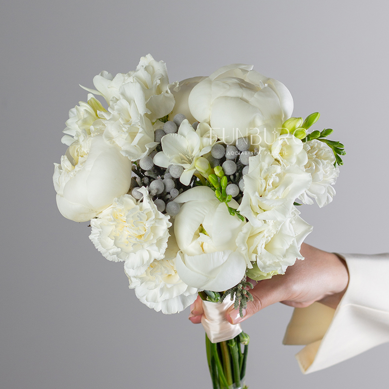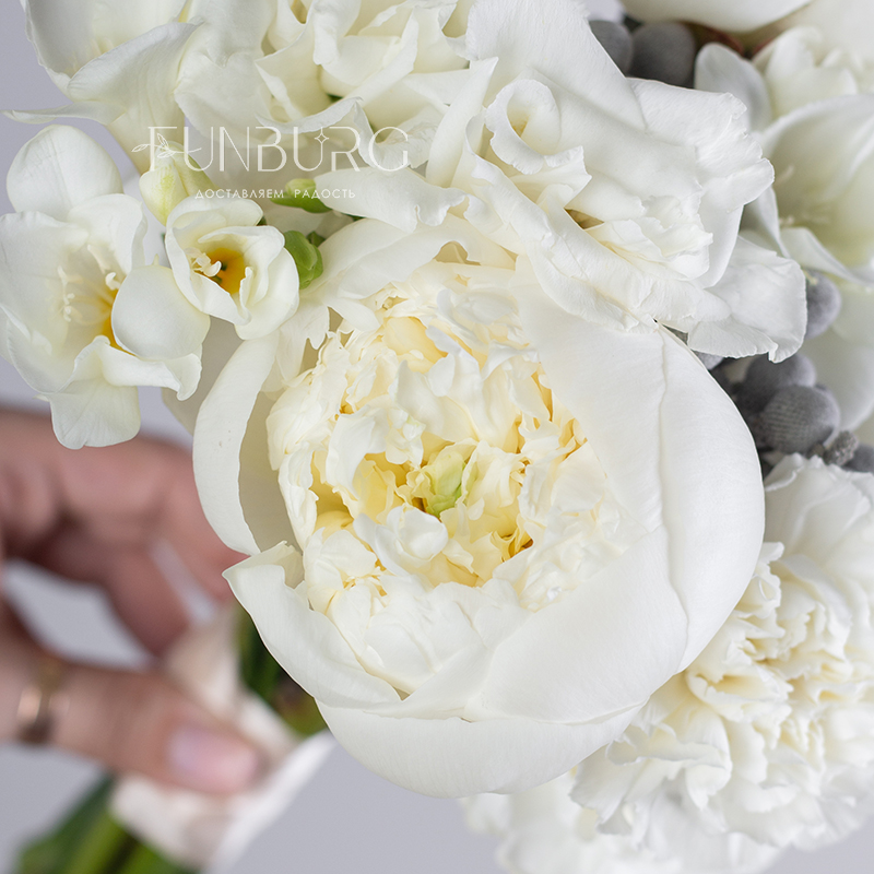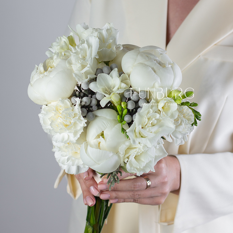 Утонченный стильный и лаконичный букет невесты из сливочных пионов, ароматных фрезий, белоснежных эустом и кружевных диантуов, дополненных жемчужинками брунии.