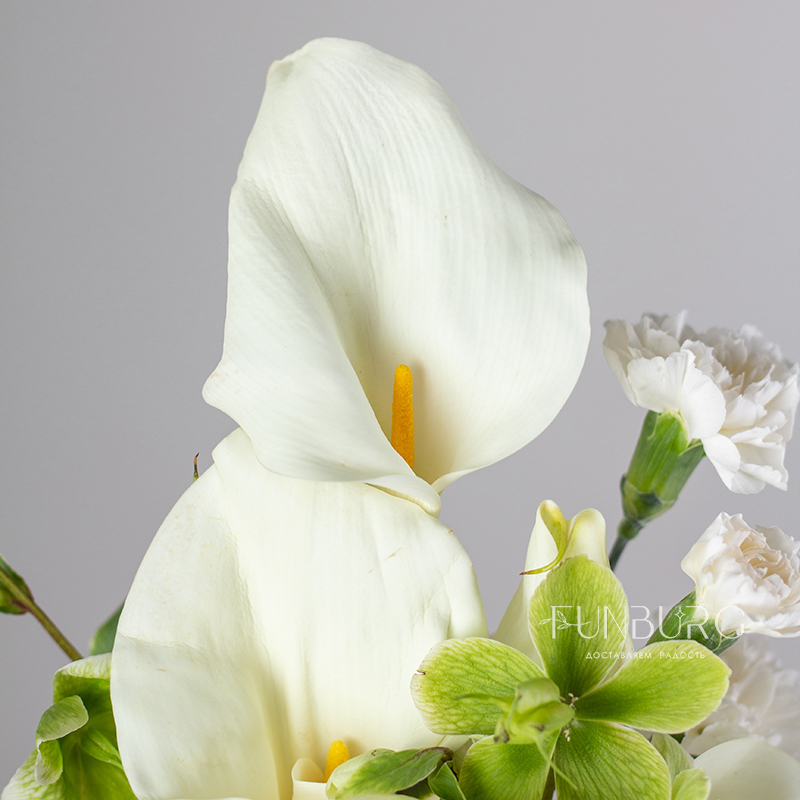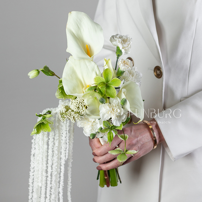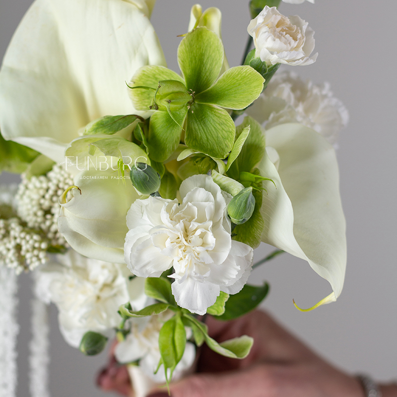 Элегантный и утонченный букет невесты из изящных калл, воздушных салатовых хелеборусов, трогательных кустовых гвоздик ниспадающего амаранта. Для минималистичных утонченных образов подойдет идеально.
