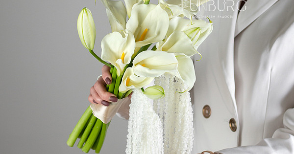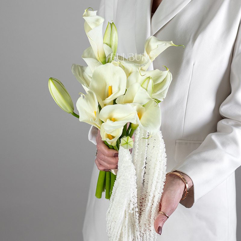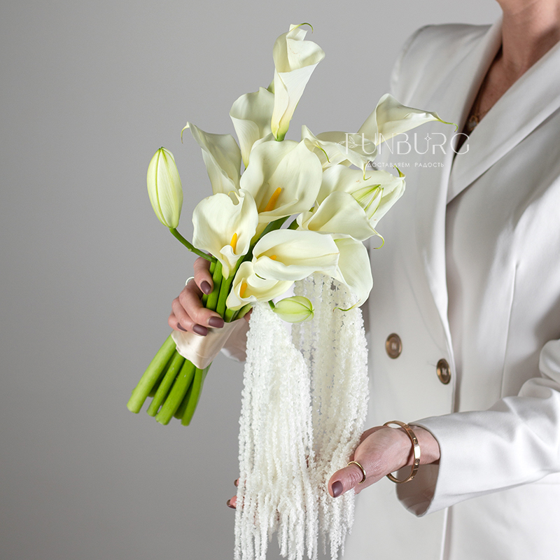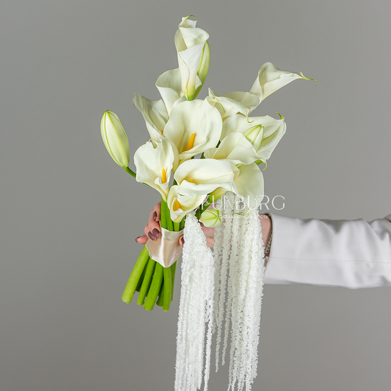 Элегантный и утонченный букет невесты из изящных калл, лилиий и ниспадающего амаранта.