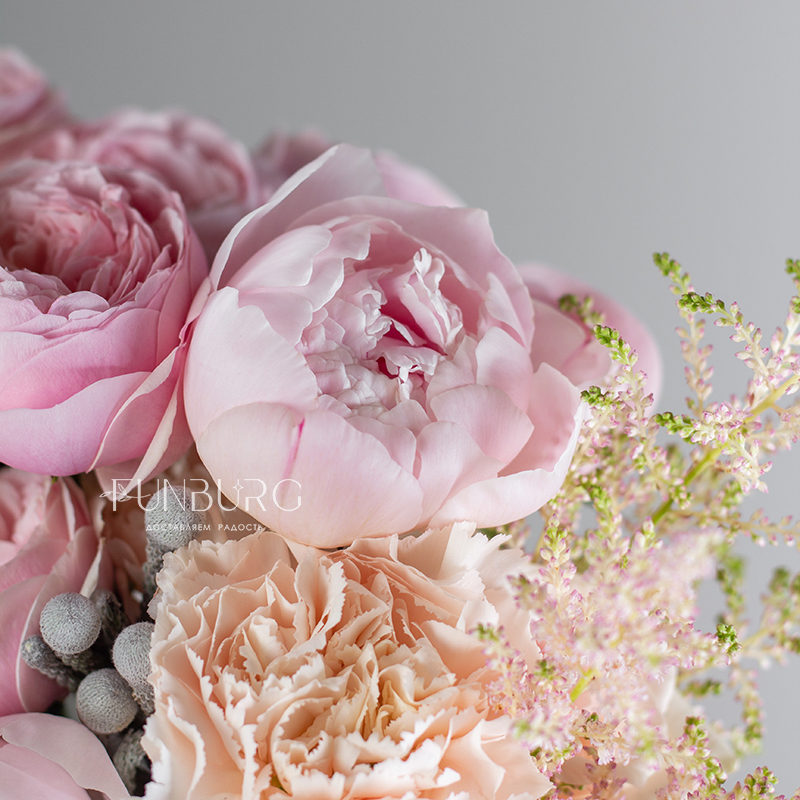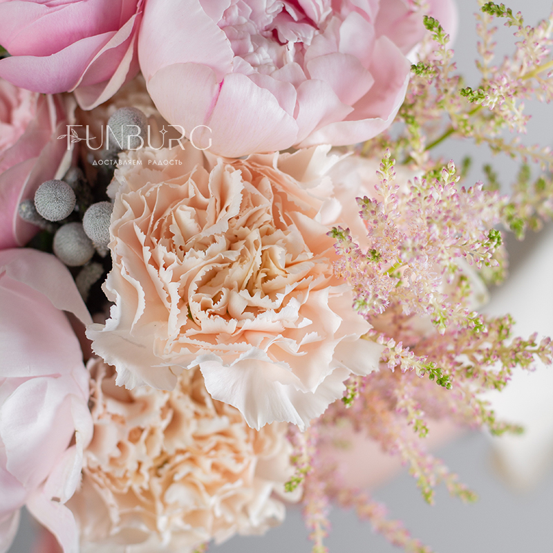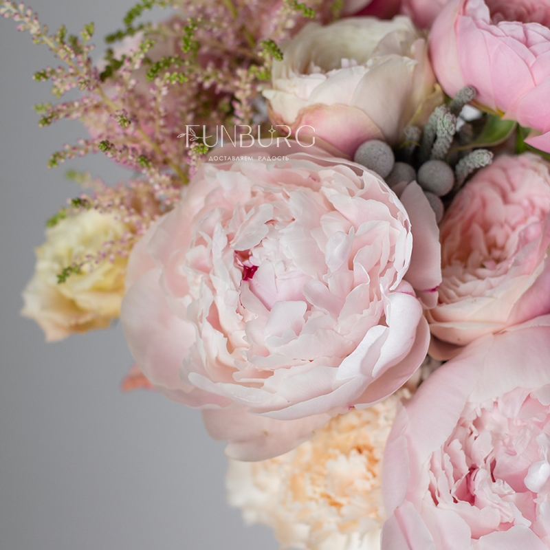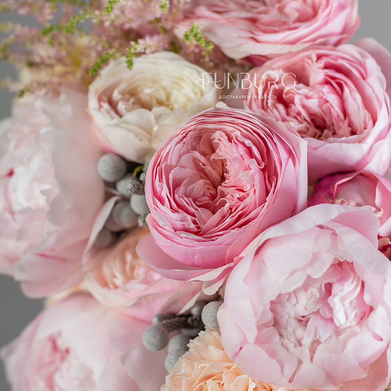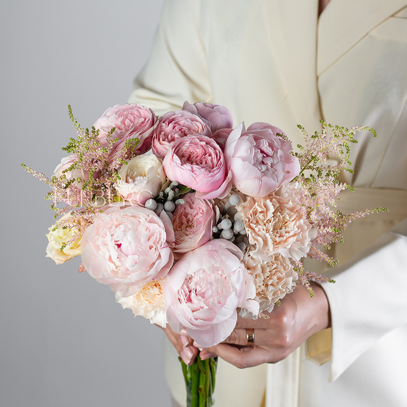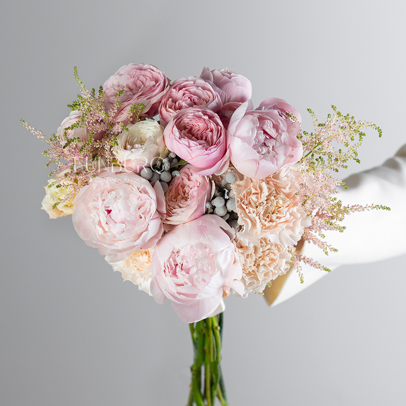 Зефирный букет из пионов, пионовидных роз, эустомы, кружевных гвоздик, жемчужинок брунии и веточек астильбы в разных оттенках розового для утонченной и нежной невесты.