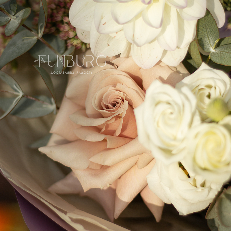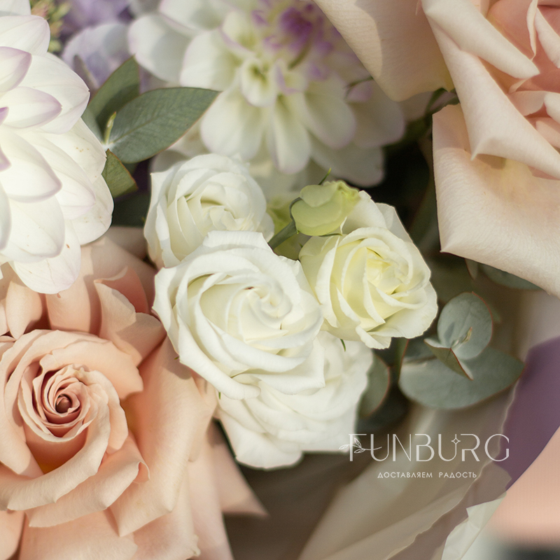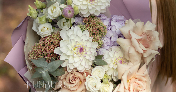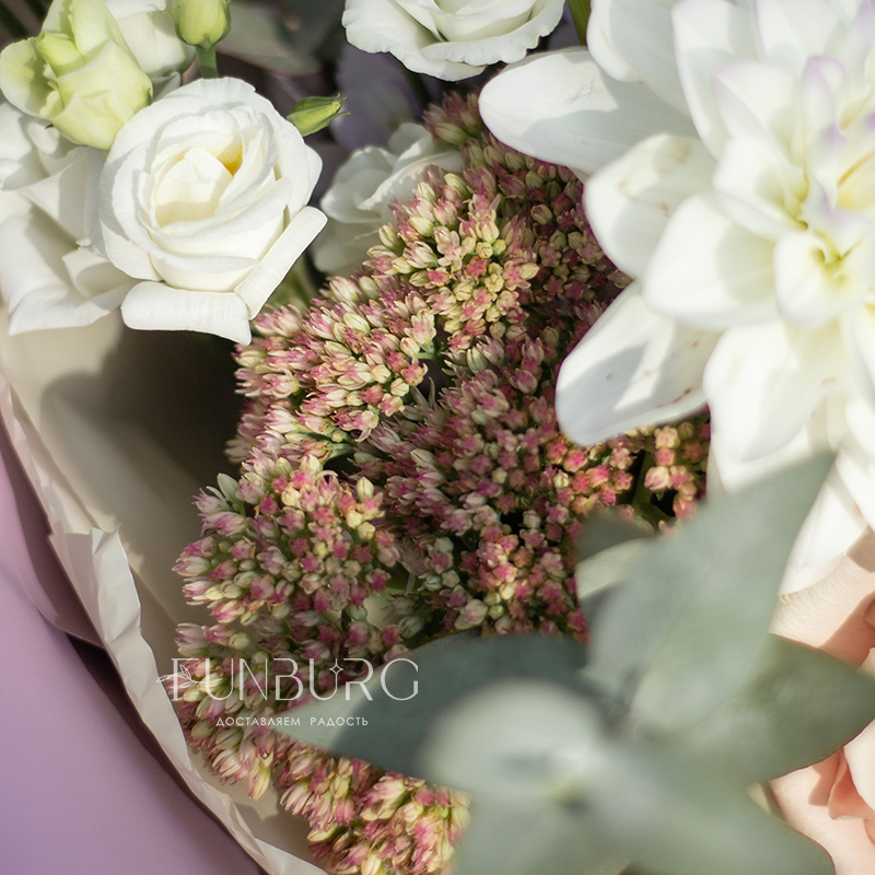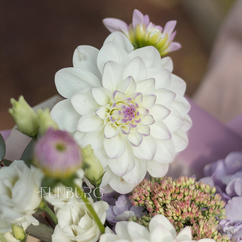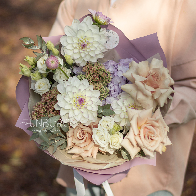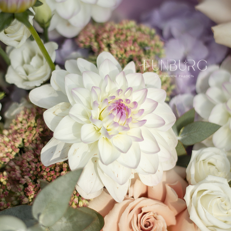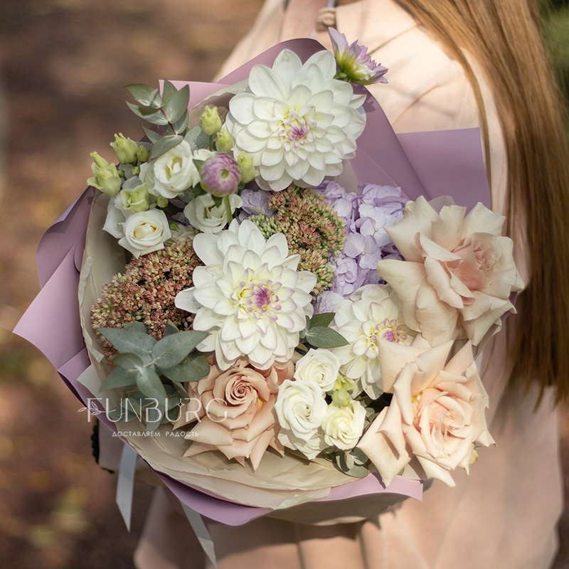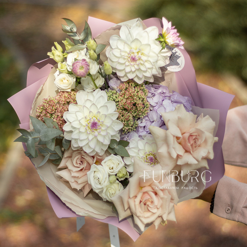 Невероятно нежный и фактурный букет из идеальных бело-лавандовых георгин, сиреневой гортензии, немного припыленно-бежевой сортовой розы, нежных эустом и веточек седума и эвкалипта как иллюстрация акварельных летних рассветов.