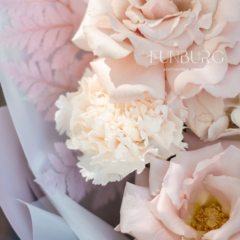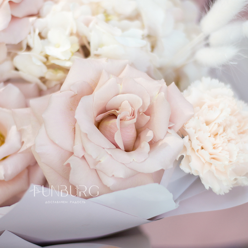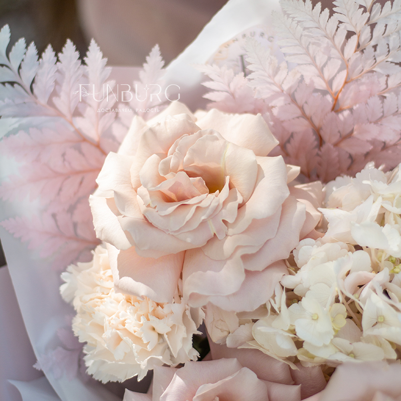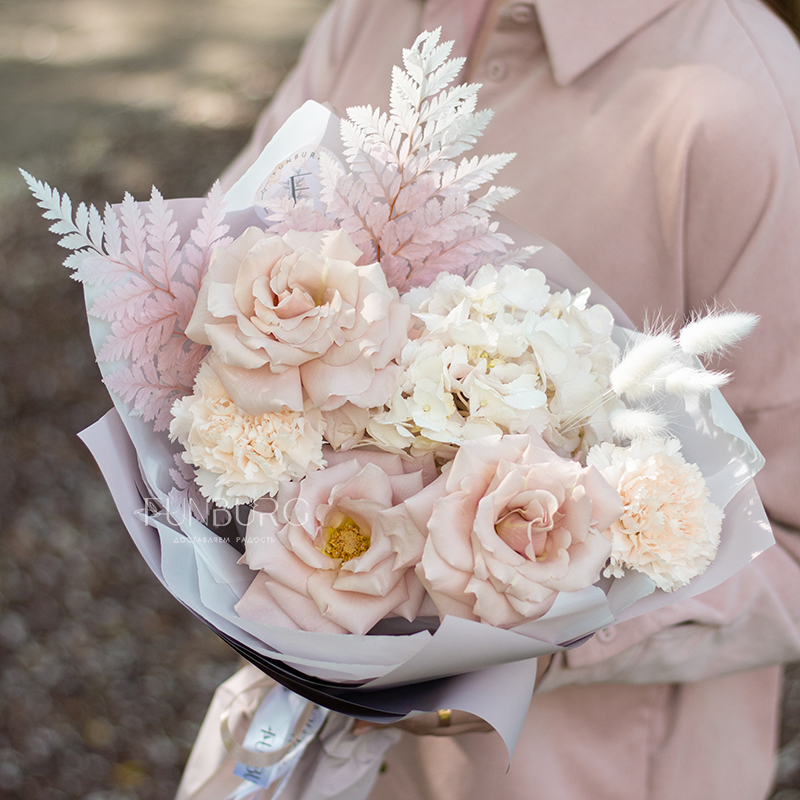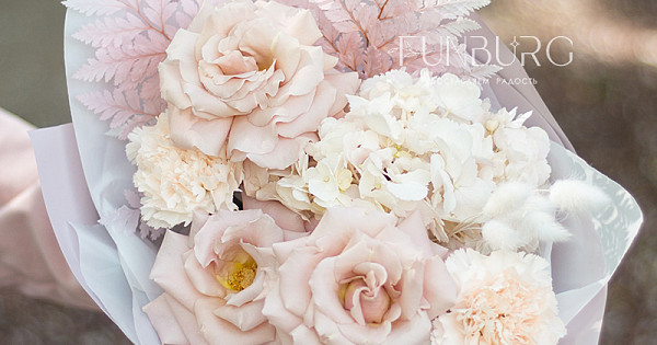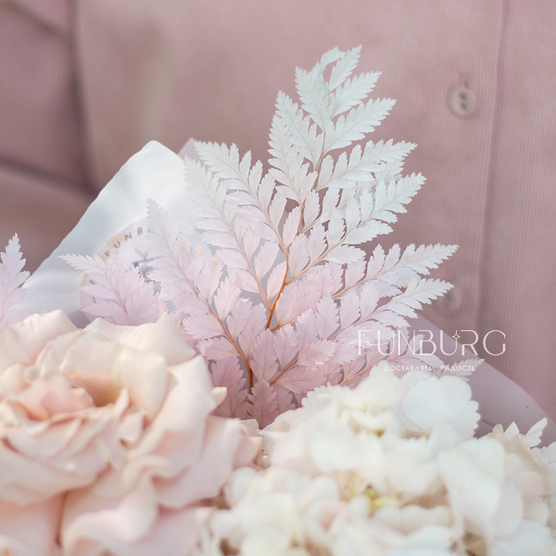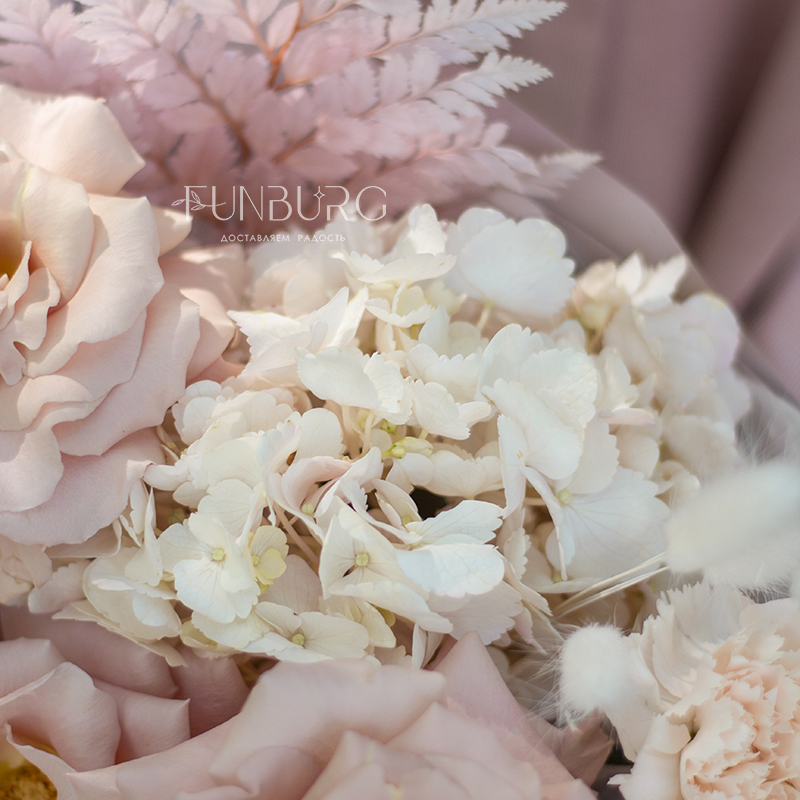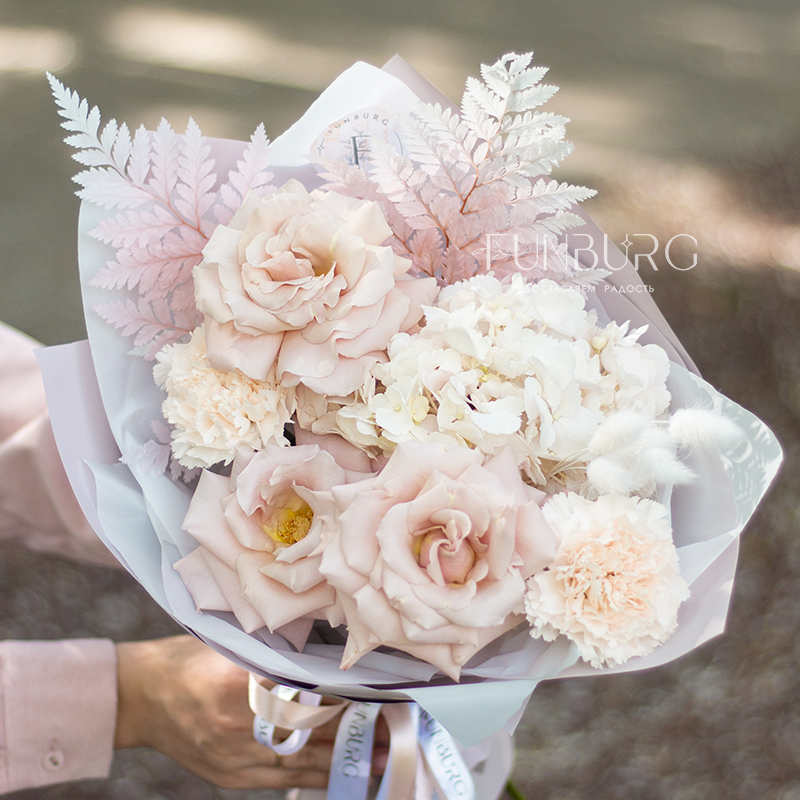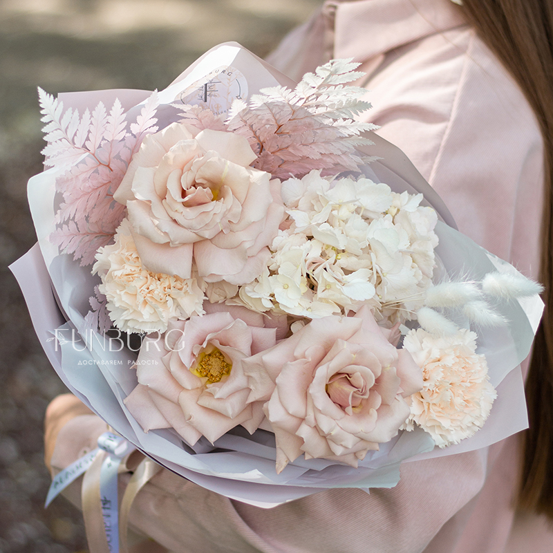 Изысканный нежнейший букет из ажурных французских пудрово-кремовых роз, кружевных диантусов, воздушной гортензии и нежных сухоцветов. Для самых особенных случаев и получателей.