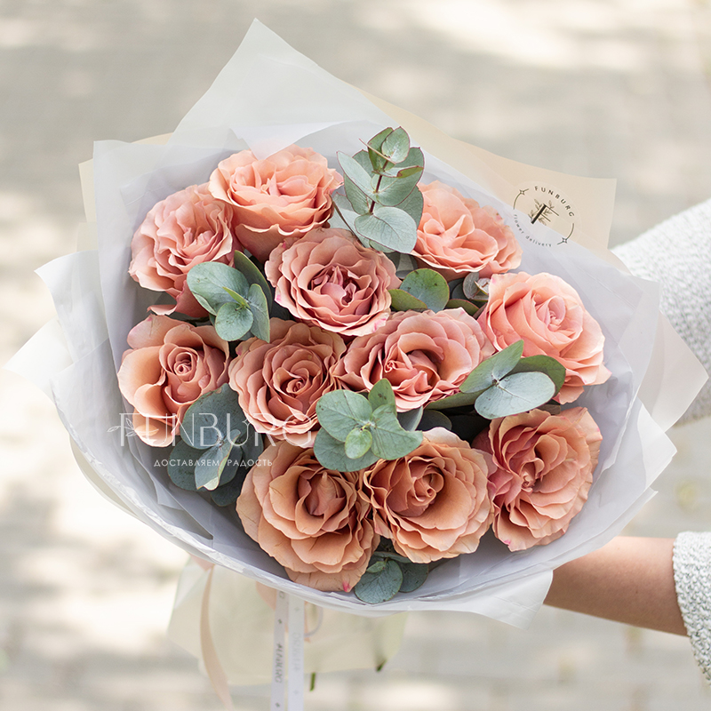 Уютный теплый букет из удивительных роз красивого оттенка шоколадного мусса, оттенённых листиками серебристого эвкалипта, в матовой воздушной полупрозрачной упаковке.