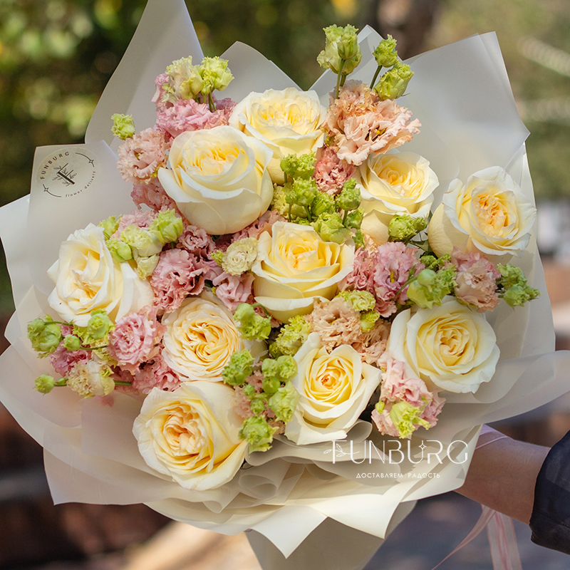 Нежнейшее облако сливочных сортовых роз Candlelight, которые со временем очень красиво раскрываются множеством лепестков, и кружевных пудрово-розовых эустом в идеально дополняющей оттенок роз лаконичной упаковке. Безупречно!