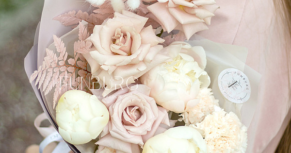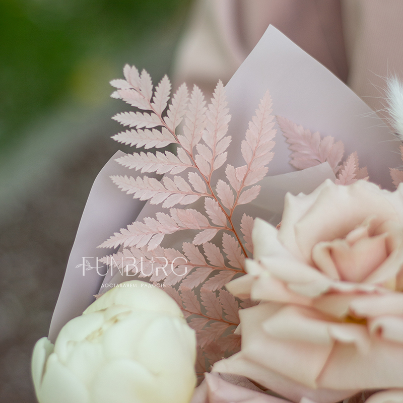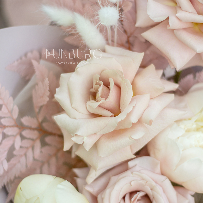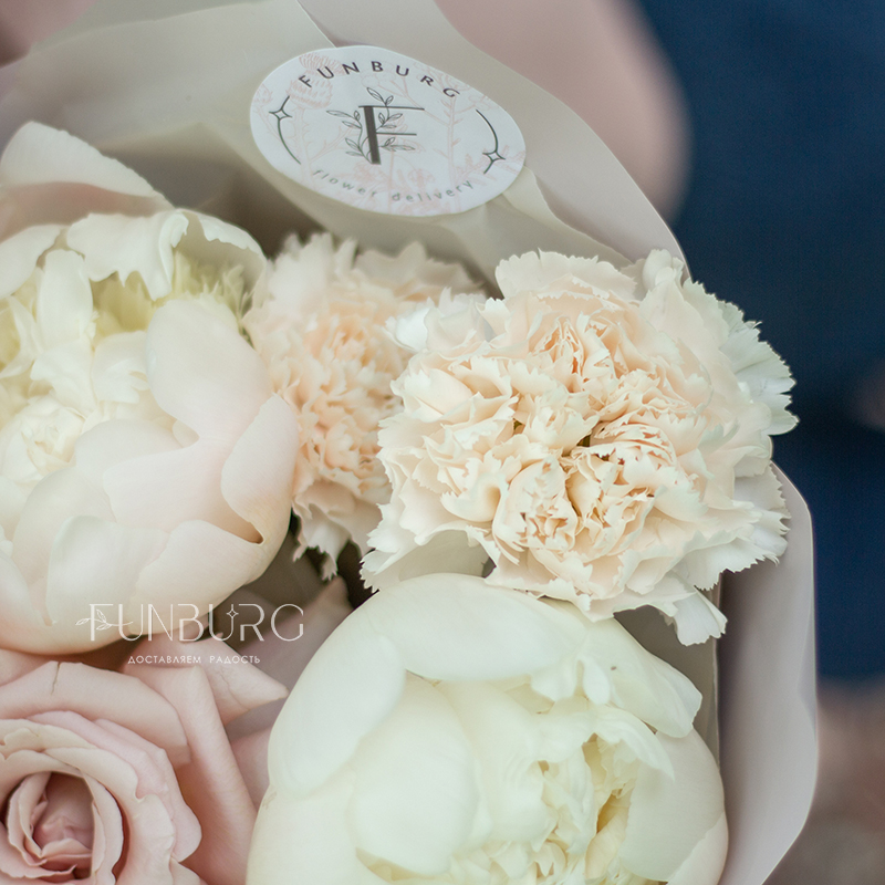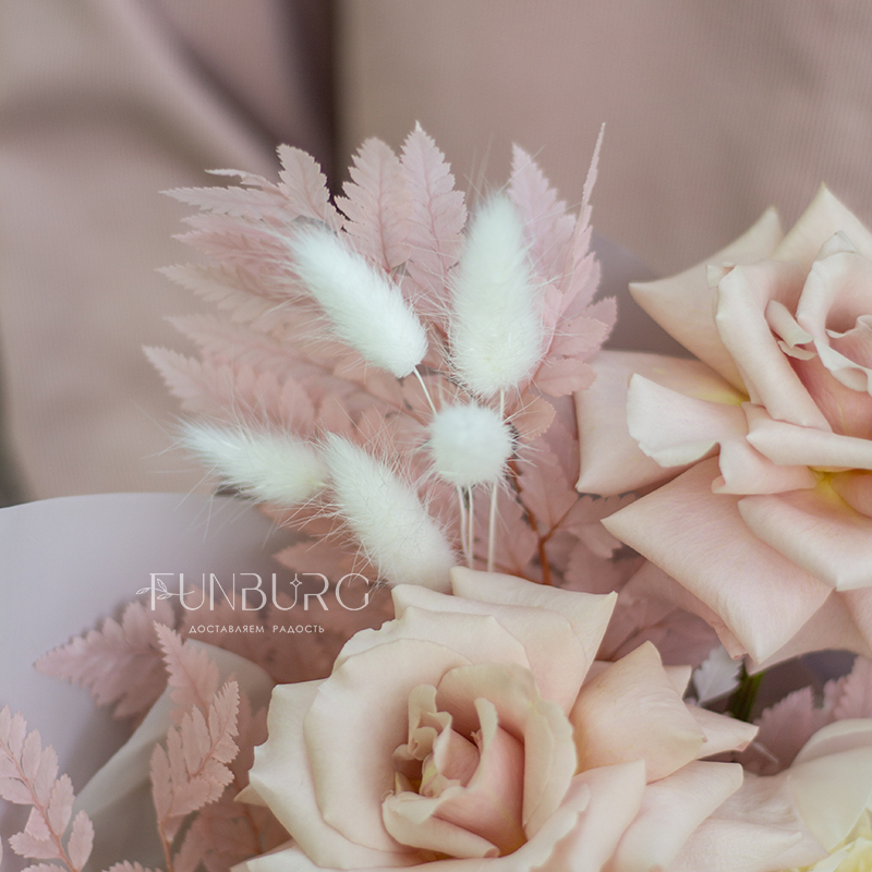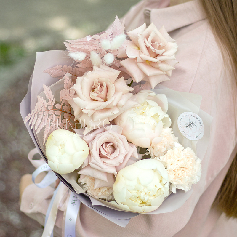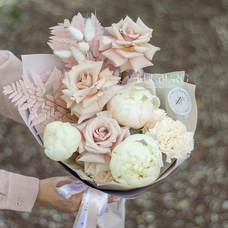 Изысканное и утонченное сочетание сливочно-кремовых оттенков пышных французских роз, пломбирных пионов и кружевных кремовых диантусов, дополненных пудровыми стабилизированными веточками и пушистым лагурусом.
