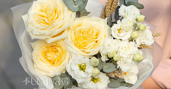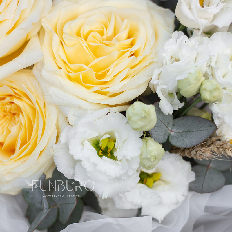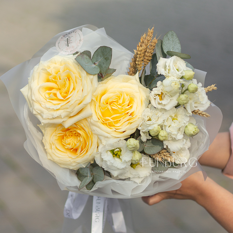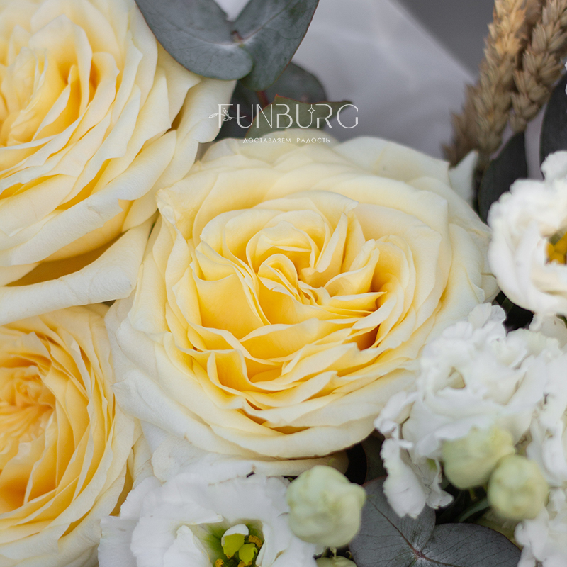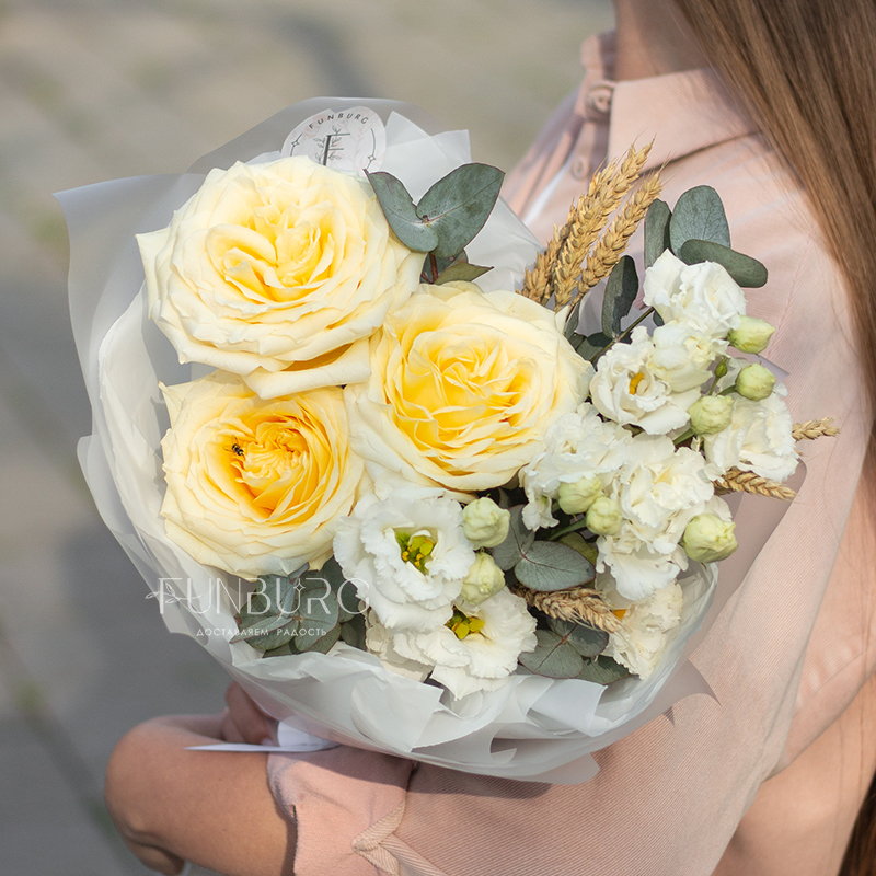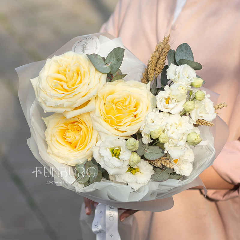 Мягкие сливочные и белые оттенки, мягкие волны бесподобных роз Candlelight (они еще удивят вас красотой раскрытия крупных ароматных бутонов!), кружевная эустома и уютные веточки пшеницы. Этот букет создан дарить радость и тепло самых искренних чувств.
