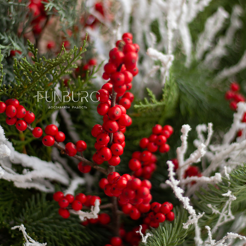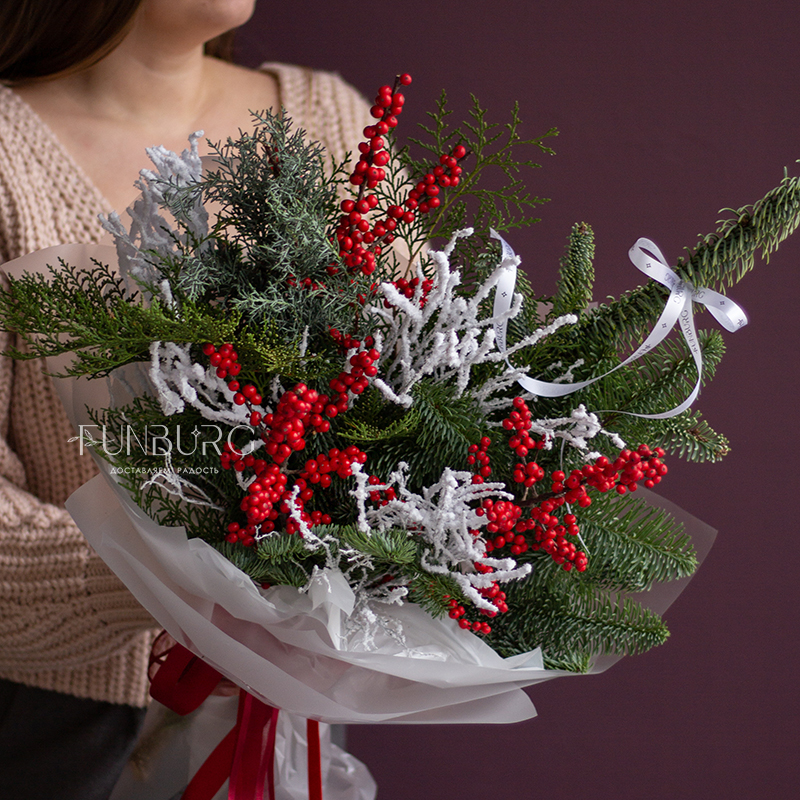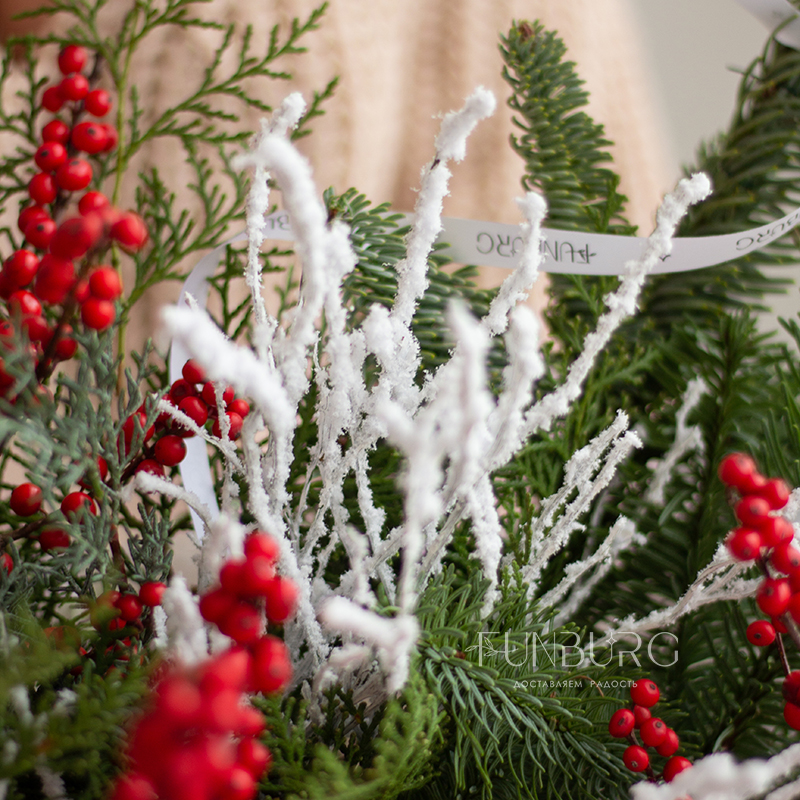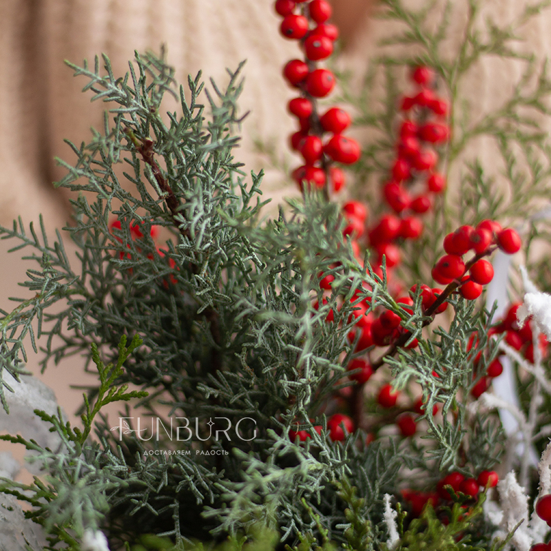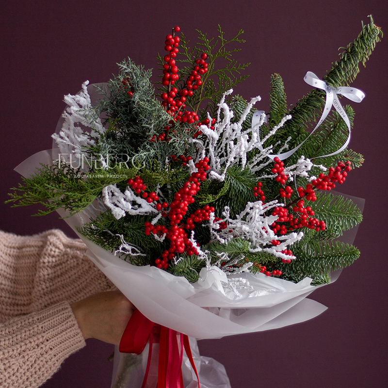 Пышный ароматный зимний букет из пушистых веточек нобилиса, кипариса, ярких полыхающих ягодок илекса и волшебных заснеженных веточек создан создавать новогоднее настроение!