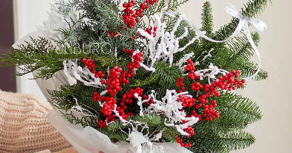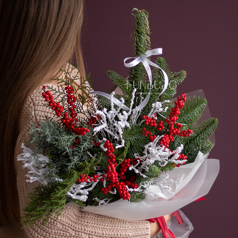 Этот букет может стать не только идеальным зимним подарком, но и необычной альтернативой новогодней ёлки, а благодаря тому, что нобилис не осыпается и практически не меняет свой внешний вид, композиция будет радовать и дарить настроение весь декабрь!