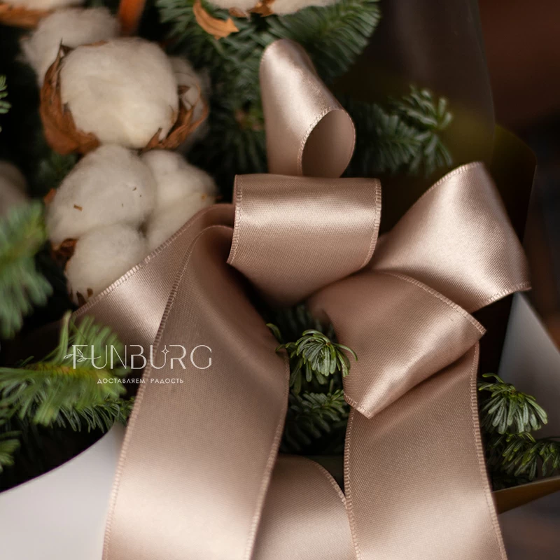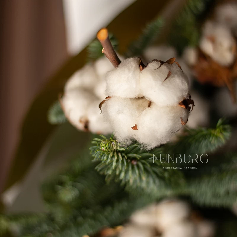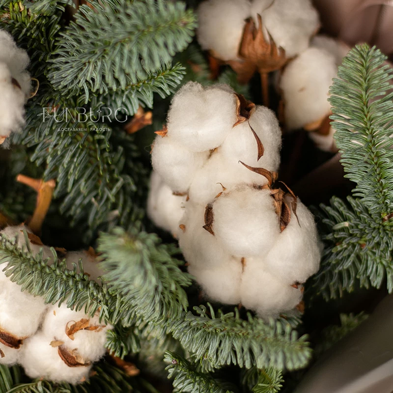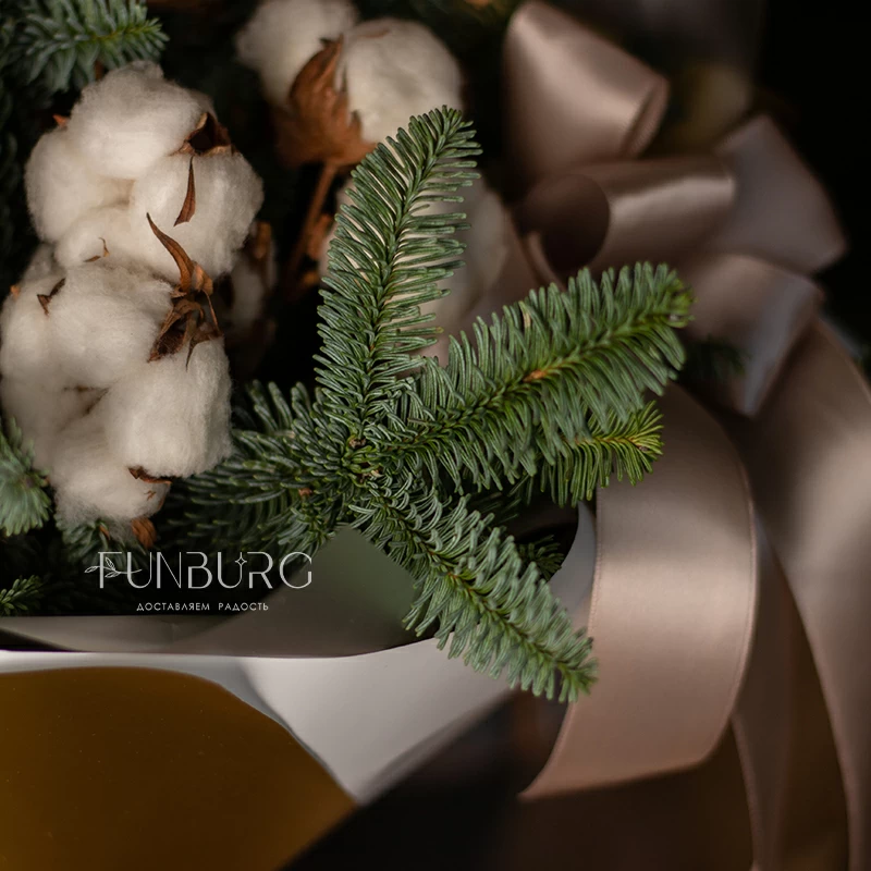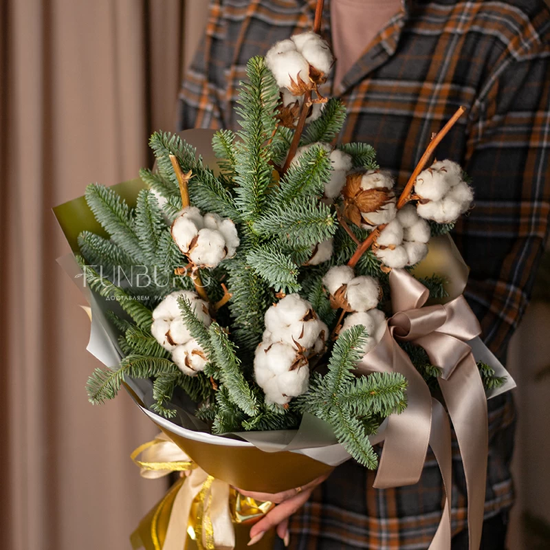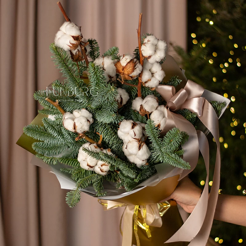 Лаконичный зимний букет из ароматных веточек нобилиса и пушистого, как первый снег, хлопка в праздничной золотистой упаковке создан создавать новогоднее настроение!