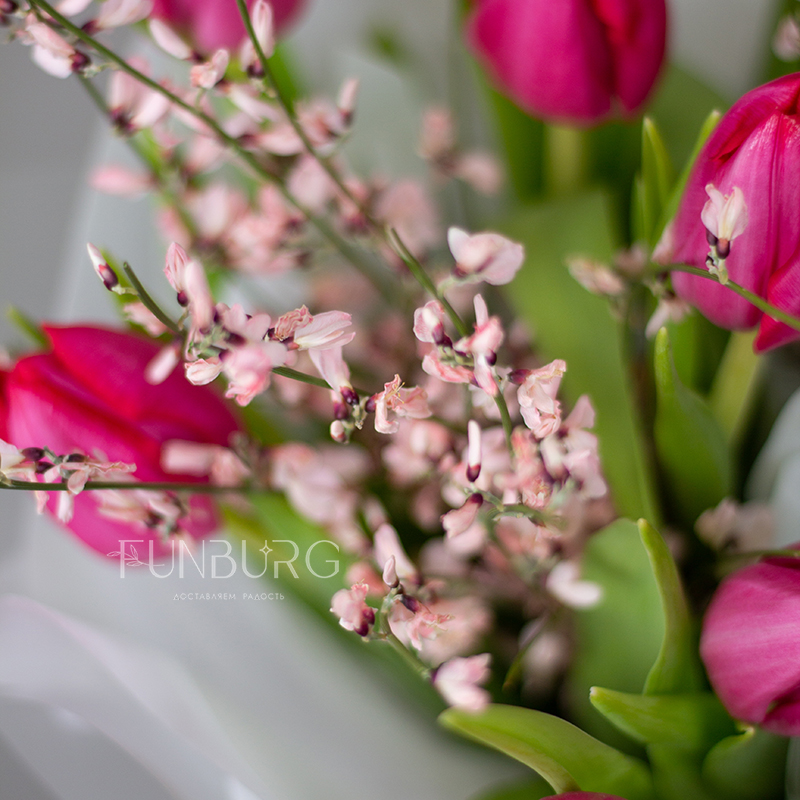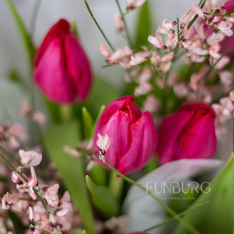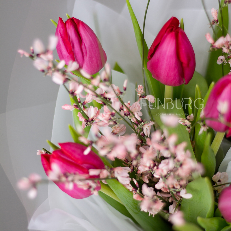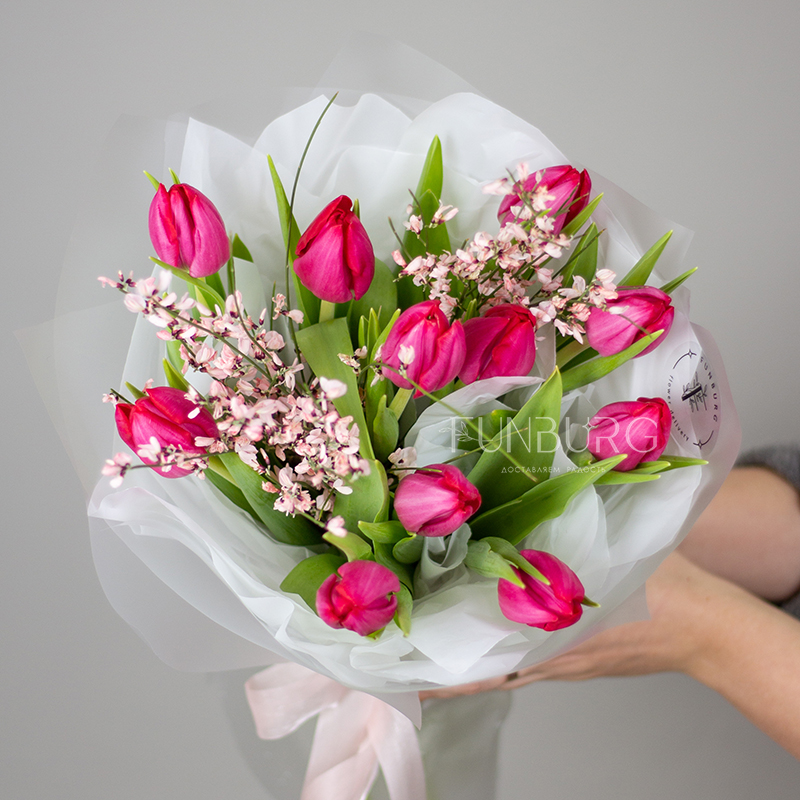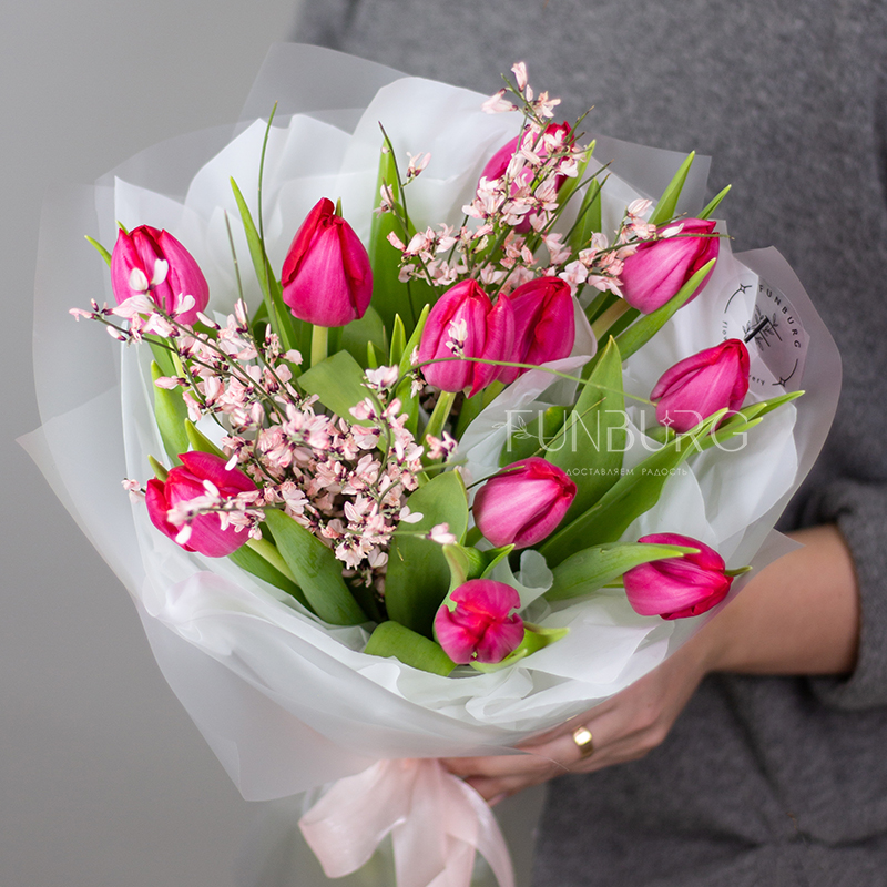 Яркий воздушный букет из эффектных ярко-розовых тюльпанов и игривых ароматных веточек дженисты в легкой матовой упаковке, подчеркивающей яркость цветов.