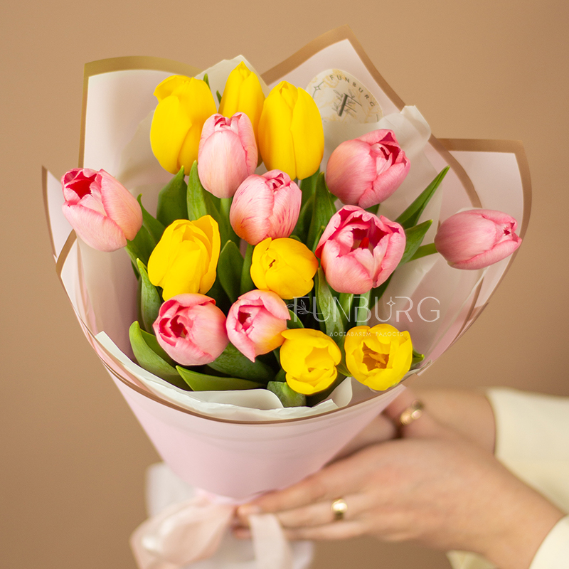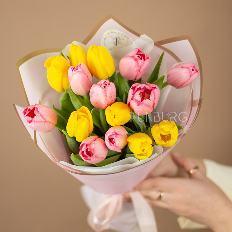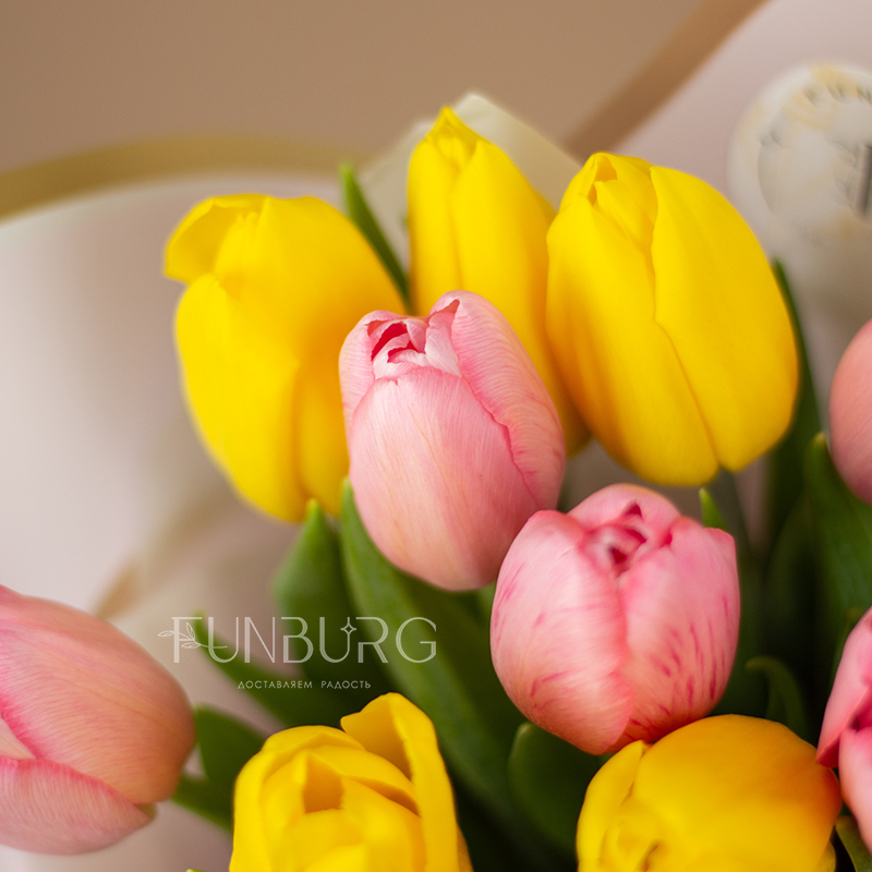 Яркие, как разноцветные конфетки, желтые и розовые тюльпаны в матовой упаковке созданы раскрасить даже самый серый весенний день и подарить настроение!