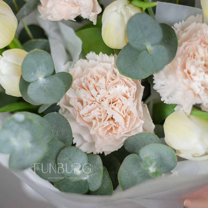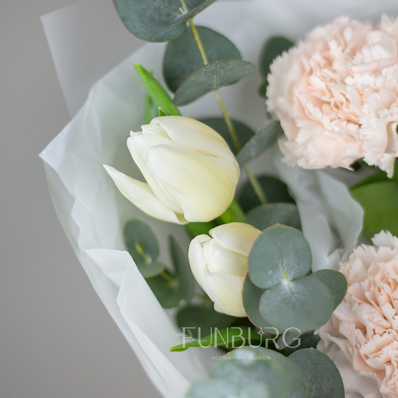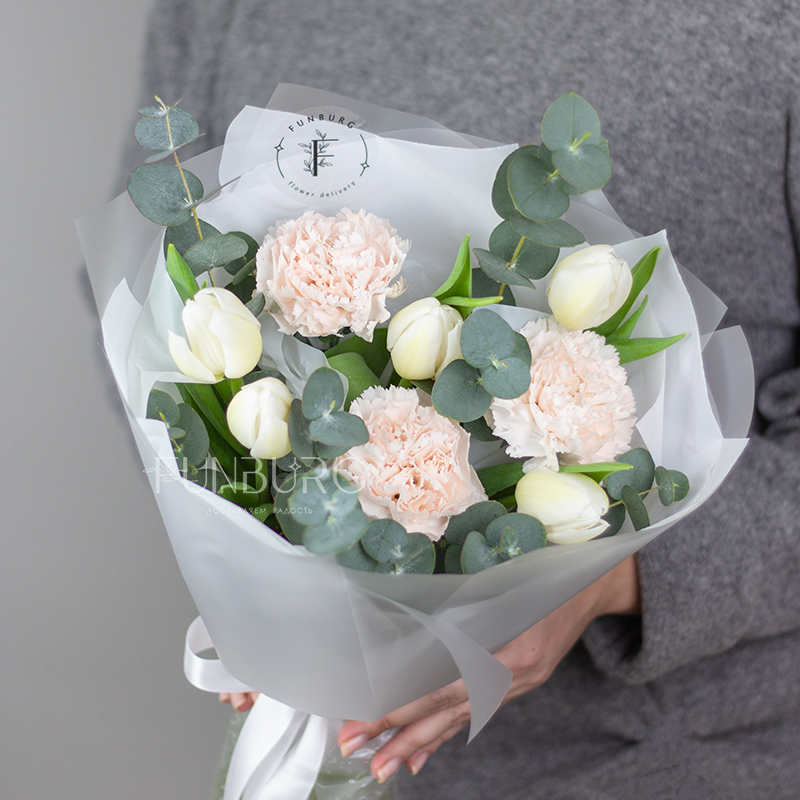 Нежный воздушный букет из белоснежных хрустящих тюльпанов, кружевных диантусов и ароматного эвкалипта в объятиях невесомой матовой упаковки.