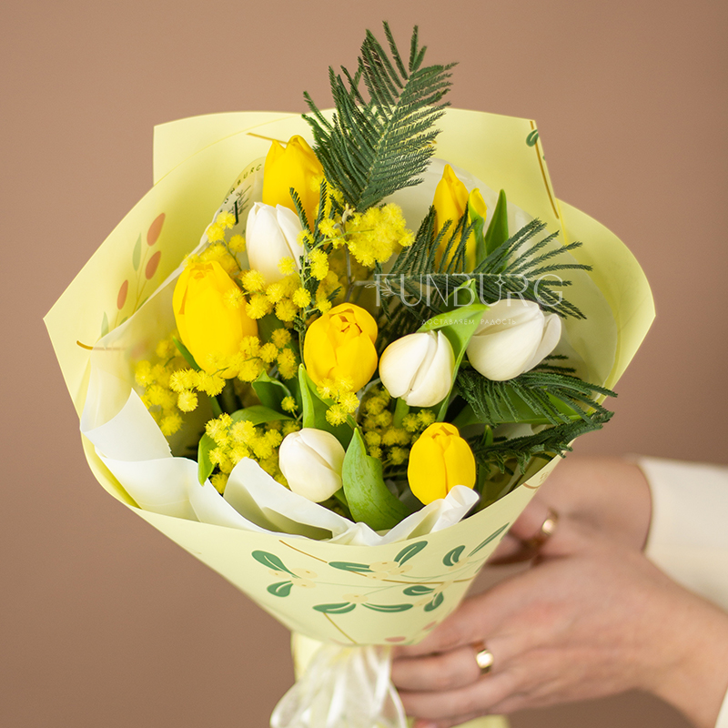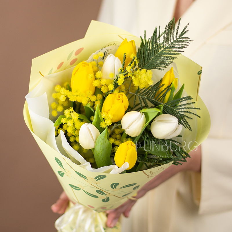 Белоснежные, как подснежники, и жизнерадостные солнечные тюльпаны в дуэте с воздушными пушистыми веточками ароматной солнечной мимозы мгновенно создают весеннее настроение и дарят тепло!
