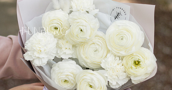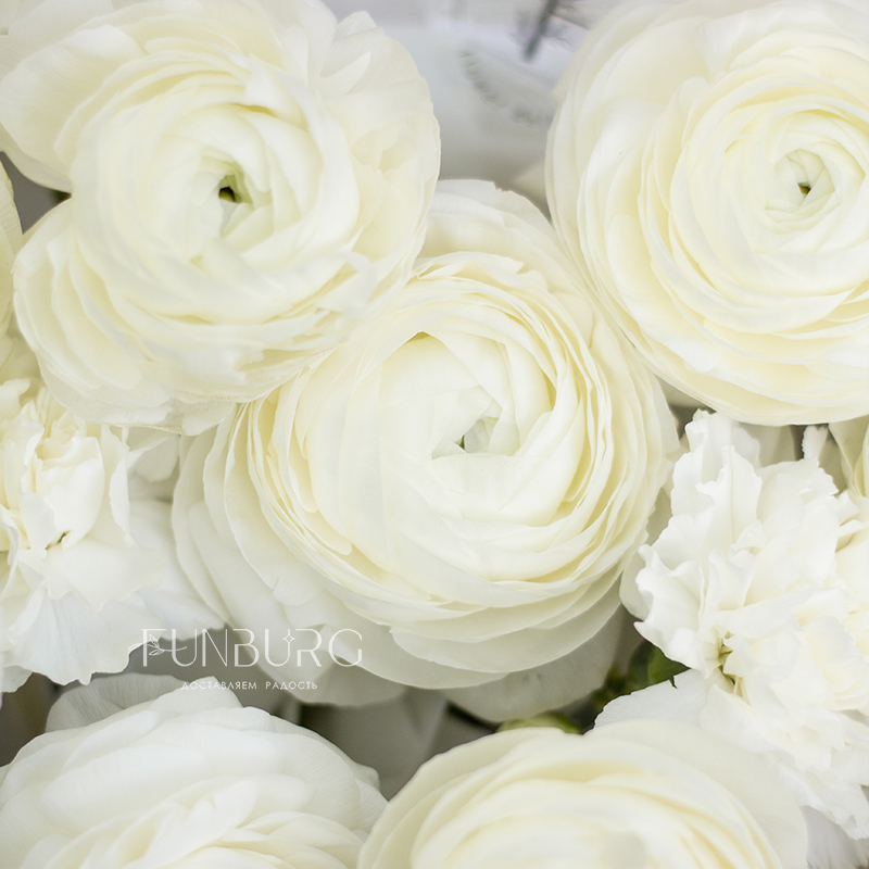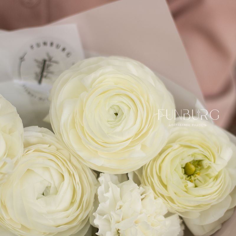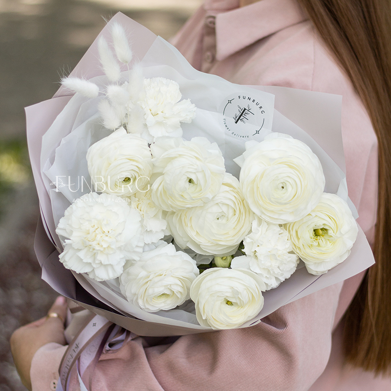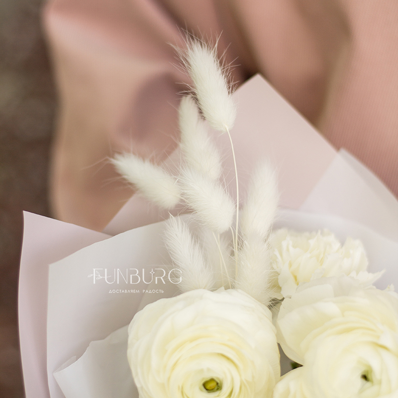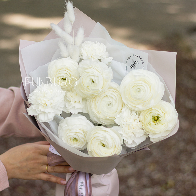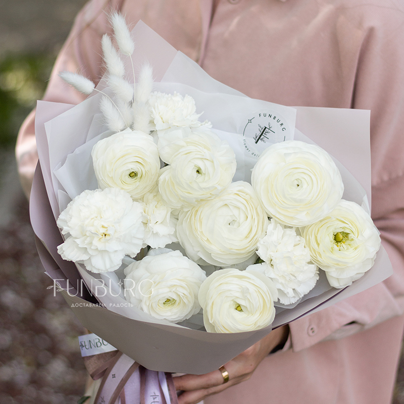 Воздушное нежное белое облако неповторимых ранункулюсов и кружевных гвоздик, дополненных пушистыми веточками лагуруса. Нежность цветов подчеркнута невесомой многослойной воздушной упаковкой. Идеальный подарок для самых трогательных моментов.