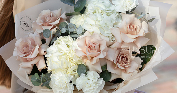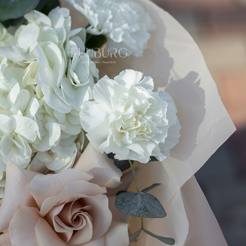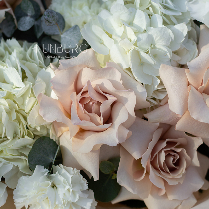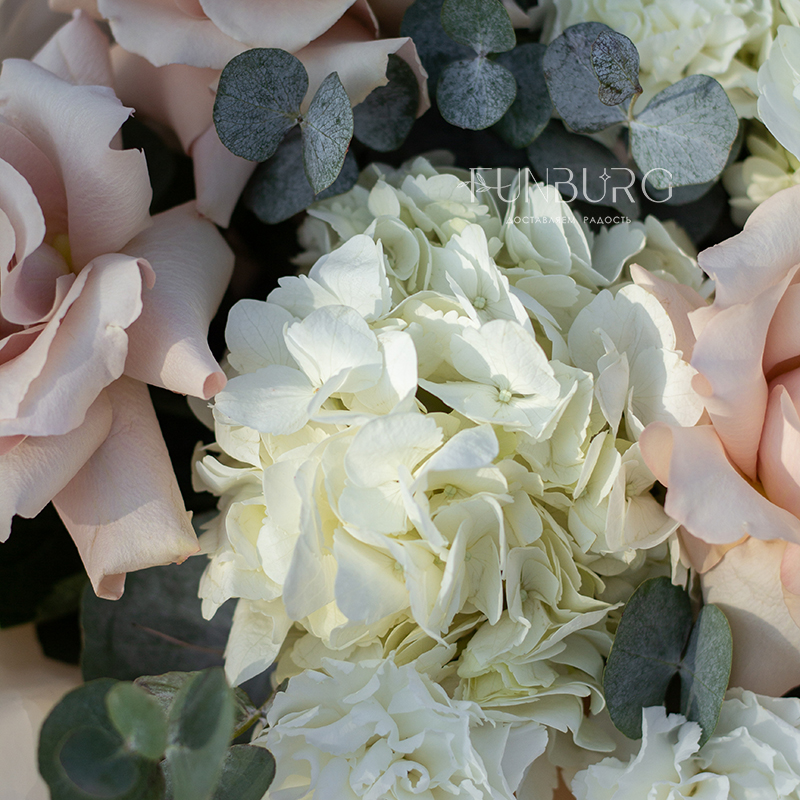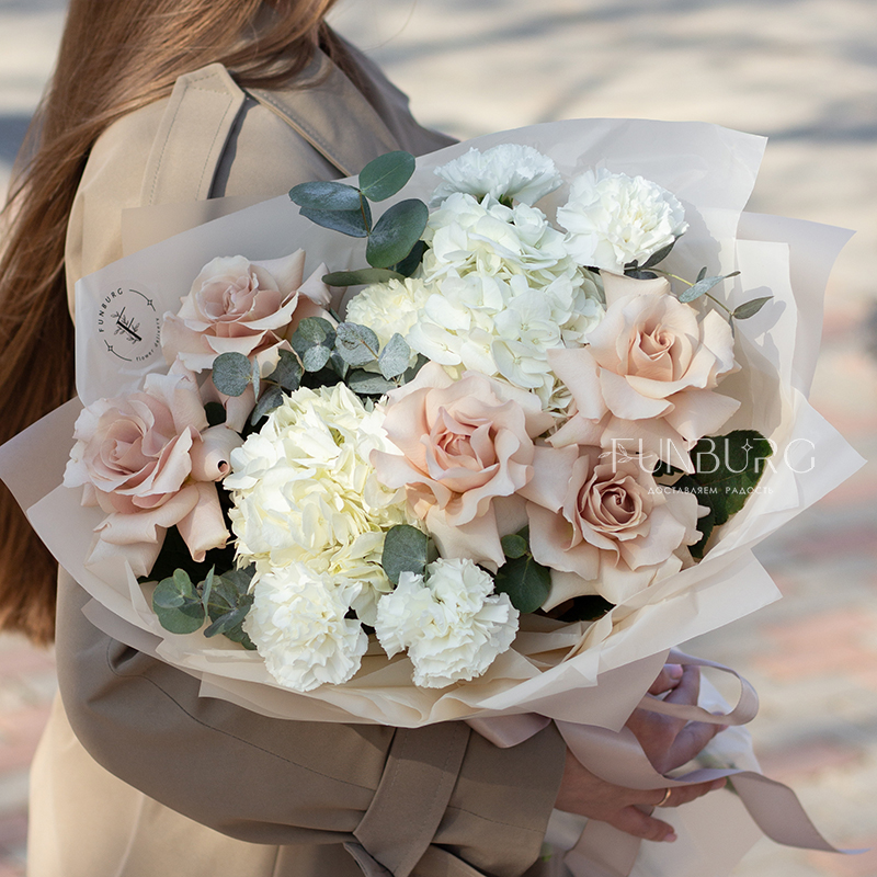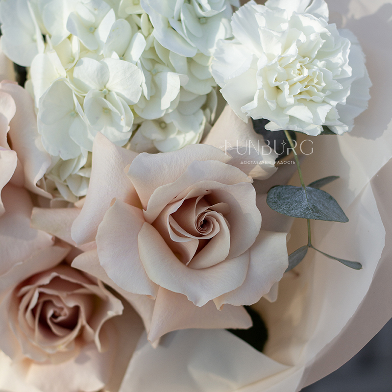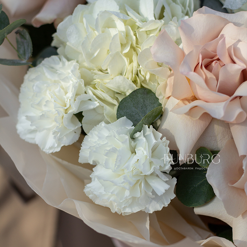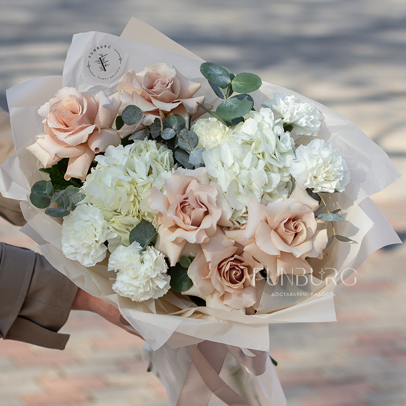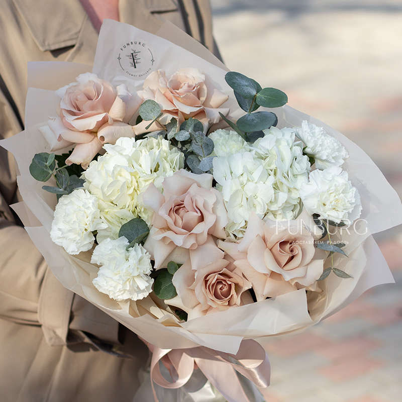 Нежное притягательное сочетание немного винтажных французских бежево-пудровых роз, облаков гортензии, кружевных белоснежных диантусов и серебристо-зеленых листиков эвкалипта в нежной упаковке под цвет букета. Для ценителей непростых изысканных сочетаний.