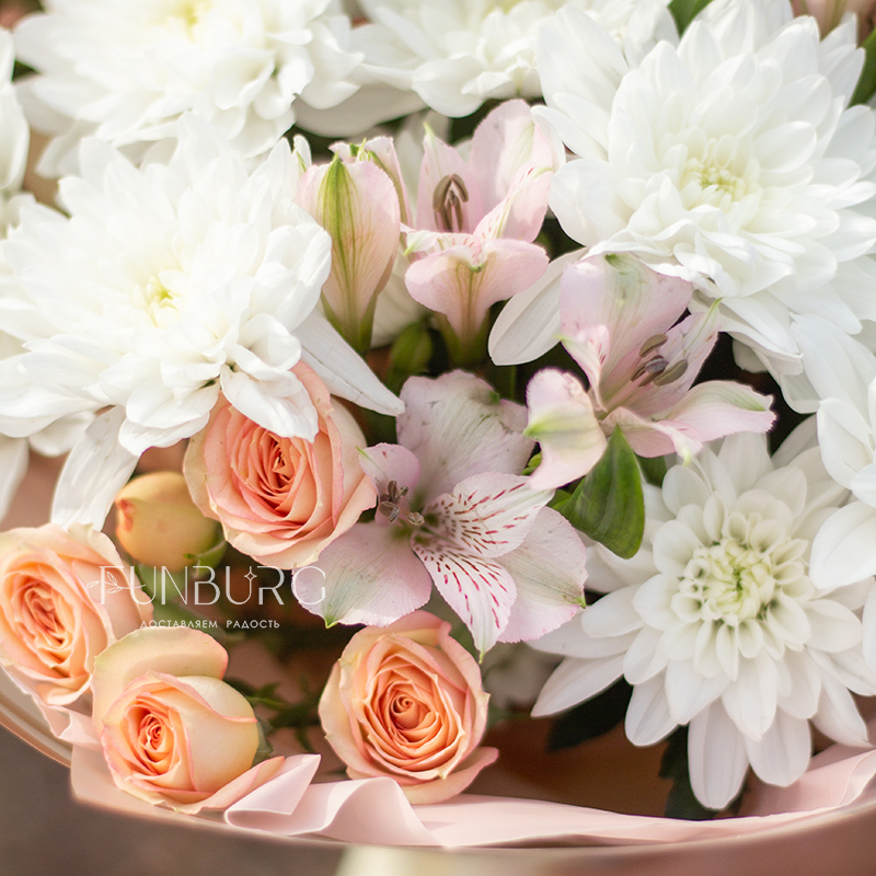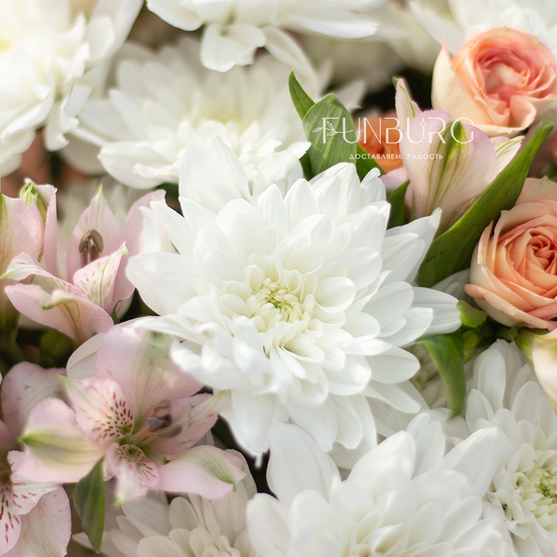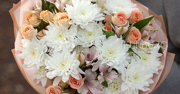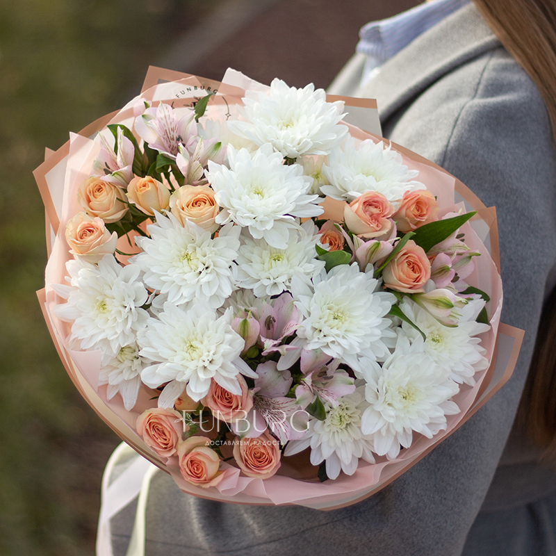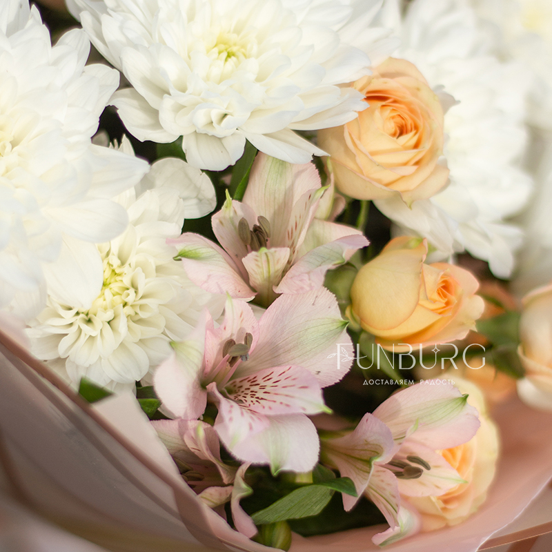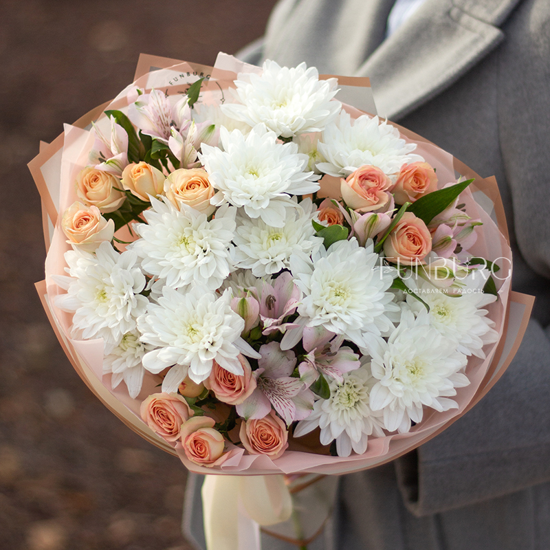 Пушистые белые хризантемы, персиковые кустовые розы и нежные бабочки-альстромерии в нежном облаке упаковки.