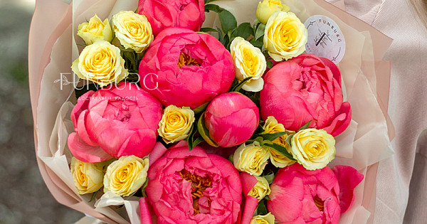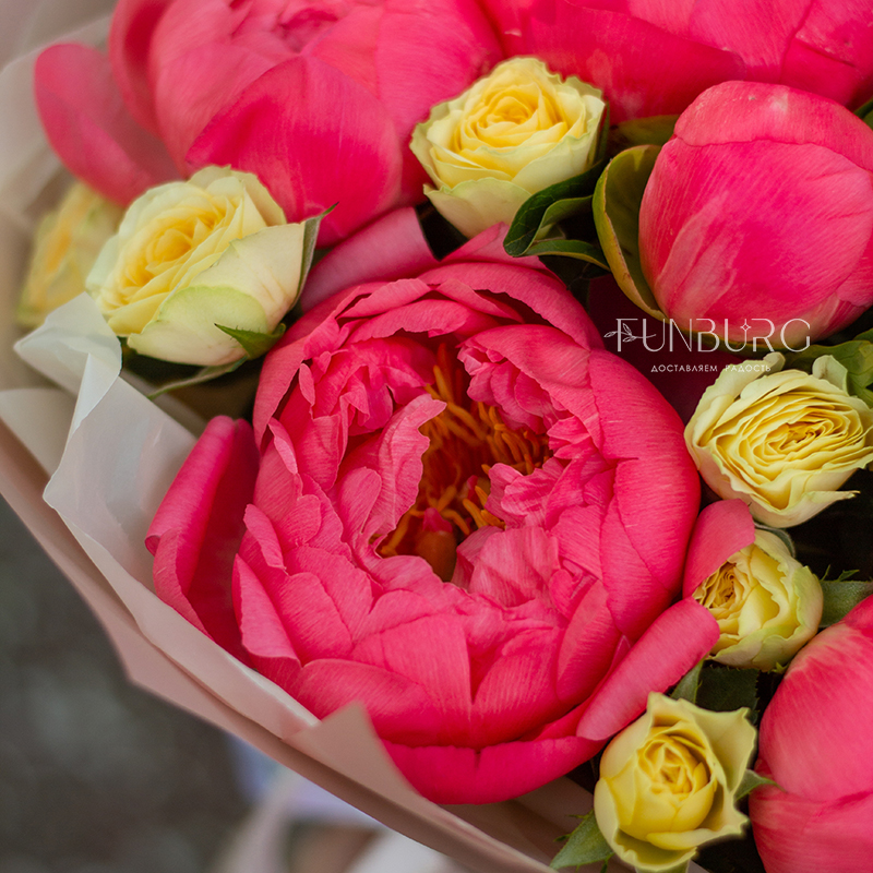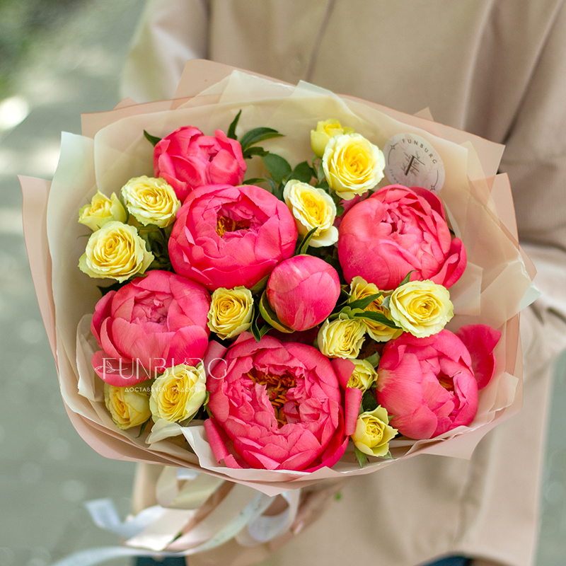 Волшебный яркий букет из коралловых пионов и сочных лимонных кустовых роз. А волшебным мы назвали букет не просто так: в течение нескольких дней яркие коралловые бутоны раскрываются и становятся нежно-персиковыми! Магия ближе, чем кажется ;)