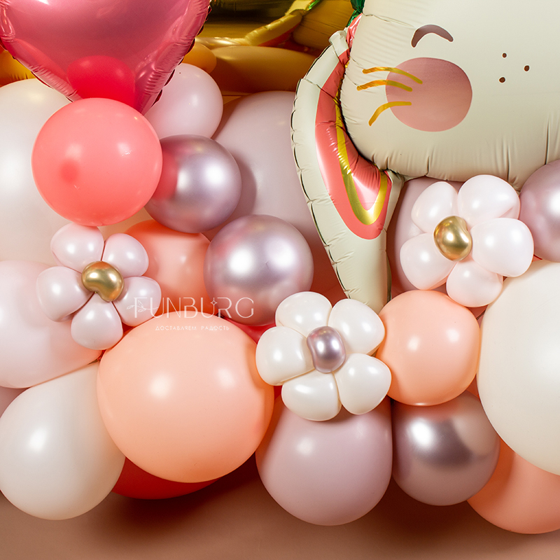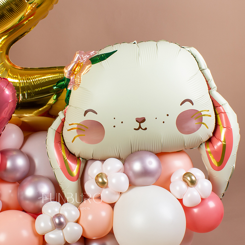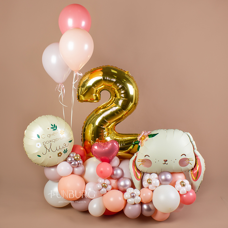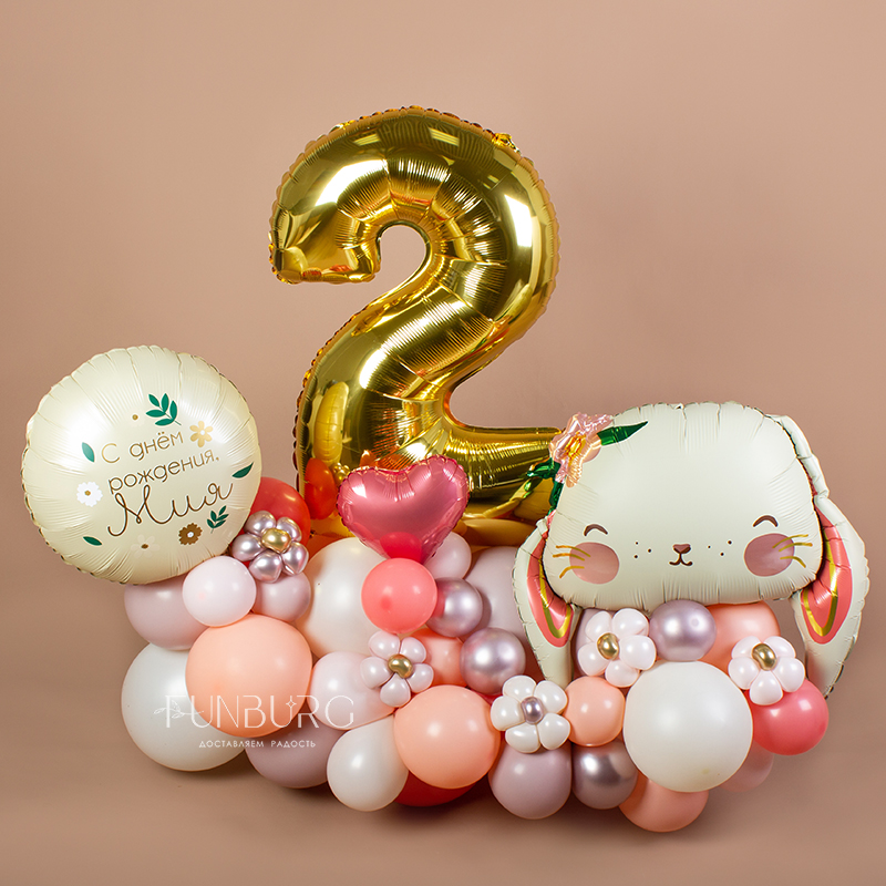 Нежная композиция с очаровательной зайкой, сверкающей золотой цифрой, кругом с надписью на основании в россыпи цветочков идеально подойдет для первых дней рождения!