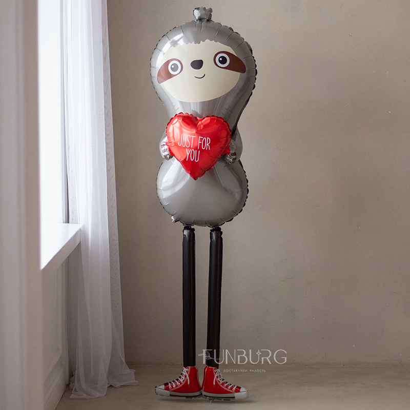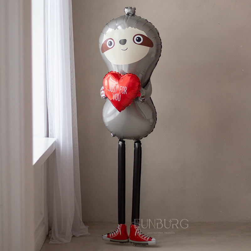 Очаровательный влюблённый ленивец в человеческий рост, с сердечком в руках и в веселых красных кедах, мечтательно стоящий, немного застенчиво улыбающийся, и иногда сам перемещающийся по полу – разве можно придумать более эффектный и милый подарок для любимых? А чтобы сделать подарок и украшения праздника еще более эффектным, мы придумали дополнить его связкой красных сердечек.