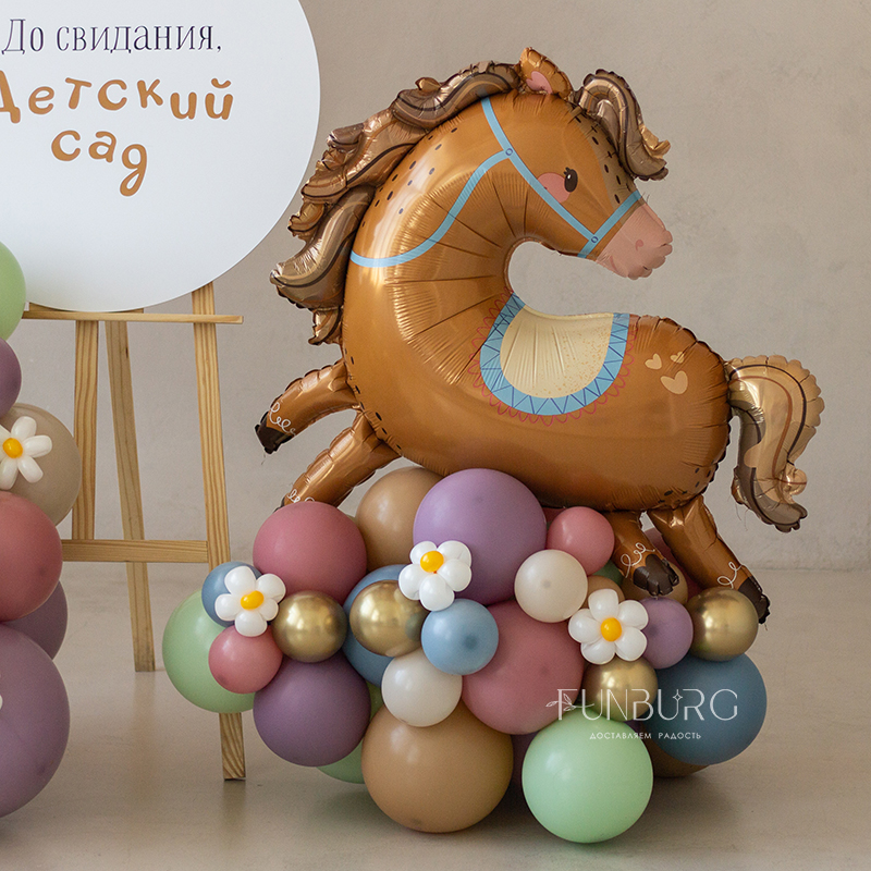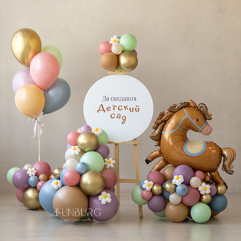 Стильная небольшая фотозона с мольбертом или комплексное оформление небольшого пространства! Этот набор элементов оформления, состоящий из мольберта с разнокалиберной гирляндой из шариков, кругом, на который можно нанести любую надпись, фонтаном из шаров на декоративном основании и фигурки с лошадкой идеально подходит для небольших оформлений (например, детского сада), домашних праздников и фотосессий.