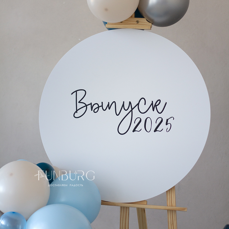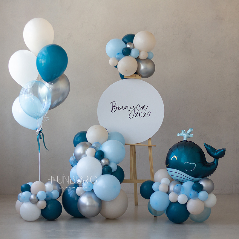 Стильная небольшая фотозона с мольбертом или комплексное оформление небольшого пространства! Этот набор элементов оформления, состоящий из мольберта с разнокалиберной гирляндой из шариков, кругом, на который можно нанести любую надпись, фонтаном из шаров на декоративном основании и и фигурки с китом идеально подходит для небольших оформлений (например, детского сада), домашних праздников и фотосессий.