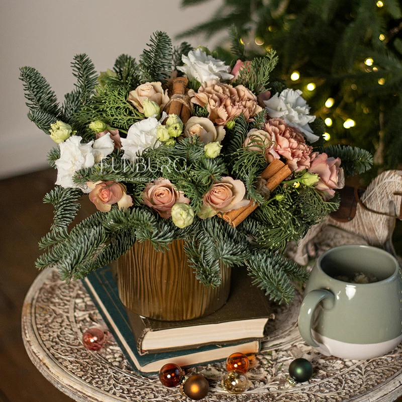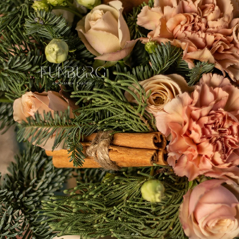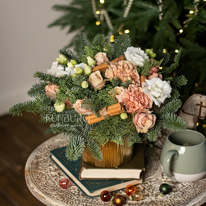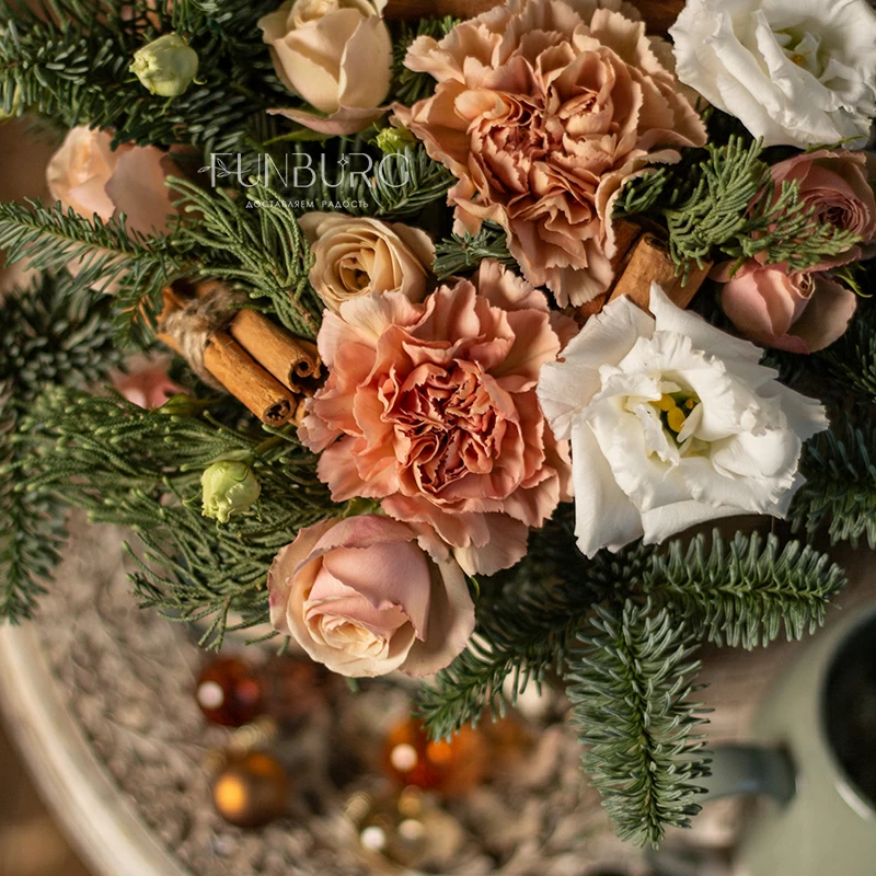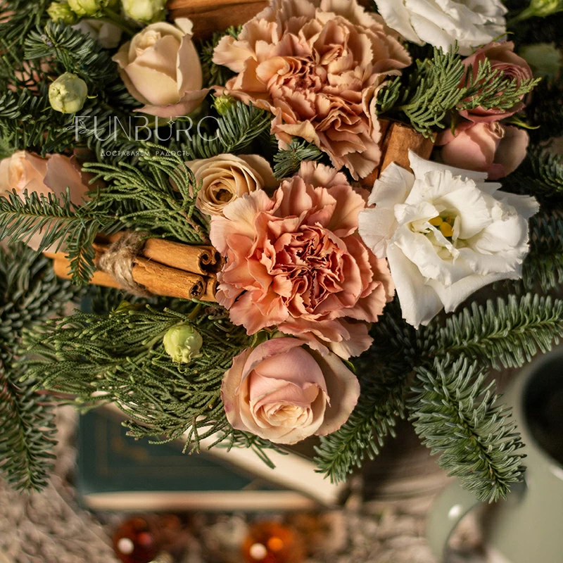 Уютная композиция в золотистом кашпо из воздушных эустом, карамельно-персиковых сортовых гвоздик, душистых палочек корицы, пудровых кустовых роз, окруженных пушистыми веточками ароматного нобилиса. Идеально для зимних цветочных подарков, способных создать особенное праздничное настроение, передать заботу и тепло.