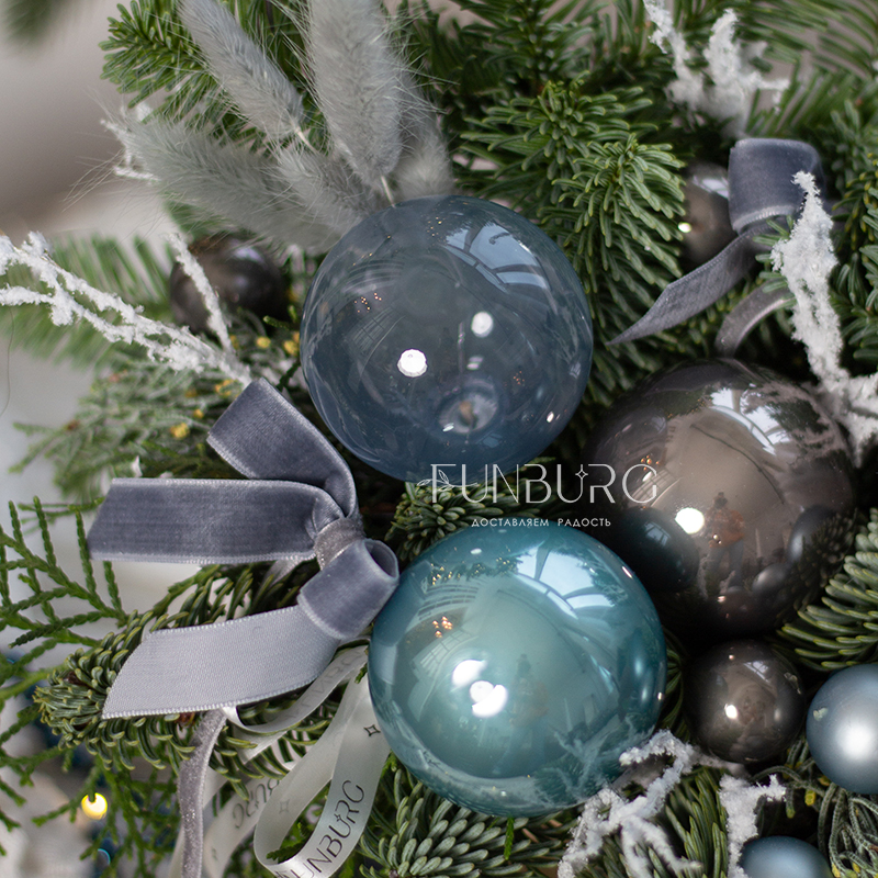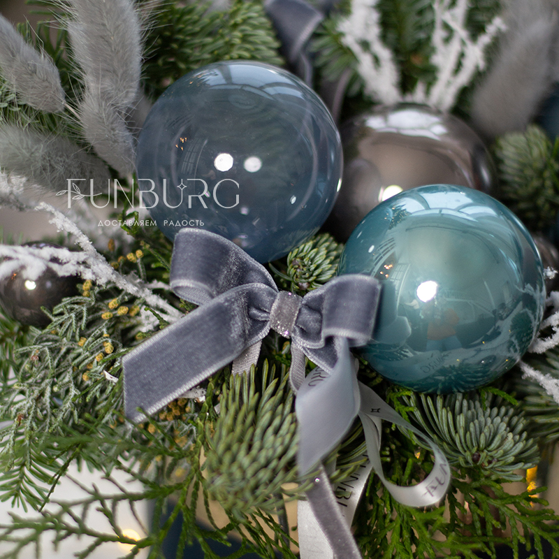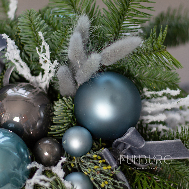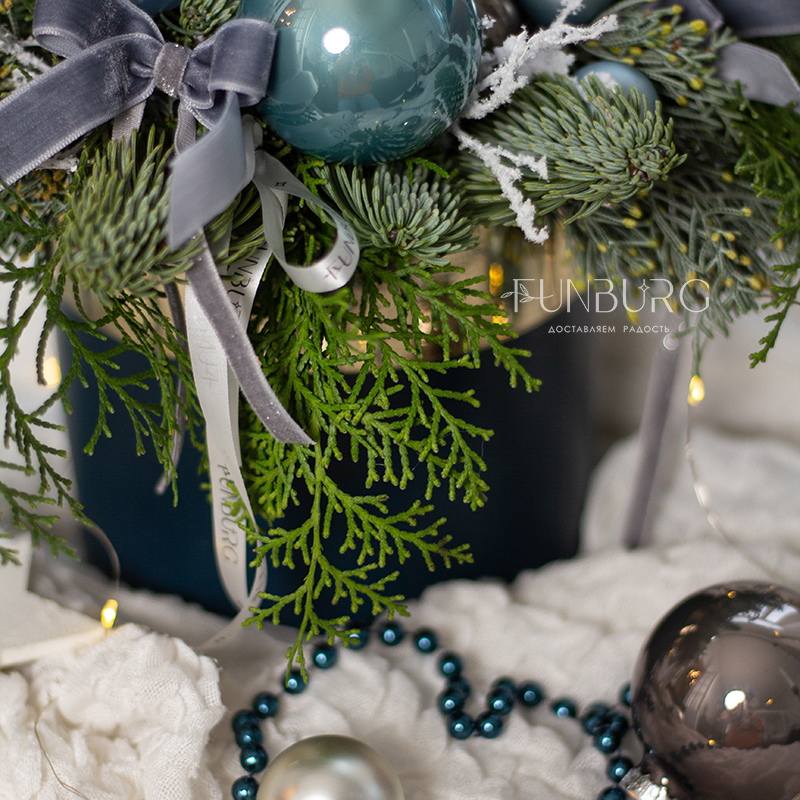 Завораживающая морозная композиция с ароматными еловыми веточками, пушистой туей, сверкающими и загадочными дымчато-голубыми и туманно-серебристыми елочными шариками, заснеженными веточками черничника, лагурусом и бантиками в красивом полуночно-синем матовом кашпо станет идеальным зимним цветочным подарком, украсит интерьер к зимним праздникам, подарит настроение и идеально дополнит украшением новогоднего стола.