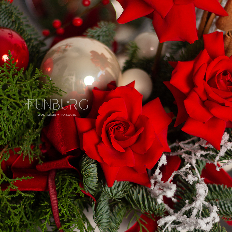 Яркая и сочная, праздничная композиция с алыми французскими розами Nina, яркими огоньками-ягодками илекса, ароматными еловыми веточками, пушистой туей, сверкающими елочными шариками, заснеженными веточками черничника и бантиками в контрастном белоснежном кашпо идеально подойдет для эффектного зимнего подарка, украшения праздничного стола и создания настроения дома!
