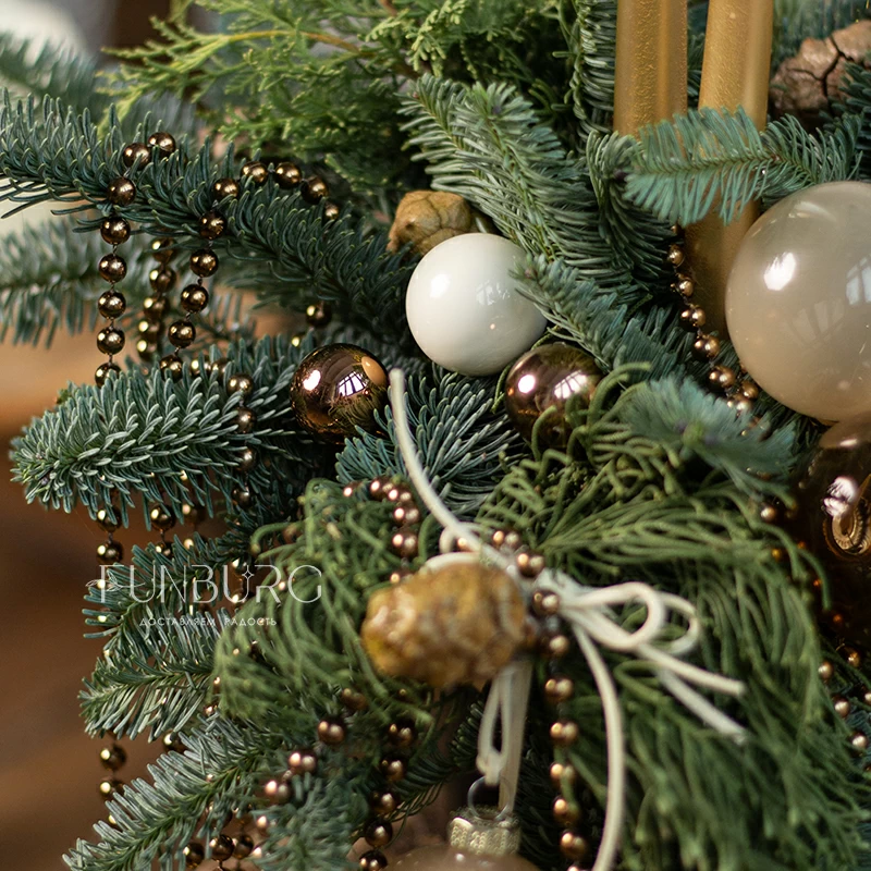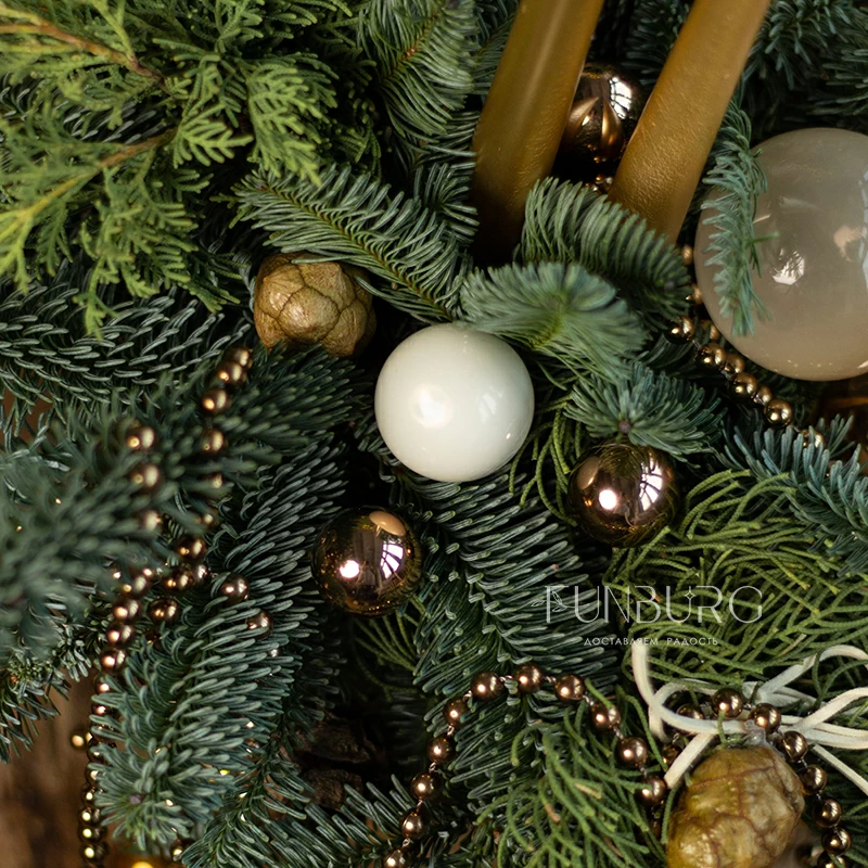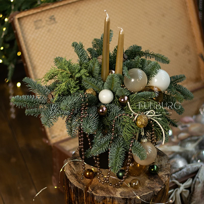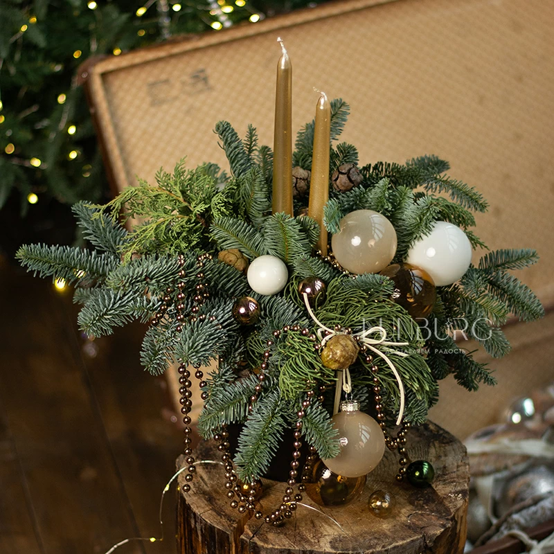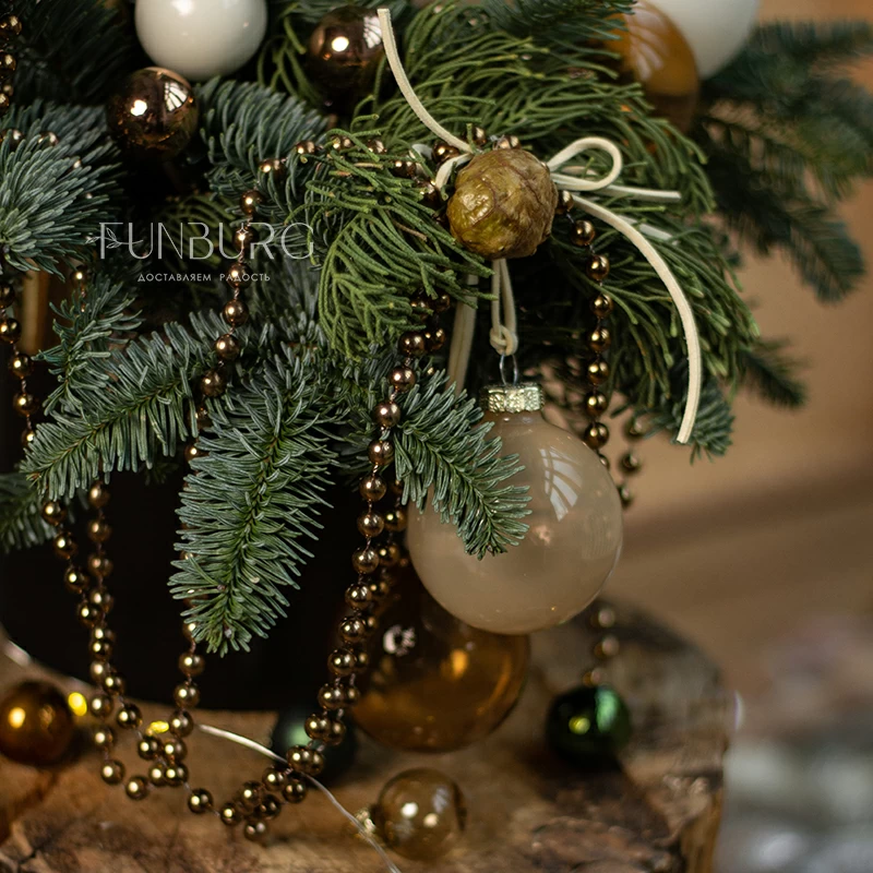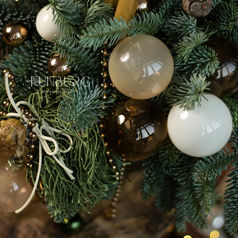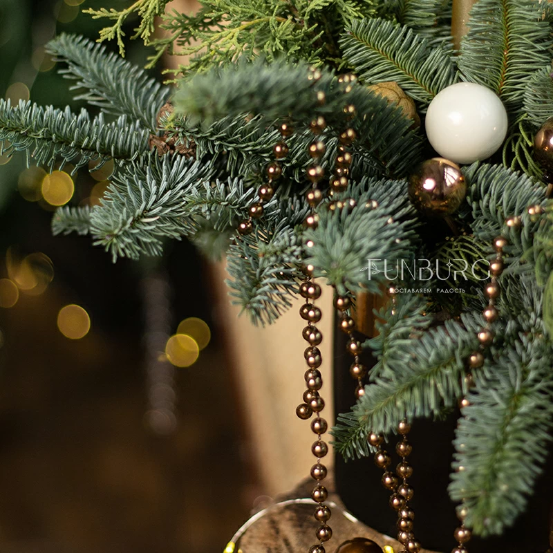 Композиция с ароматными еловыми веточками, пушистой туей, золотыми свечами, сверкающими елочными шариками цвета трюфеля, сливочных ирисок, карамельного капучино и сливочных ирисок, сверкающими бусами в красивом матовом кашпо с золотом станет идеальным зимним цветочным подарком, украсить интерьер к зимним праздникам, подарит настроение и идеально дополнит украшением новогоднего стола.