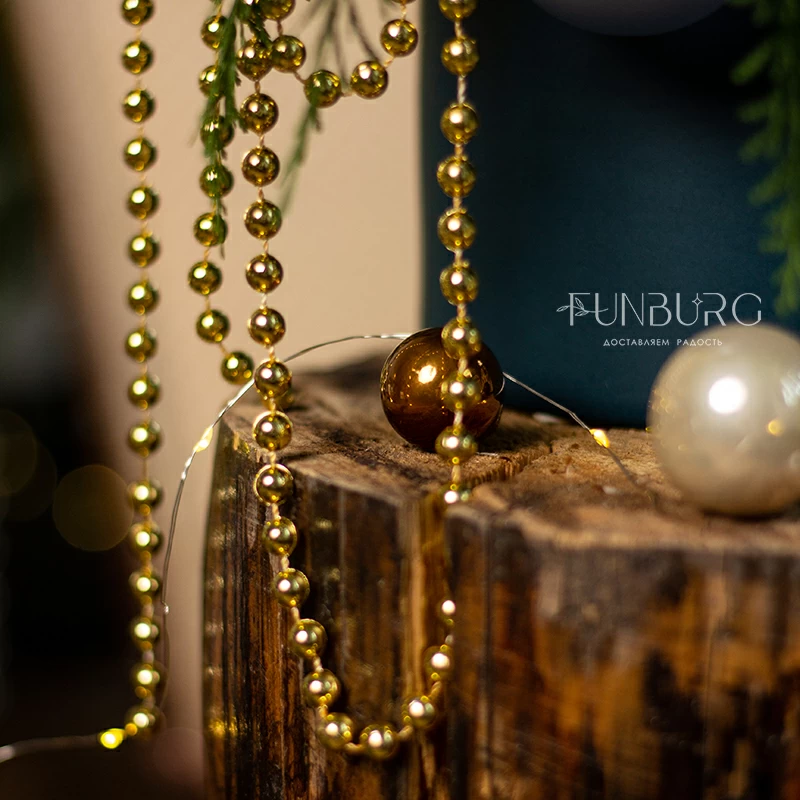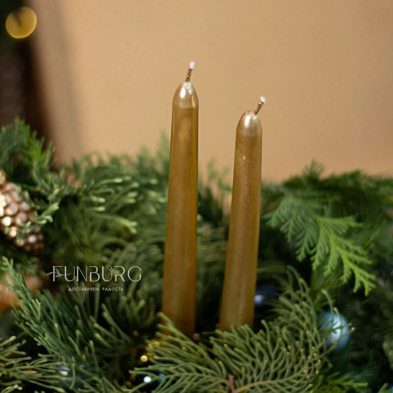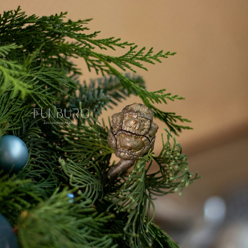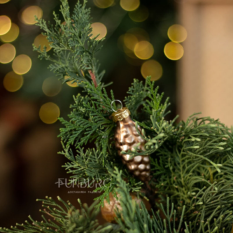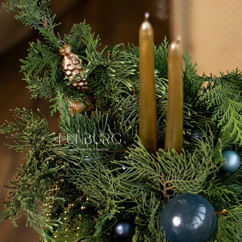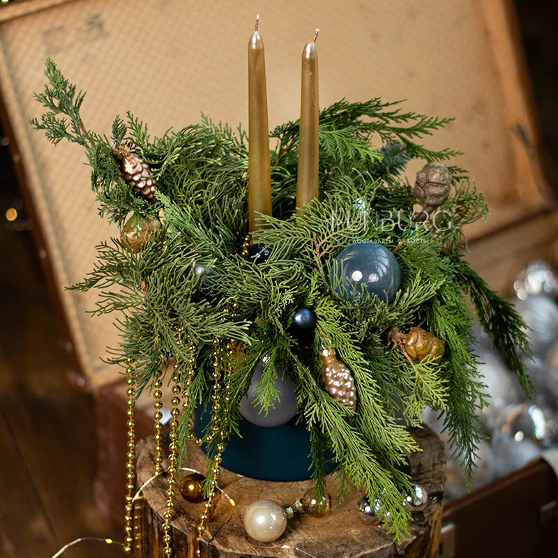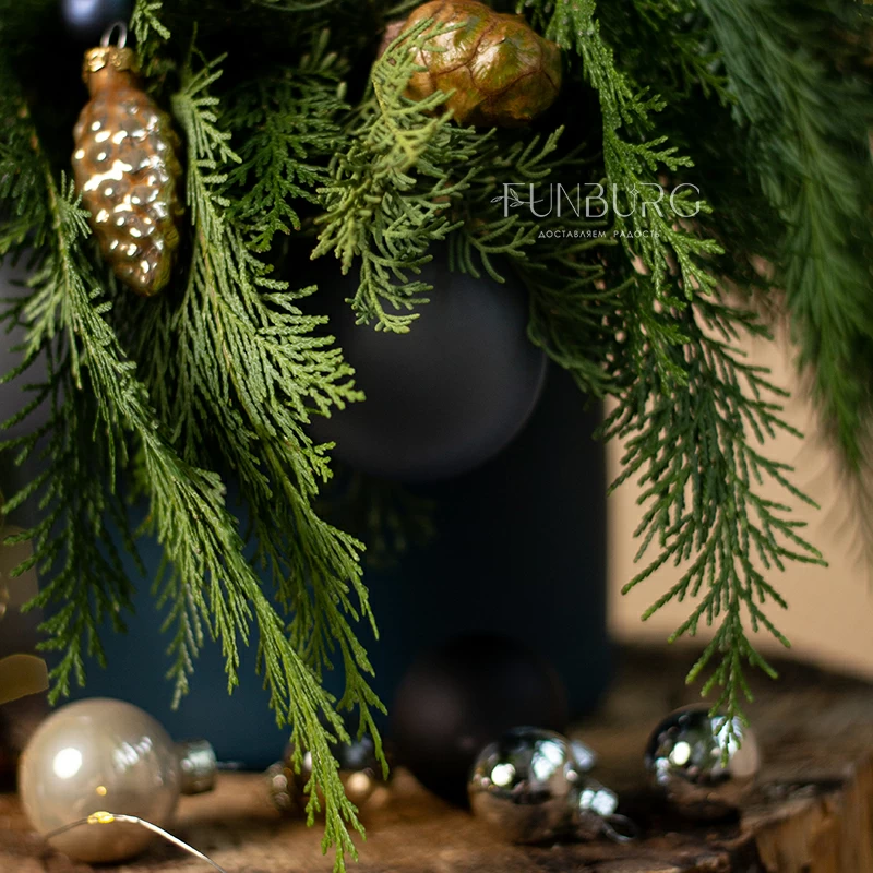 Композиция с ароматными еловыми веточками, пушистой туей, золотыми свечами, завораживающими, словно ледяными, елочными шариками, россыпью синих стеклянных шариков, игрушек в виде шишек и красивыми сверкающими бусами в полуночно-синем кашпо станет идеальным зимним цветочным подарком, украсить интерьер к зимним праздникам, подарит настроение и идеально дополнит украшением новогоднего стола.