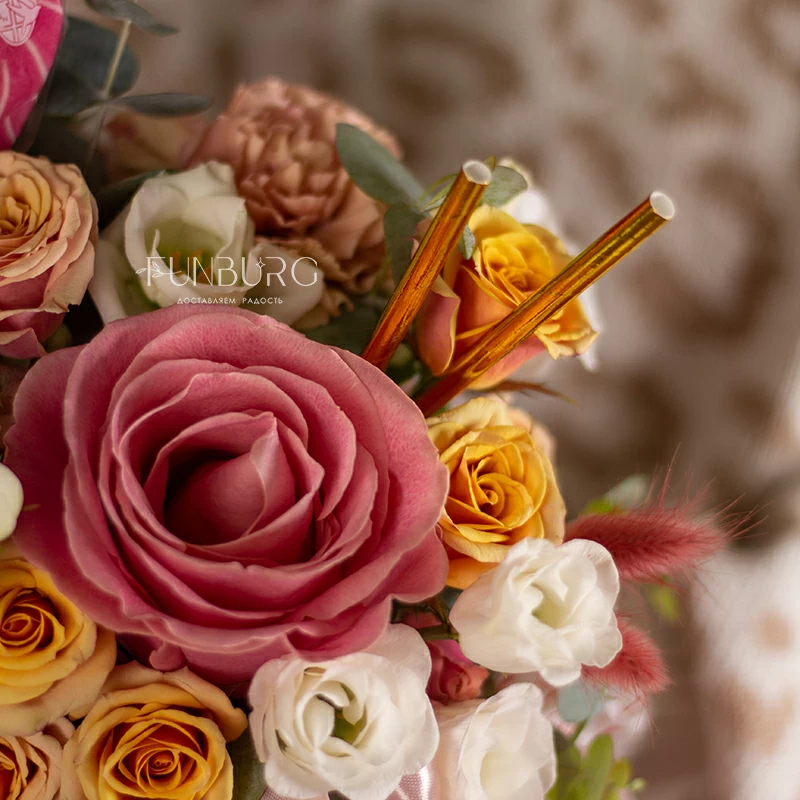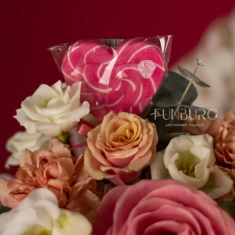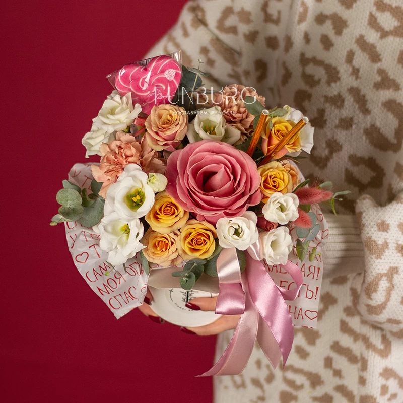 Необычное прочтение композиции для сюрпризов без повода, родственник всеми любимых стаканчиков с цветами, — стильная композиция в коробочке для WOK! В праздничную версию для любимых мы добавили леденец в форме сердечка, чтобы сюрприз был еще приятнее! Для нежных признаний и сюрпризов по поводу и без подойдет идеально!