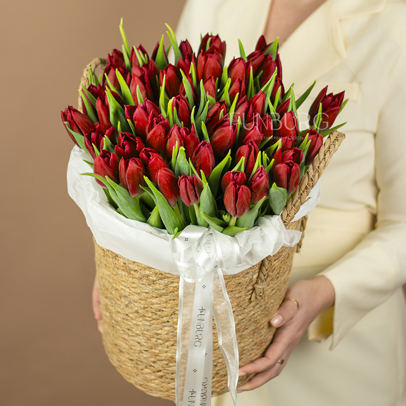 Роскошная стильная корзина насыщенно-красных тюльпанов - идеальный способ сделать эффектных весенний сюрприх особенному человеку!