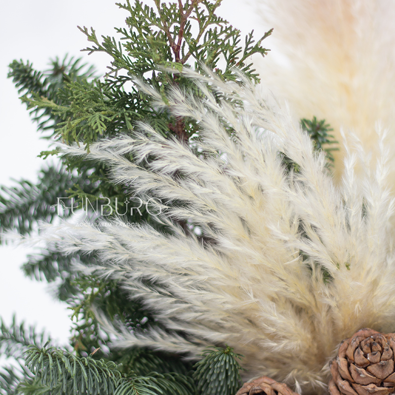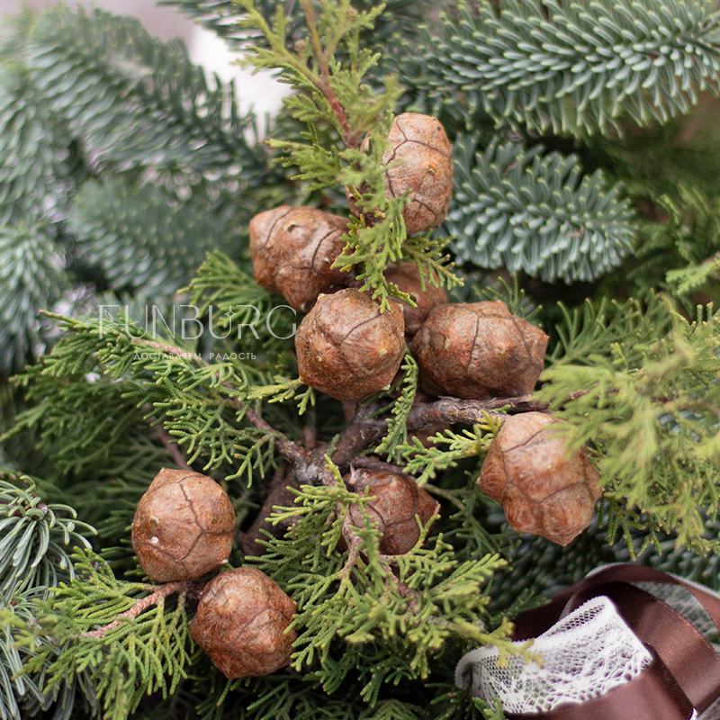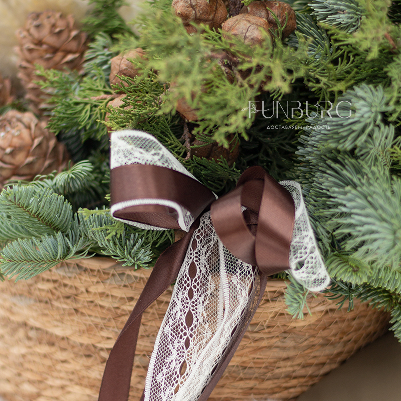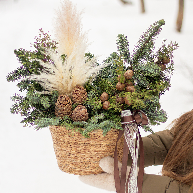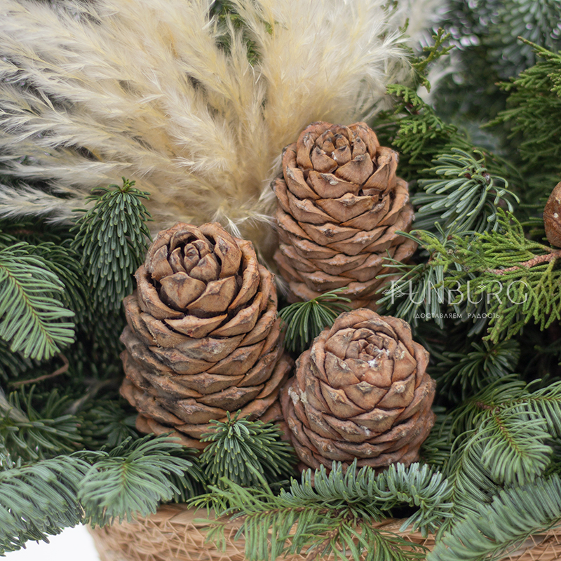 Наполненная уютом и природным волшебством корзина с пушистым ароматным нобилисом, раскидистыми веточками кипариса и туи, пушистой кортадерией и настоящими кедровыми шишками. Такая композиция мгновенно подарит новогоднее настроение, которого хватит на всю зиму!