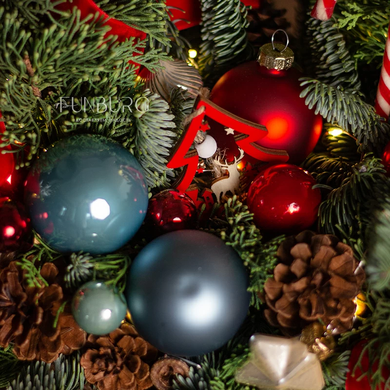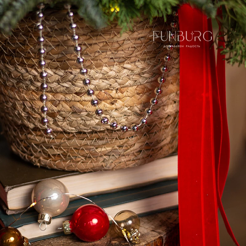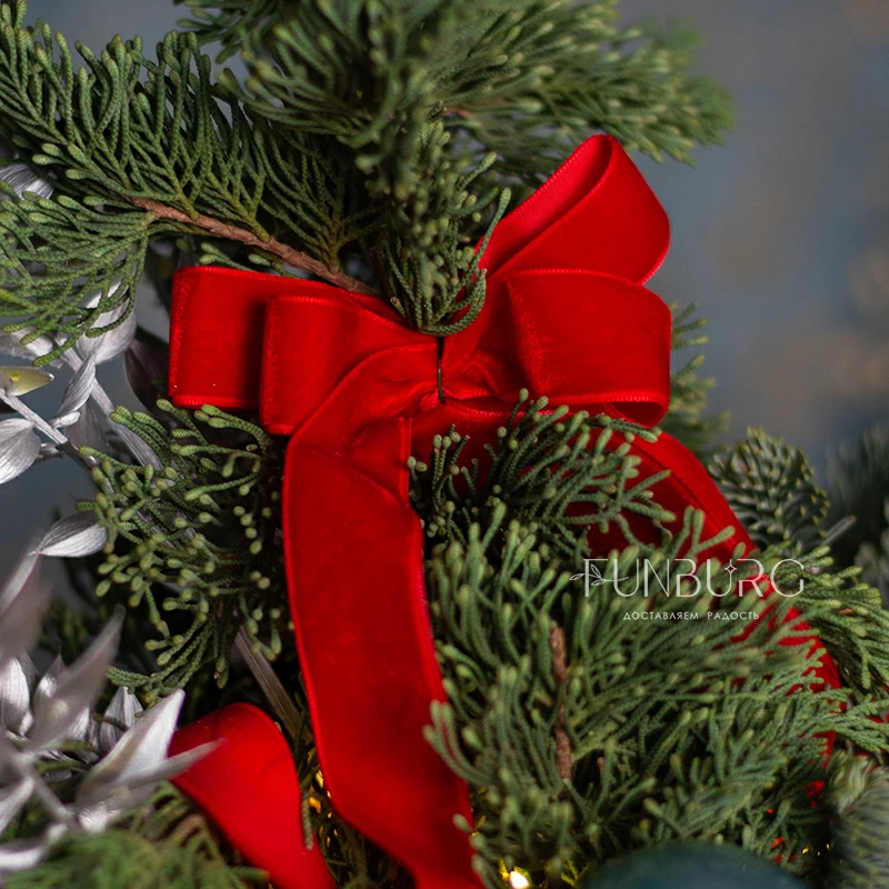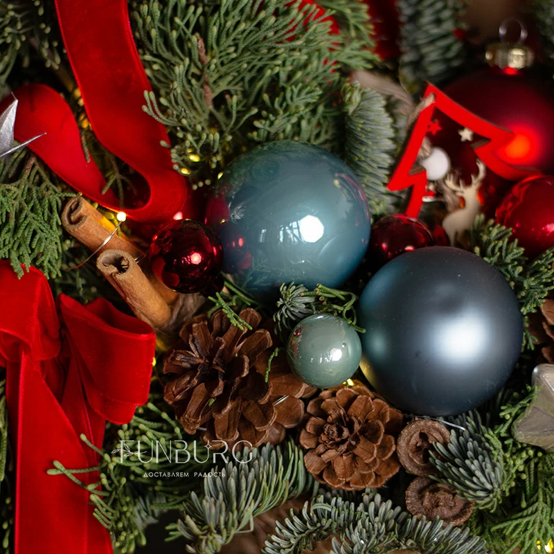 Искрящаяся праздником и предвкушением чудес корзина с пушистым ароматным нобилисом, раскидистыми веточками кипариса и туи, щедро украшенная стеклянными сверкающими елочными шариками, традиционными полосатыми леденцами, роскошными пышными бархатными бантами, бусами, шишками и светодиодной гирляндой. Такая композиция мгновенно подарит новогоднее настроение, которого хватит на всю зиму!