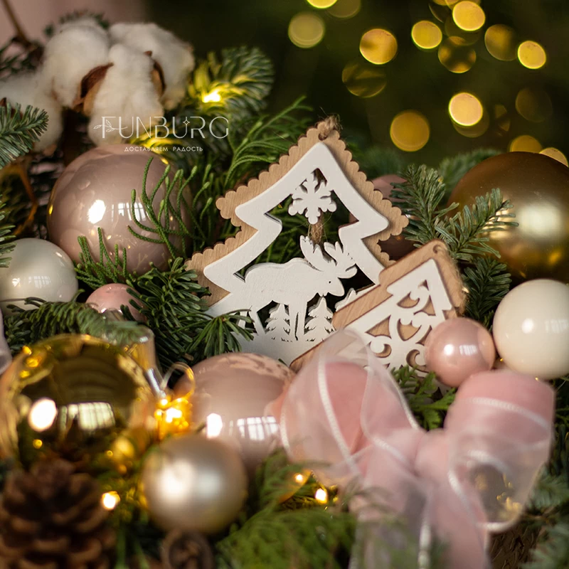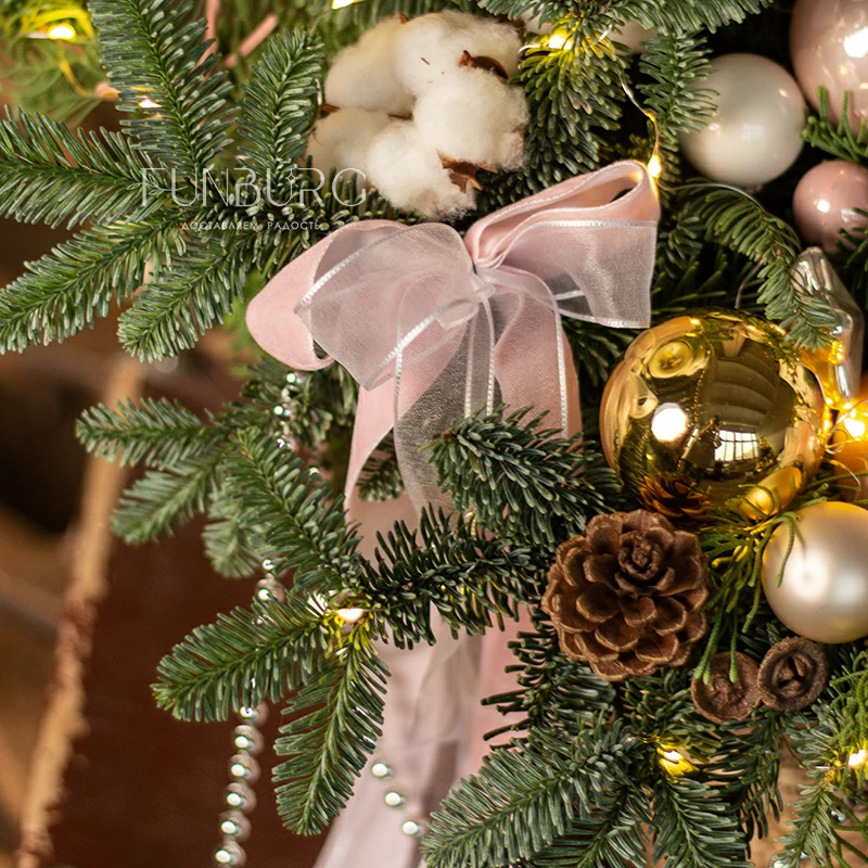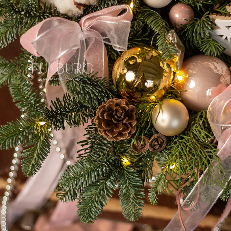 Объемная праздничная корзина с пушистым ароматным нобилисом, раскидистыми веточками кипариса и туи, щедро украшенная стеклянными сверкающими шариками нежно-розового, сливочного и золотого цвета, снежными деревянными игрушками, натуральными шишками, бархатными бантами, бусами и светодиодной гирляндой. Такая композиция мгновенно подарит новогоднее настроение, которого хватит на всю зиму!